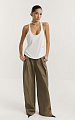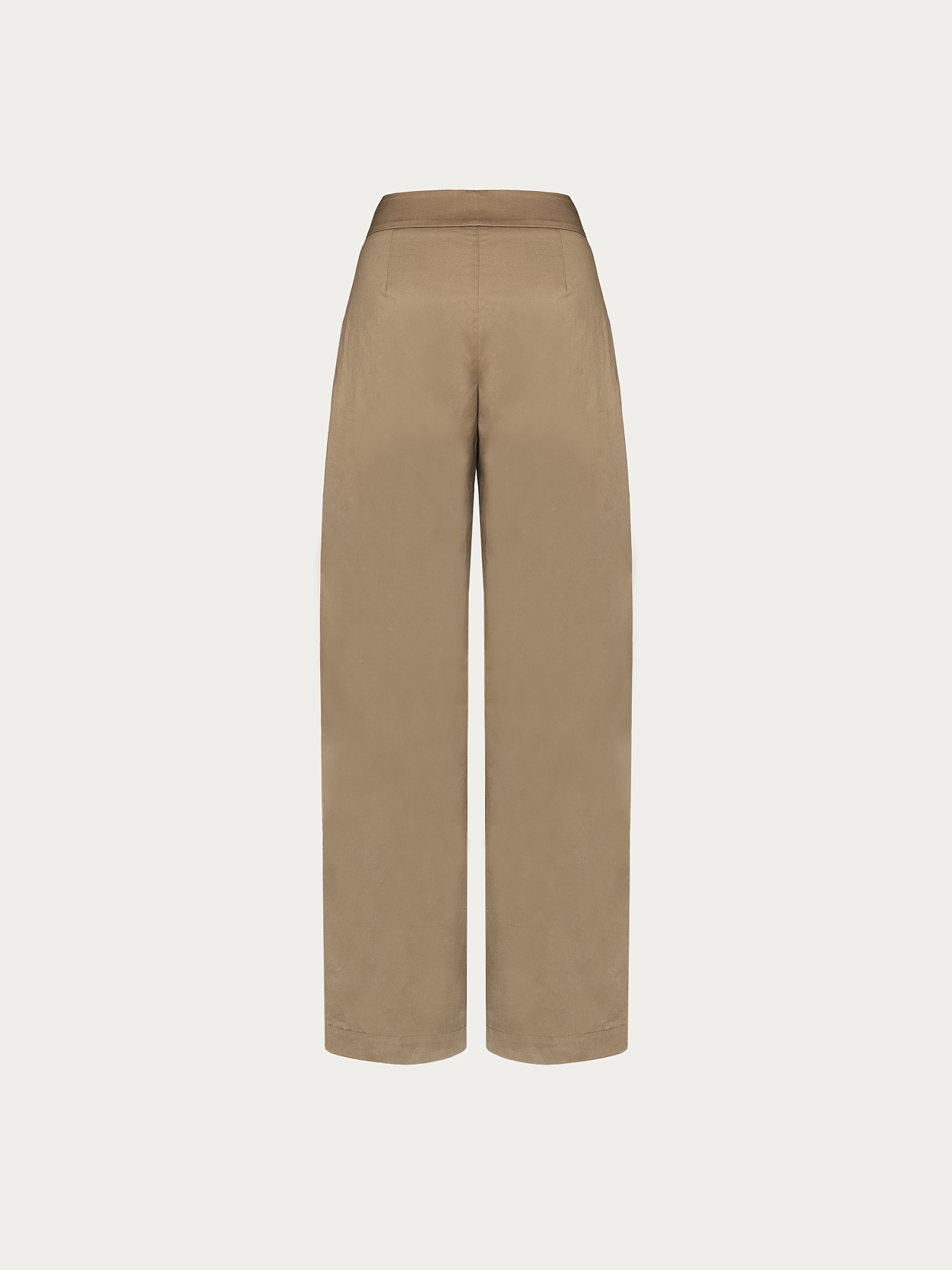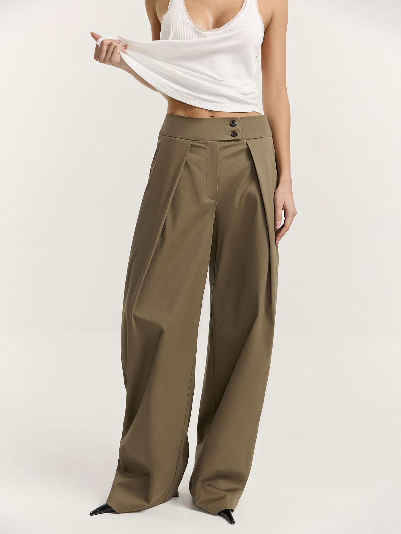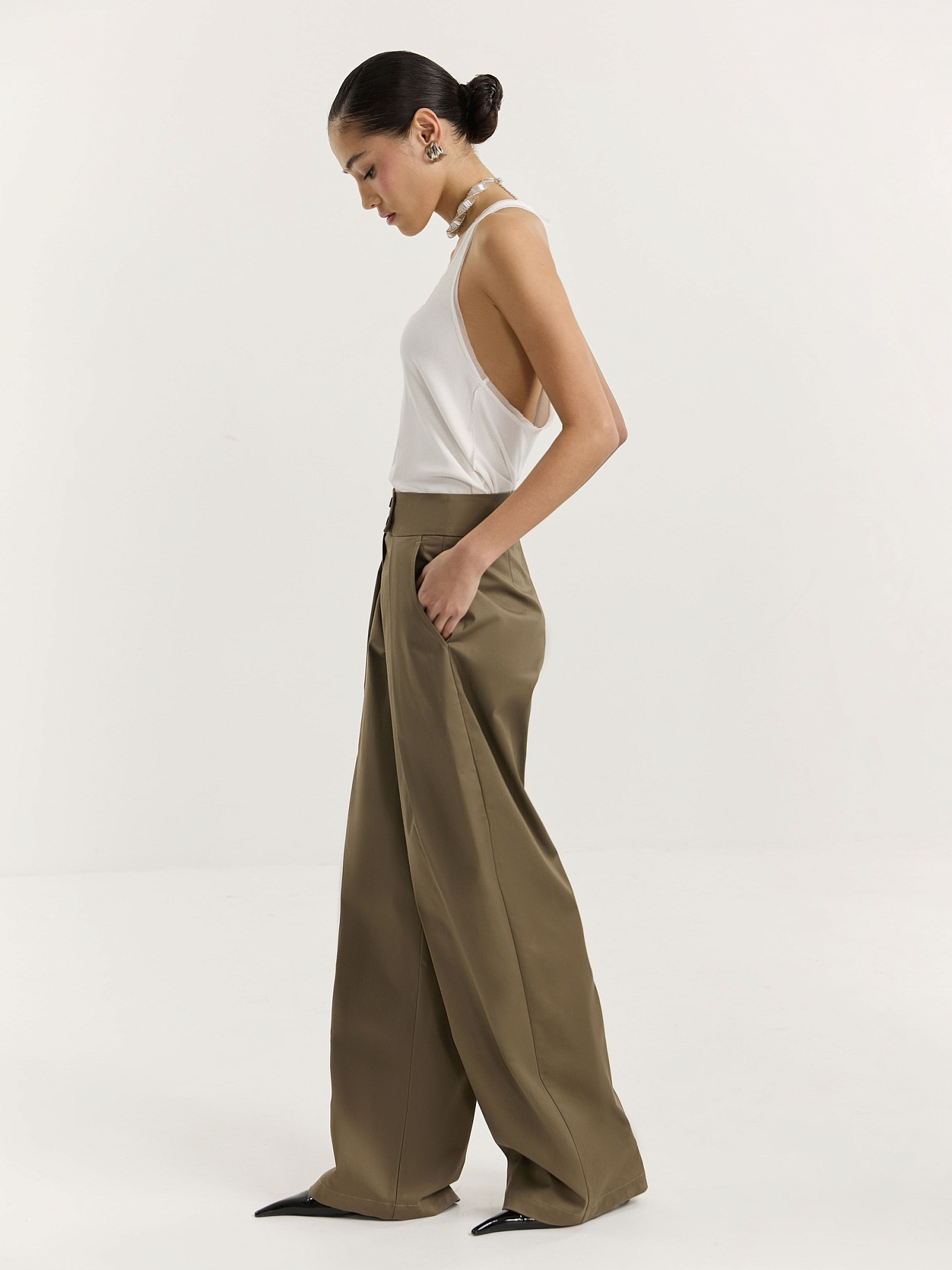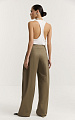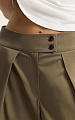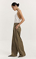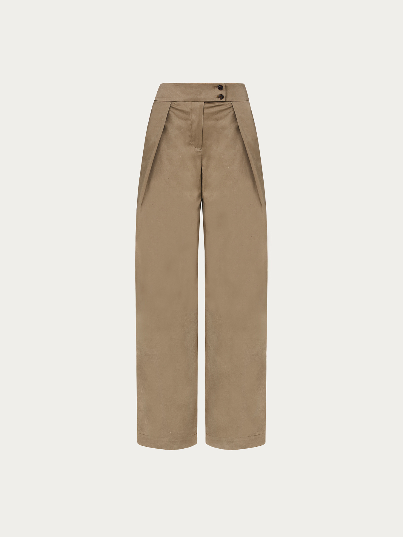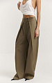 Брюки свободного кроя с округлой линией силуэта. Модель построена на контрасте архитектурного объема и точной посадки: глубокие складки по линии талии развернуты внутрь, благодаря чему формируется выразительная форма, остающаяся легкой и собранной.