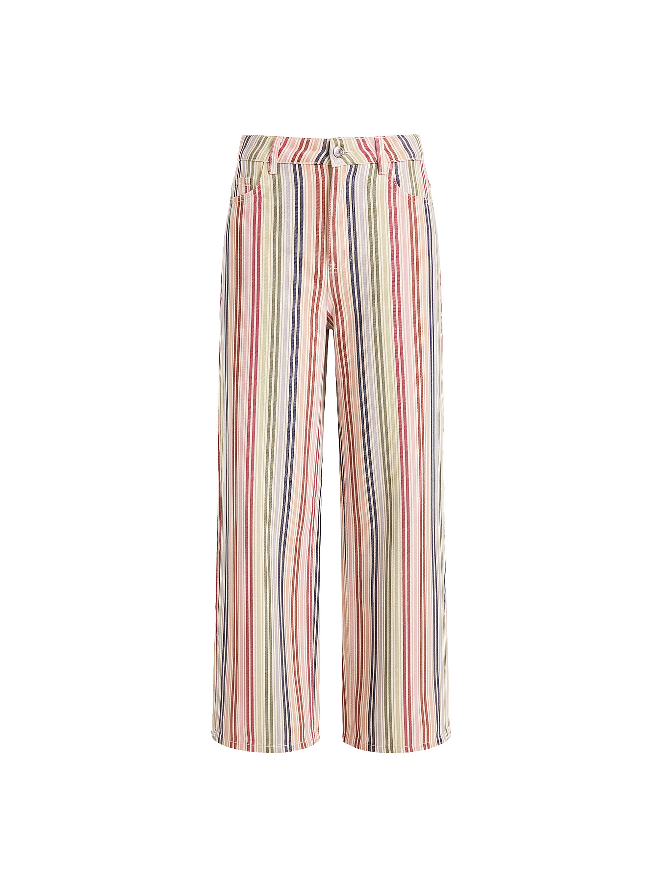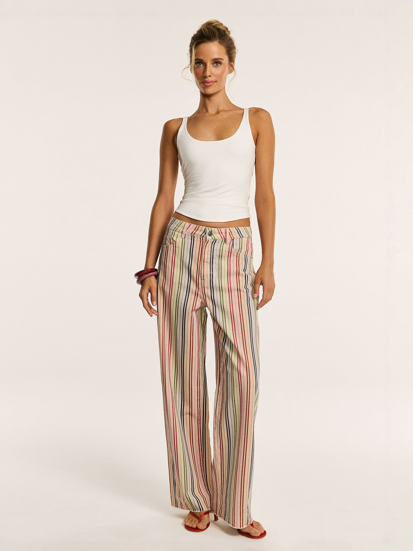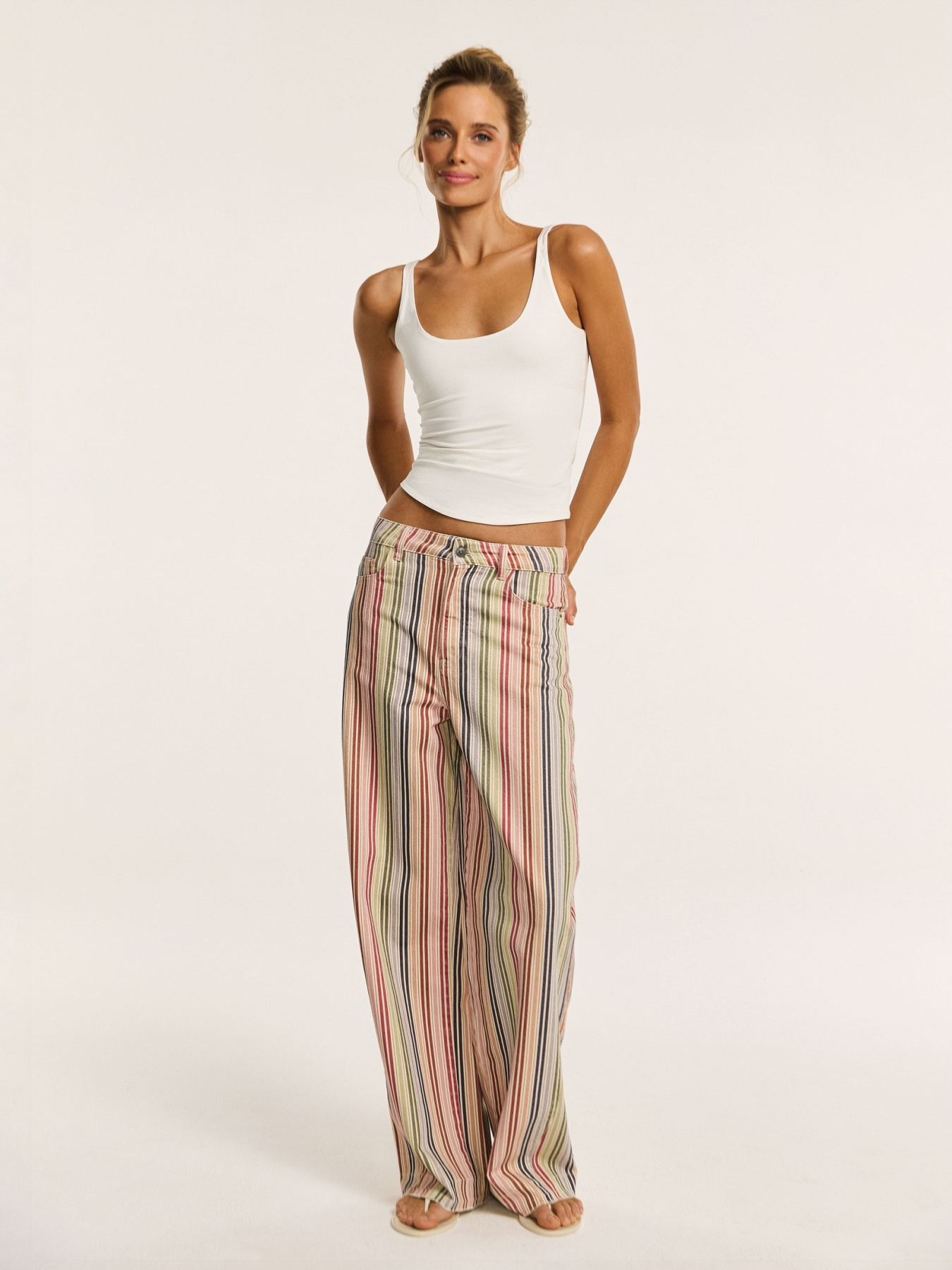 Джинсы прямого объёмного кроя в многоцветную полоску — модель, которая отсылает к главной идее коллекции: полоса как символ Капри.