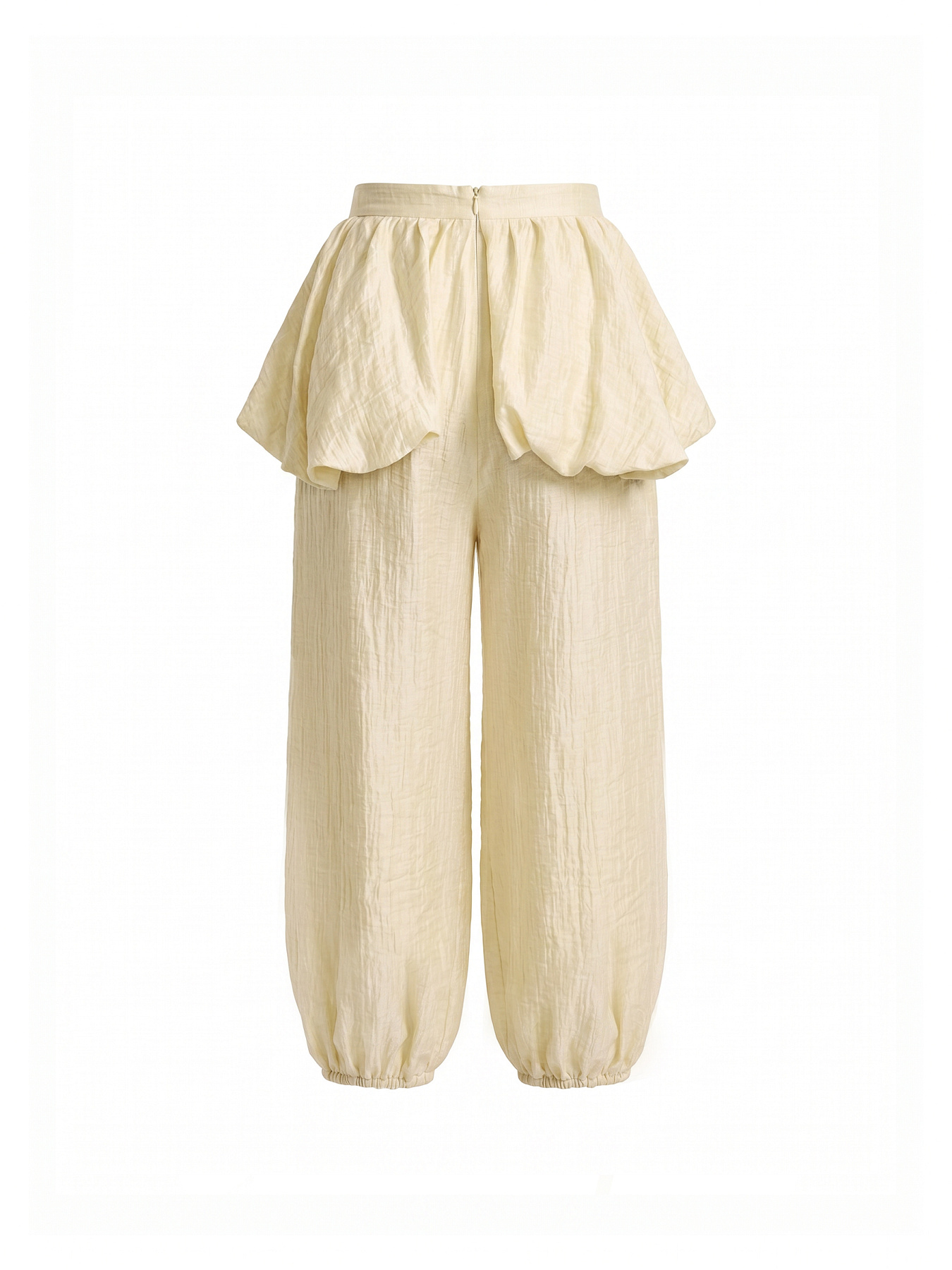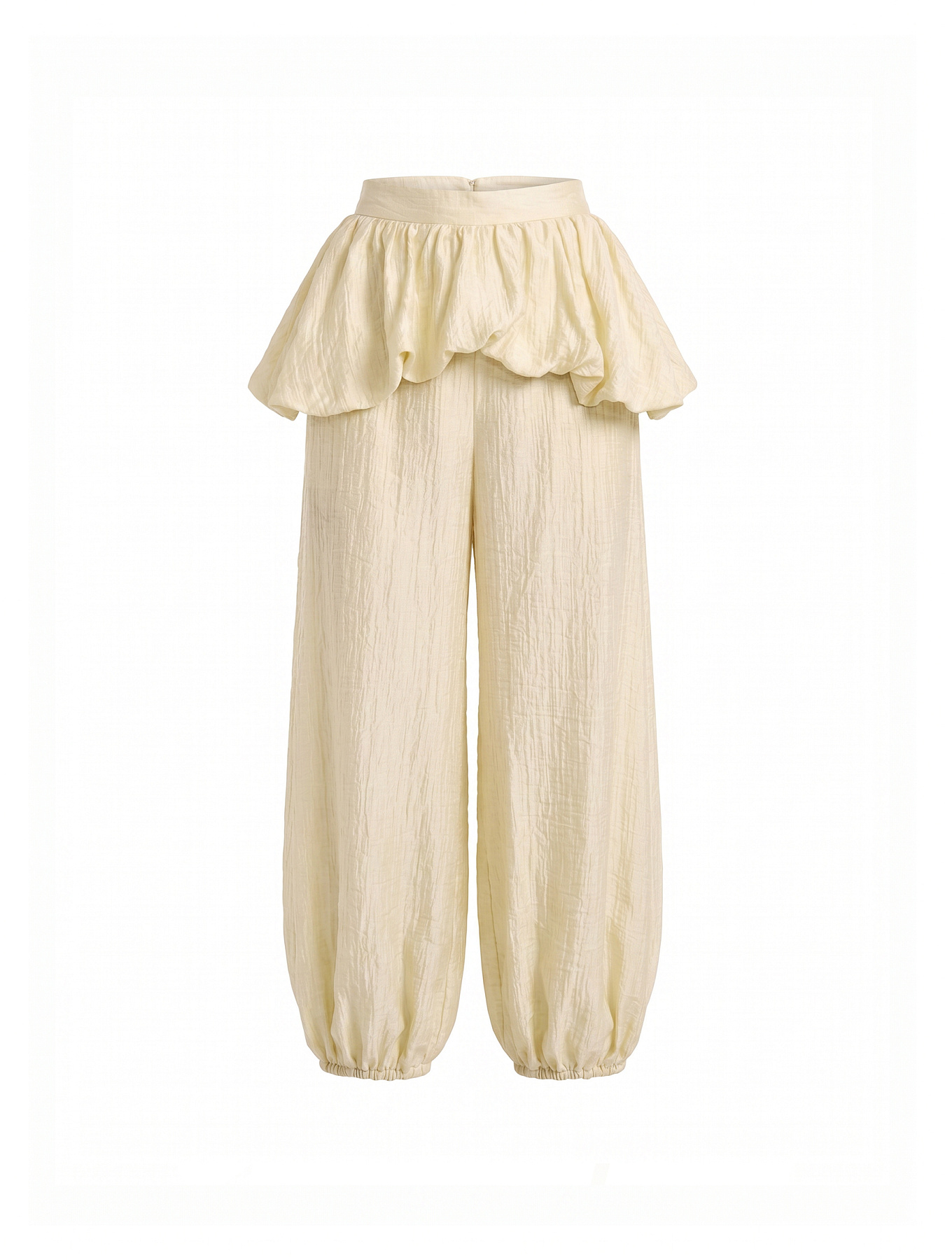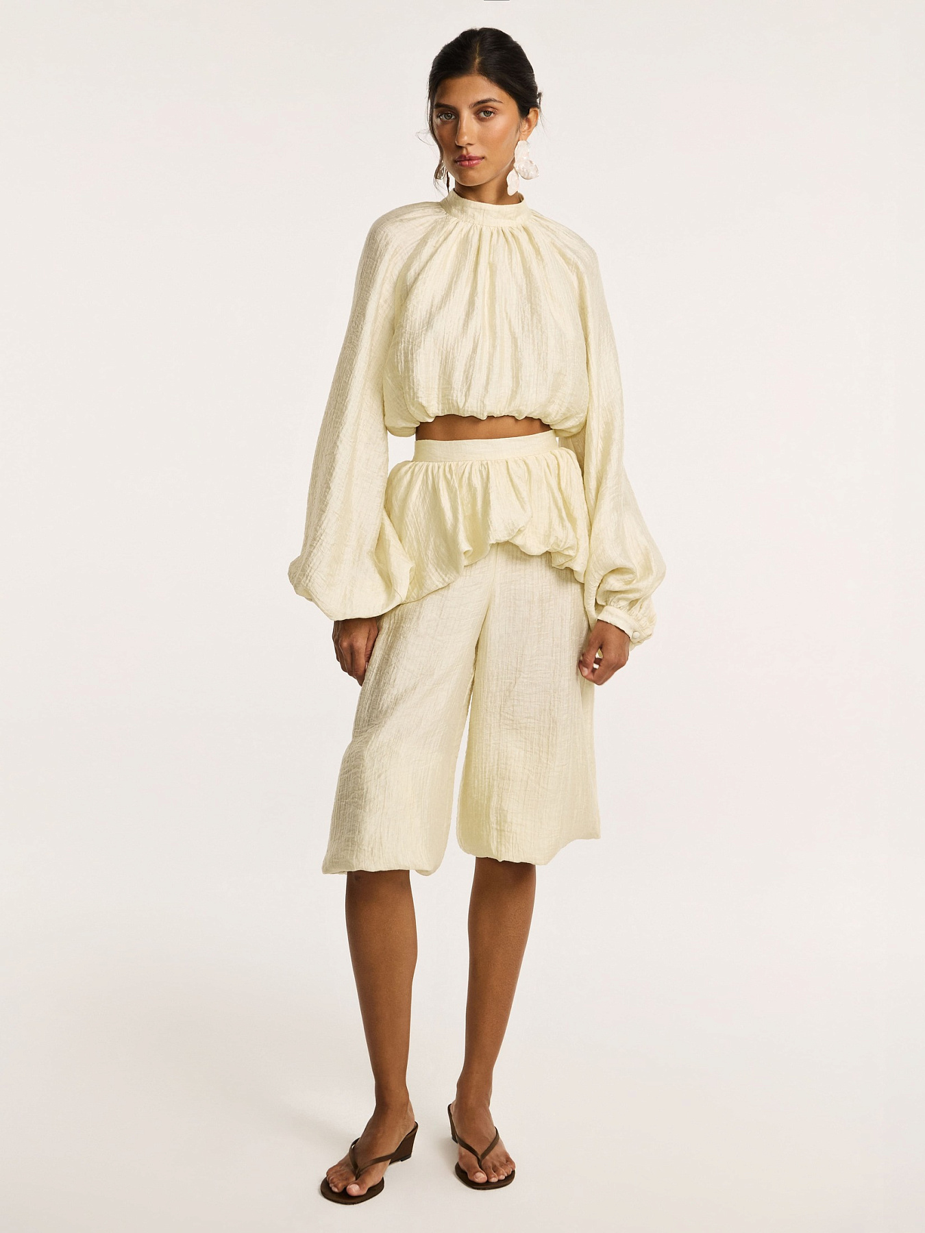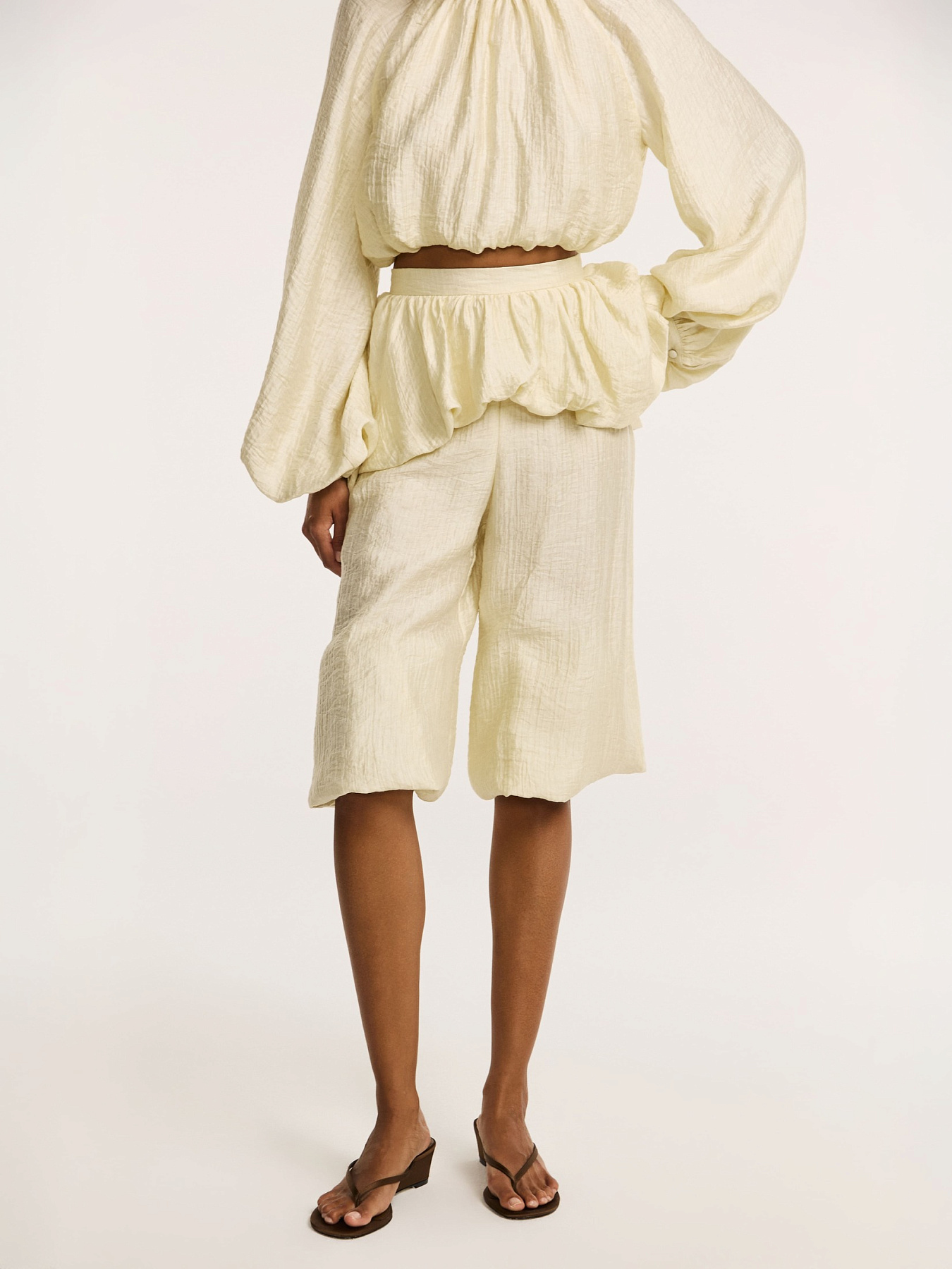 Укороченные шаровары из фактурной итальянской вискозы с тенселем в глубоком сливочном оттенке — выразительная модель с акцентом на объем и сложную фактуру.