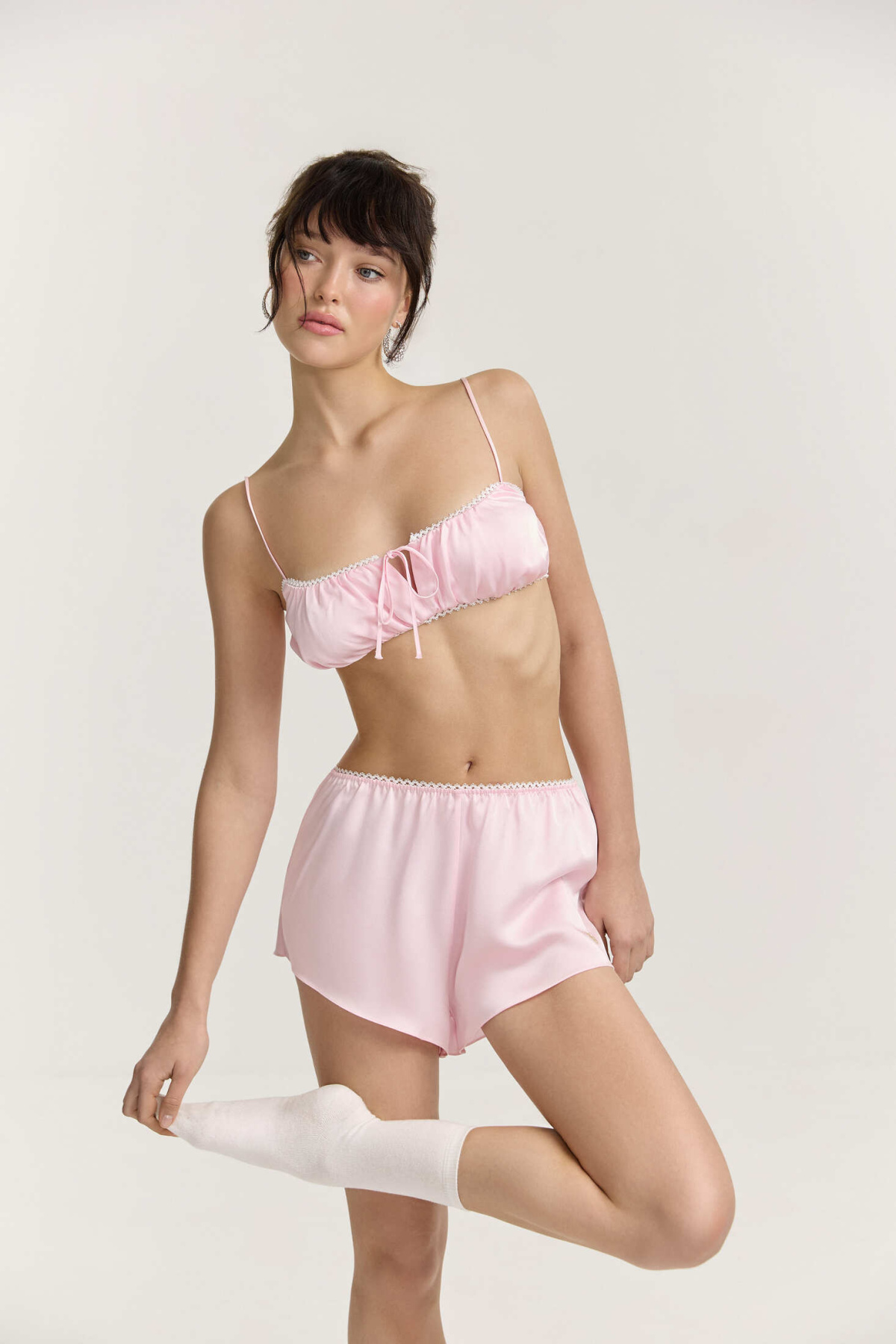 Шорты из итальянской вискозной кади в нежно-розовом оттенке. Свободный крой и укороченная длина создают легкий, расслабленный силуэт. Верхний срез собран в мелкую сборку на аккуратную ажурную резинку, которая мягко фиксирует посадку.