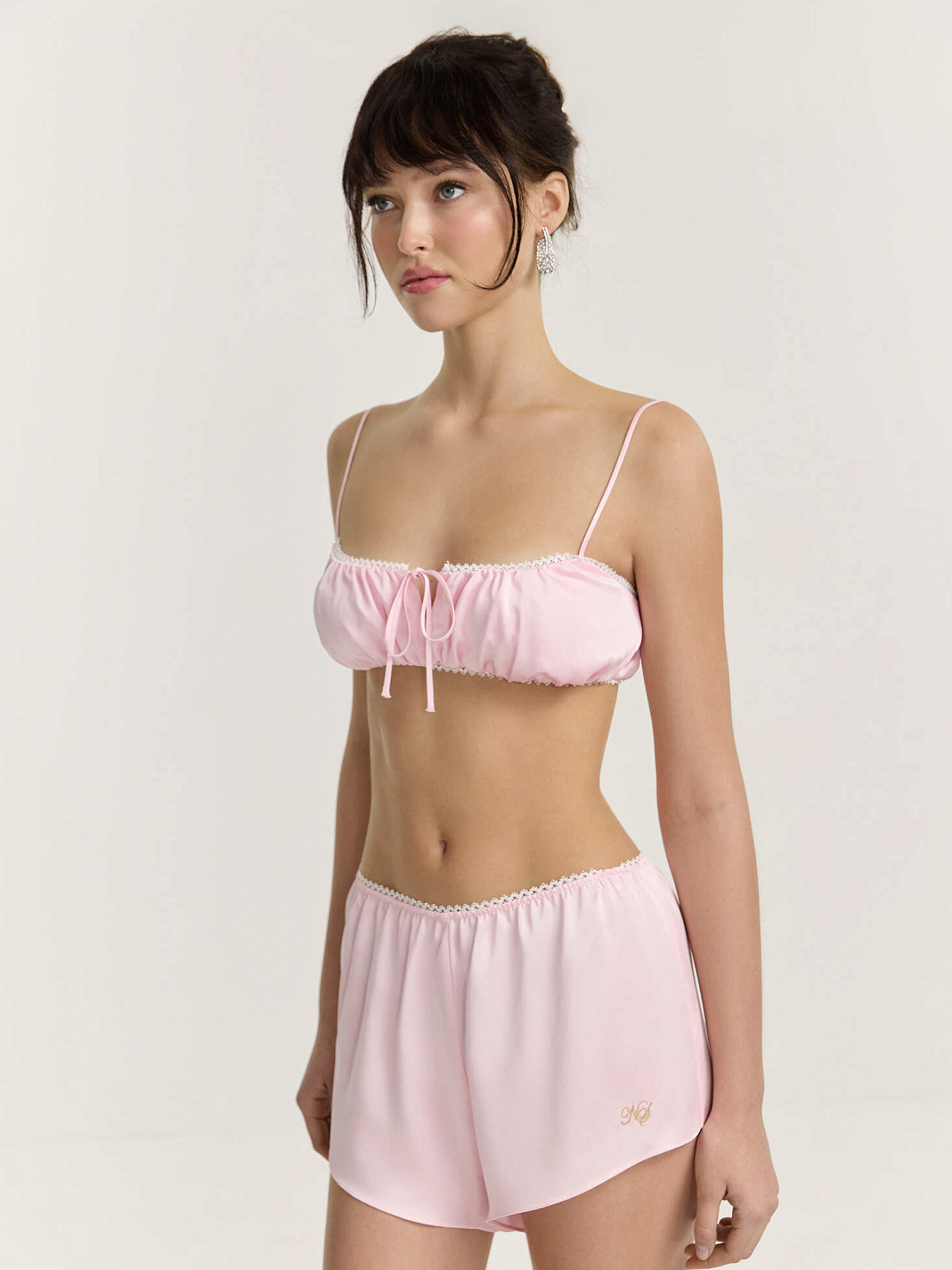 Шорты из итальянской вискозной кади в нежно-розовом оттенке. Свободный крой и укороченная длина создают легкий, расслабленный силуэт. Верхний срез собран в мелкую сборку на аккуратную ажурную резинку, которая мягко фиксирует посадку.