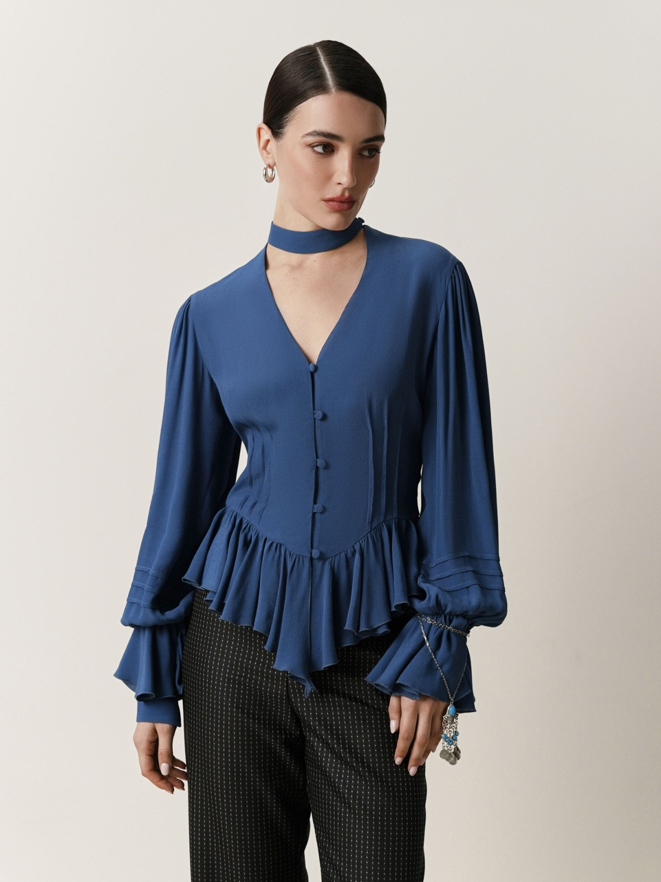 — Воланы и диагональные линии кроя — Объемные рукава с манжетами и декоративными складками