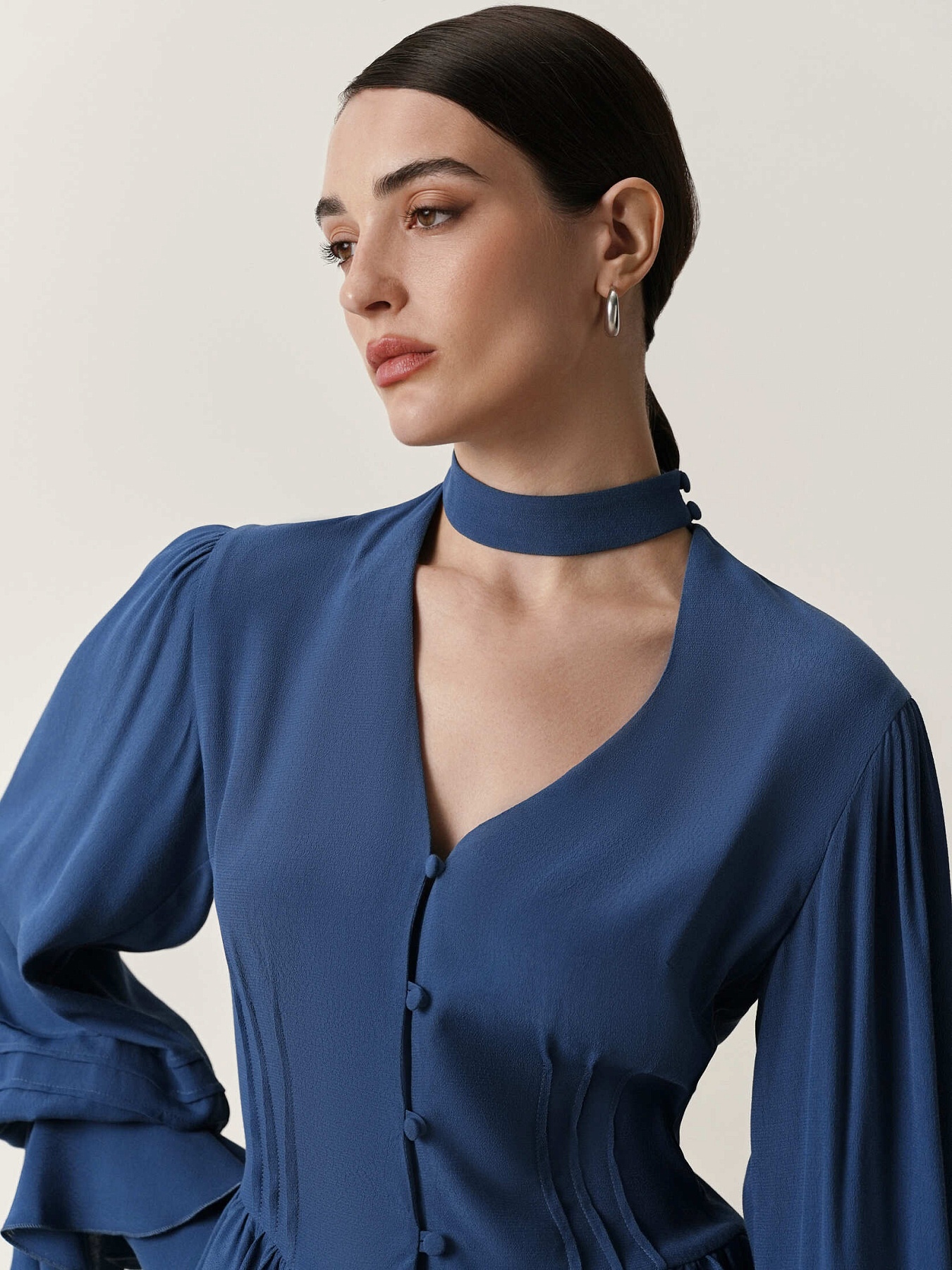 — Воланы и диагональные линии кроя — Объемные рукава с манжетами и декоративными складками