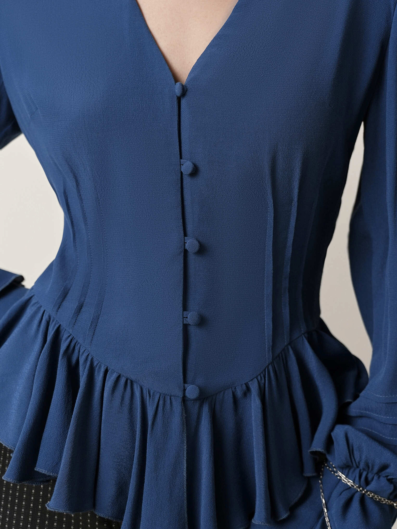 Полуприлегающий силуэт формируется за счет вытачек, застроченных на лицевую сторону, а отрезная линия талии, расположенная под углом, визуально удлиняет силуэт. От этой линии начинается широкий волан, повторяющий диагональ кроя. На рукавах — аккуратные горизонтальные складки, создающие игру фактур. Застёжка выполнена на обтяжные пуговицы и навесные петли.