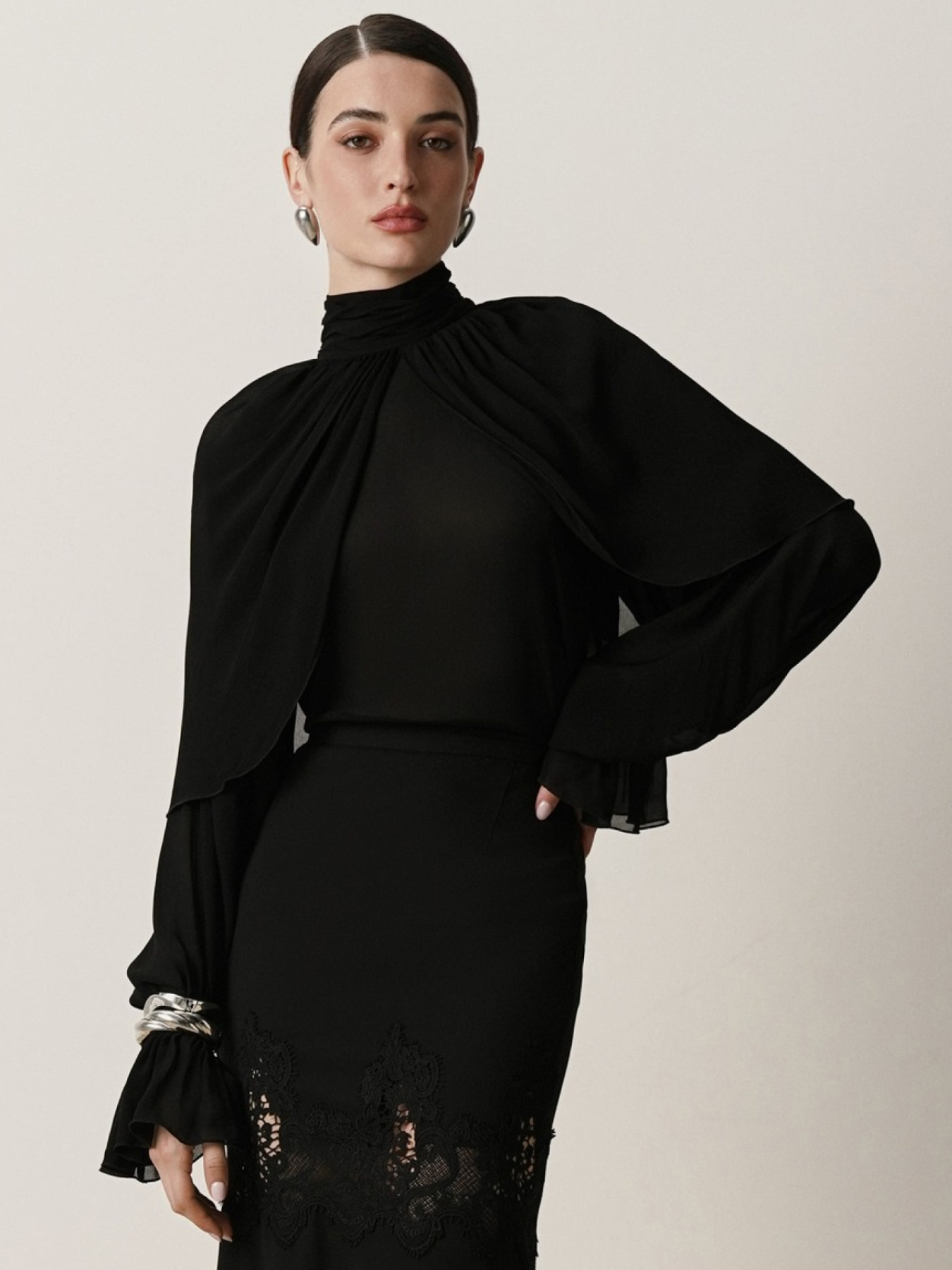 Блуза объемного кроя из итальянского шифона. Свободный силуэт формируется сборкой по линии горловины и расширяющимся кроем от груди, придающим легкость и плавное движение ткани.