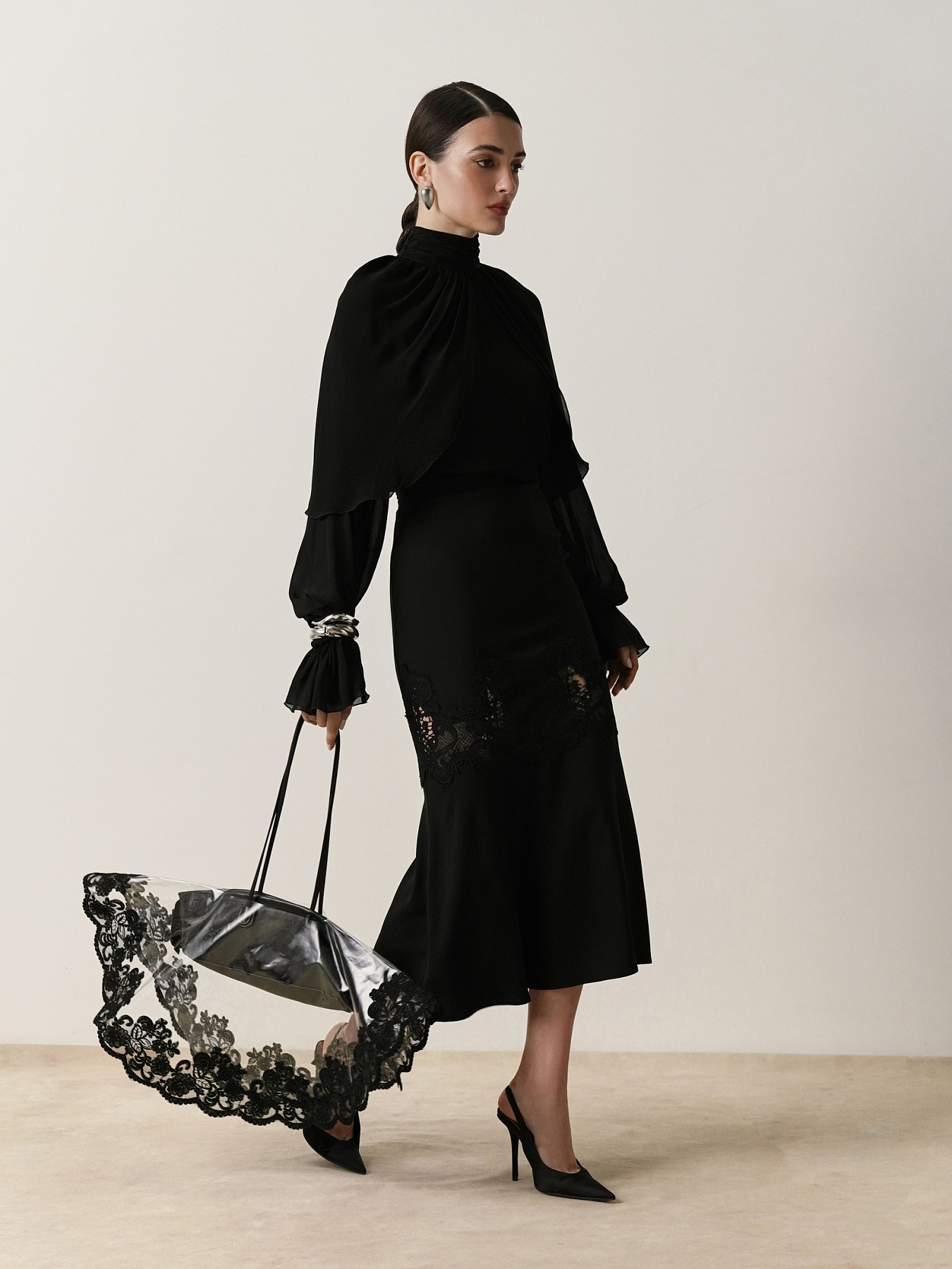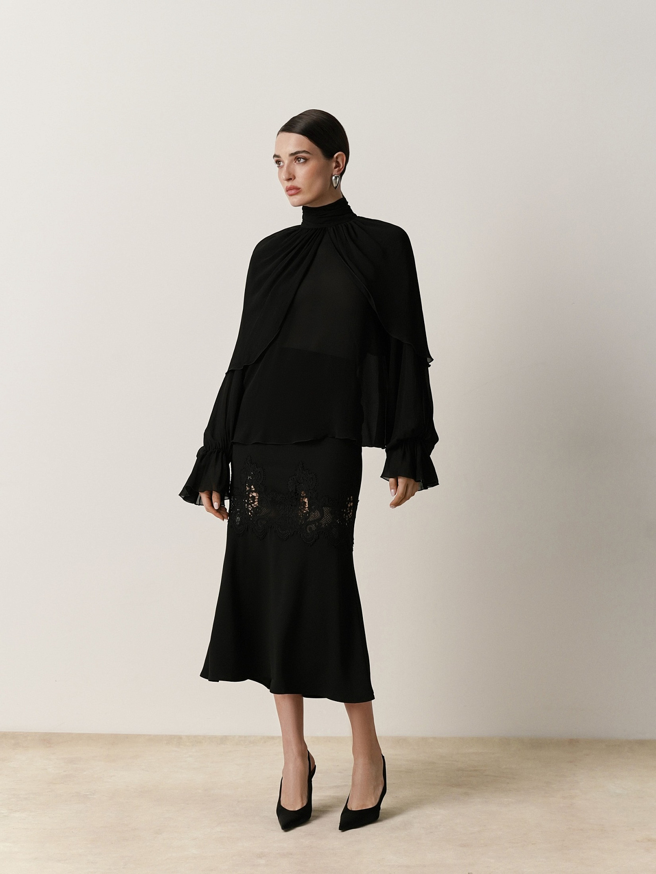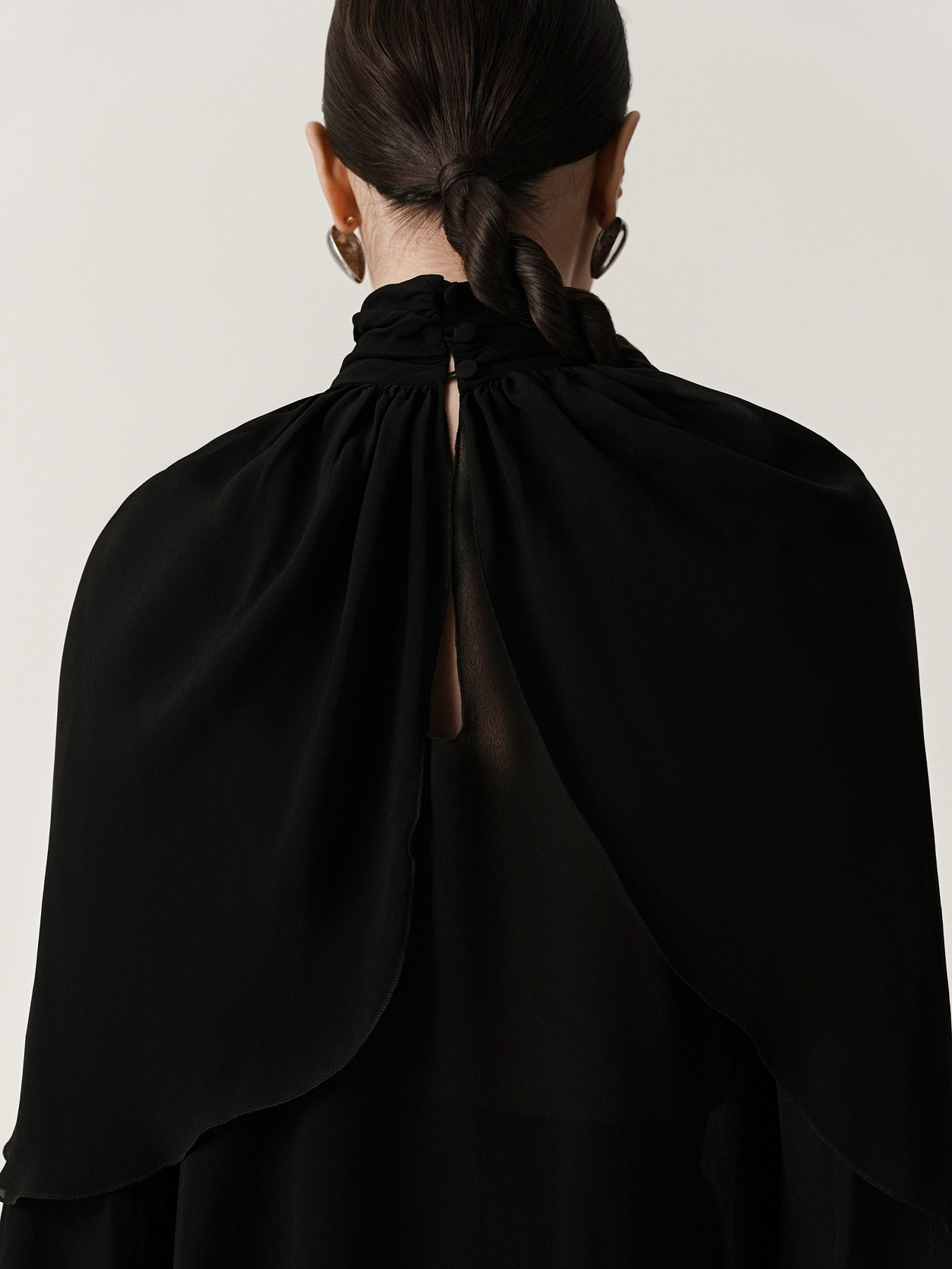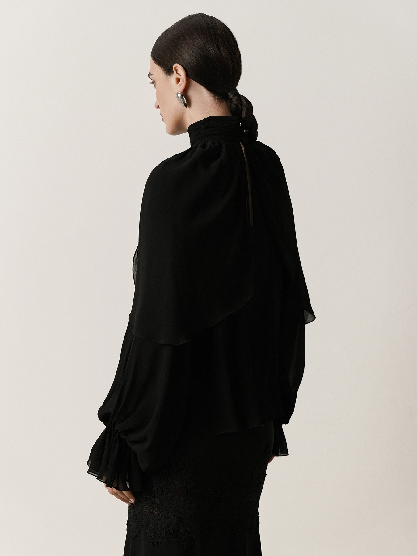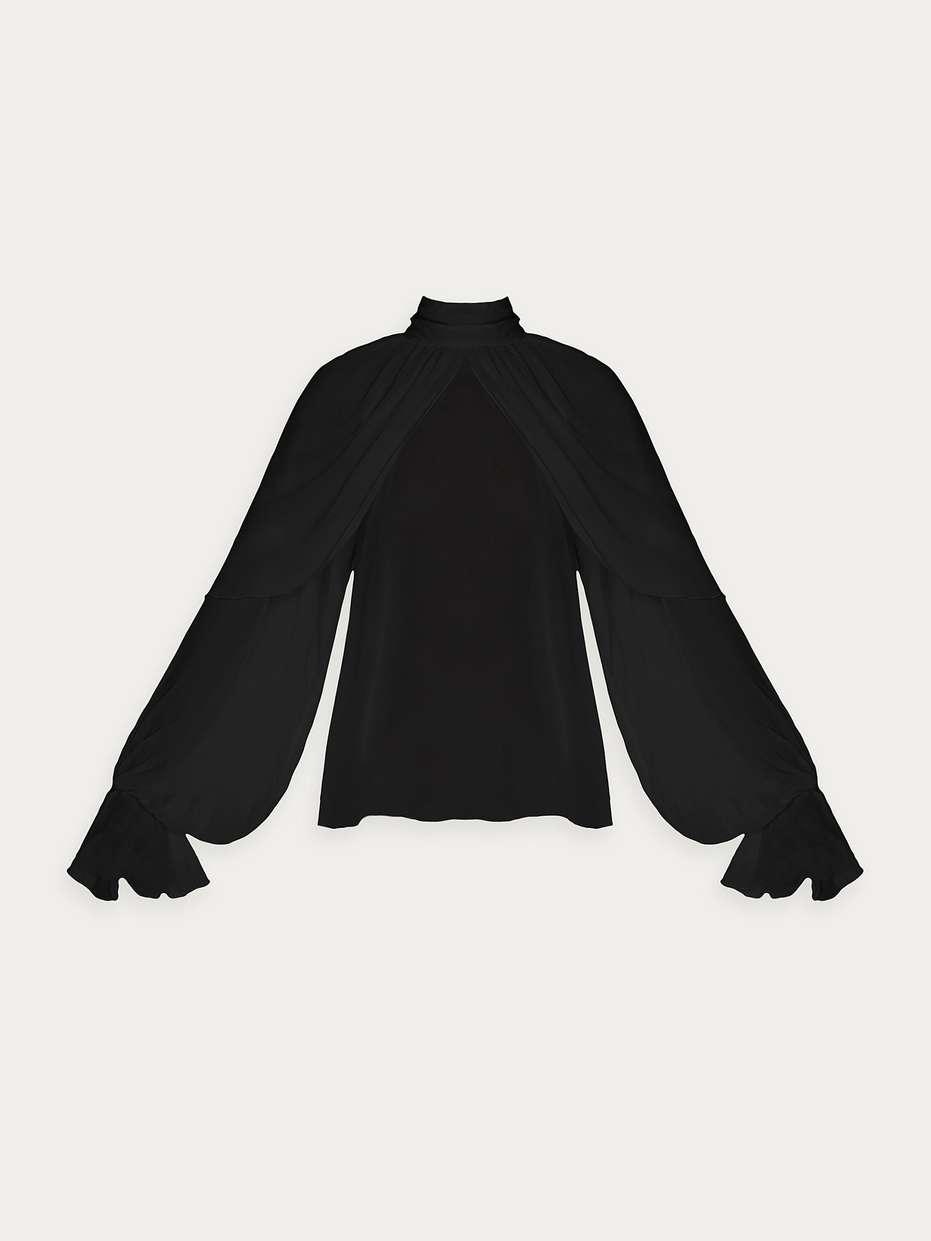 Блуза объемного кроя из итальянского шифона. Свободный силуэт формируется сборкой по линии горловины и расширяющимся кроем от груди, придающим легкость и плавное движение ткани.