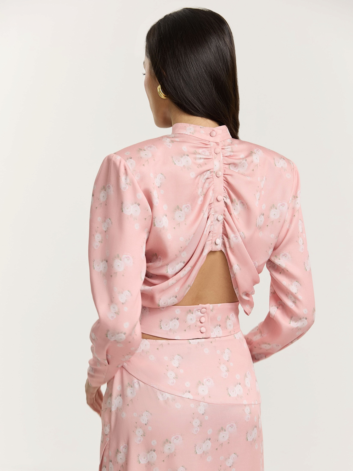 На розовом фоне — молочные ранункулюсы, хаотично рассыпанные по полотну. Принт создан специально для этой коллекции нашим графическим дизайнером.