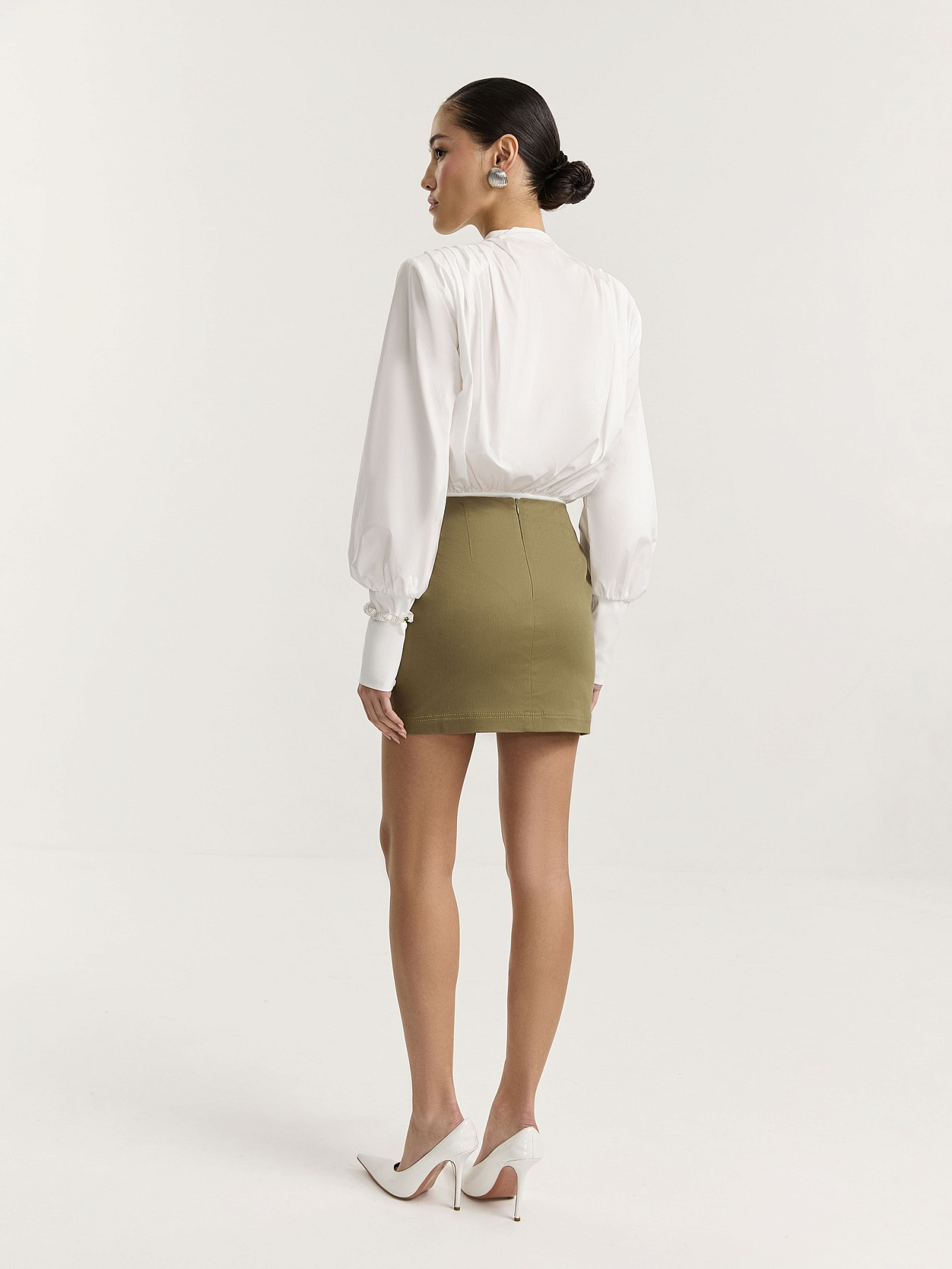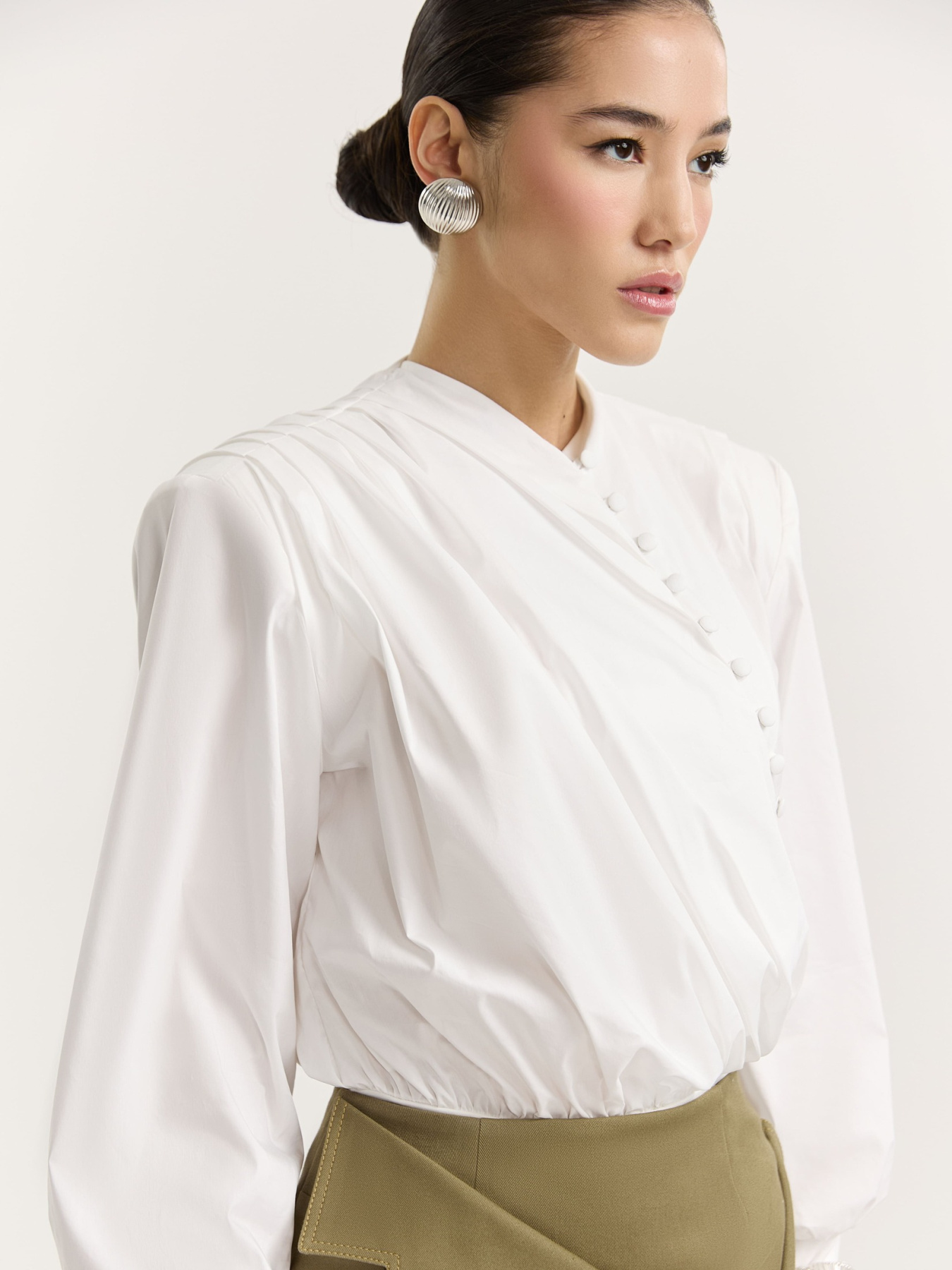 Рубашка-боди из итальянского хлопка и вискозного джерси. Верхняя часть выполнена из рубашечного хлопка и построена на запахе: асимметричная застежка на обтяжные пуговицы и навесные петли подчеркивает архитектуру формы.