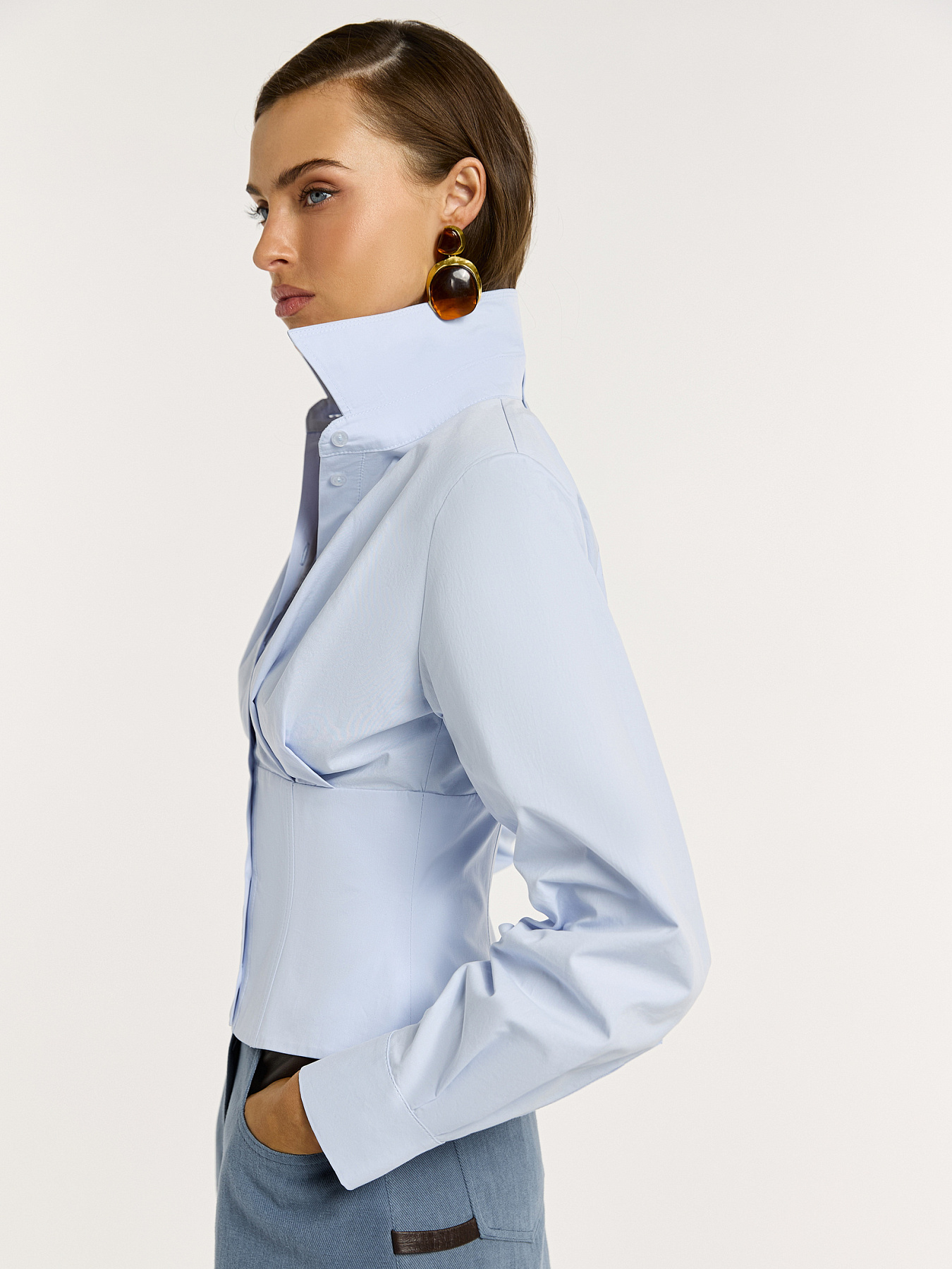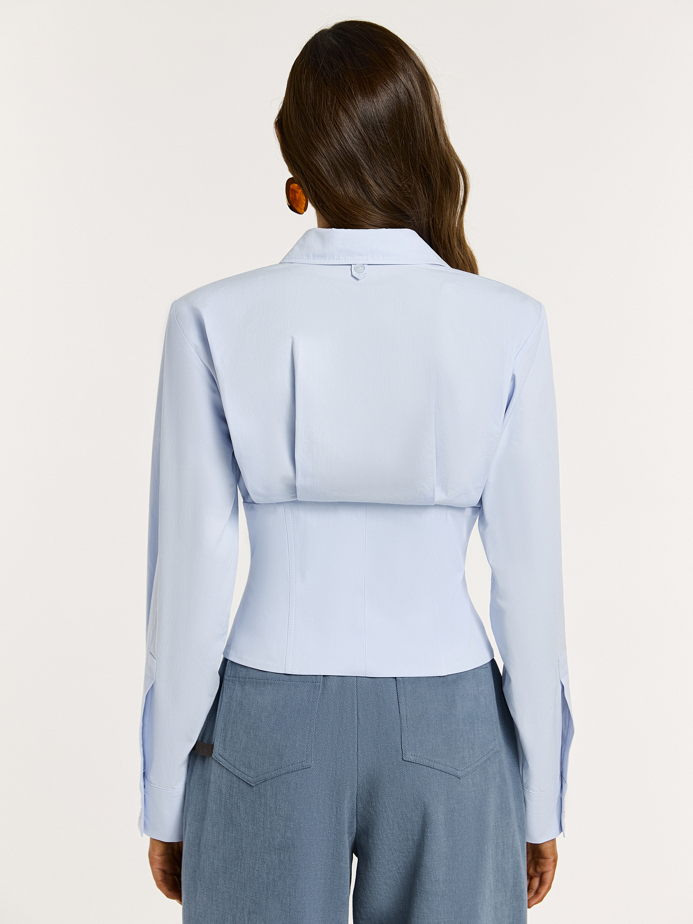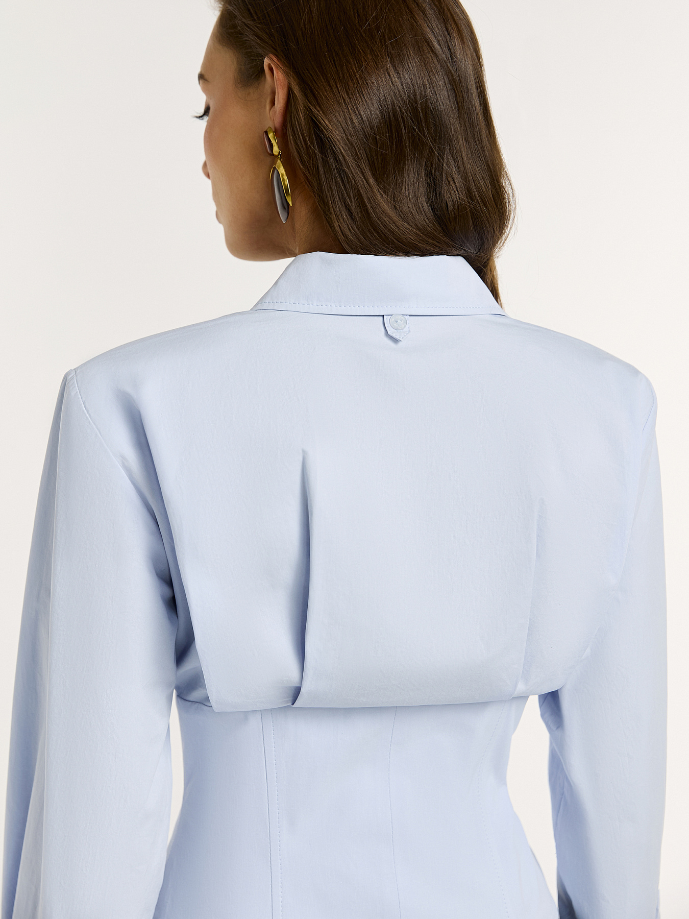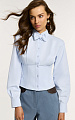 Укороченная рубашка в нежно-голубом оттенке — выразительная модель, в которой классическая рубашка переосмыслена через архитектурный силуэт.