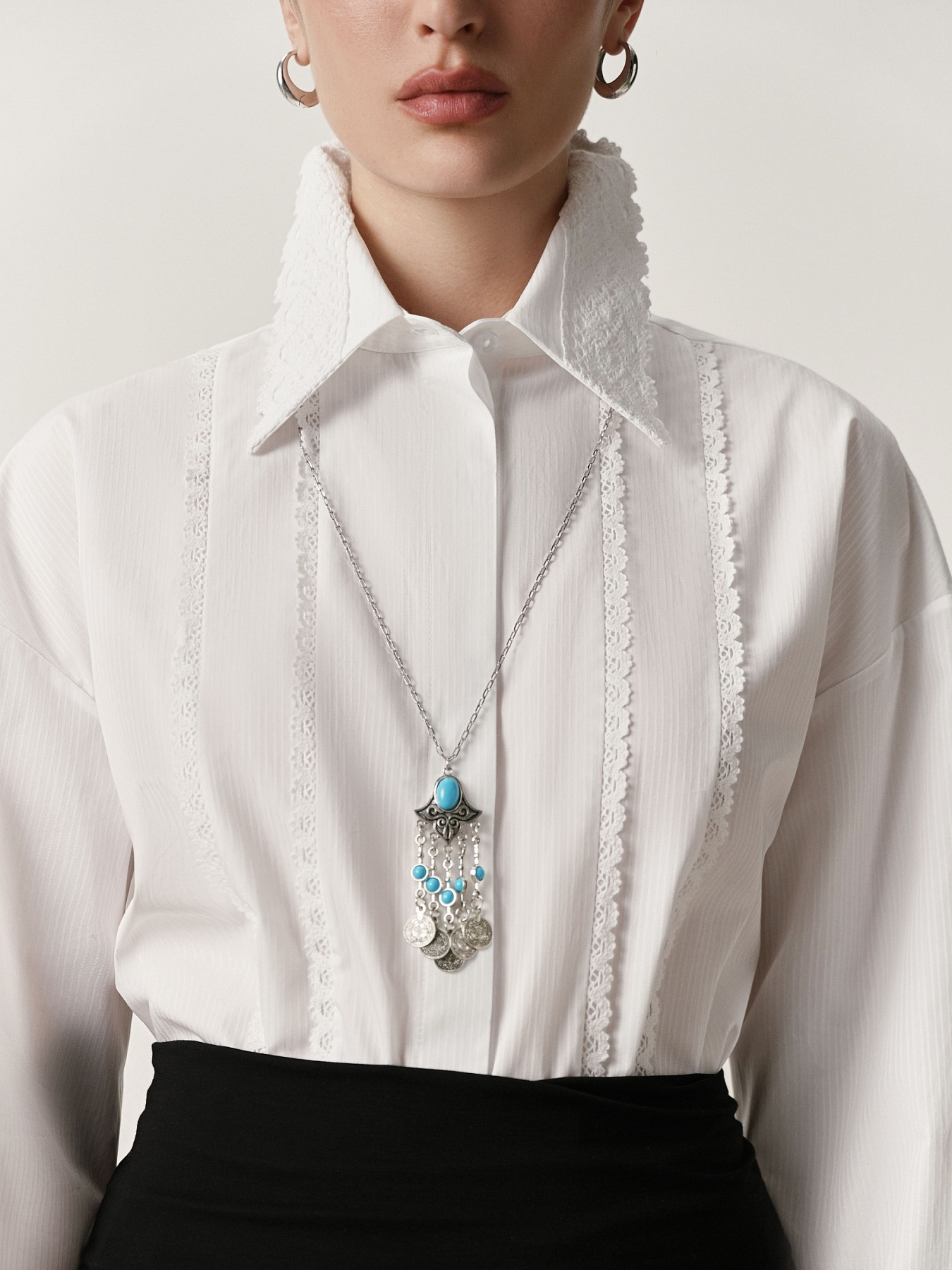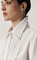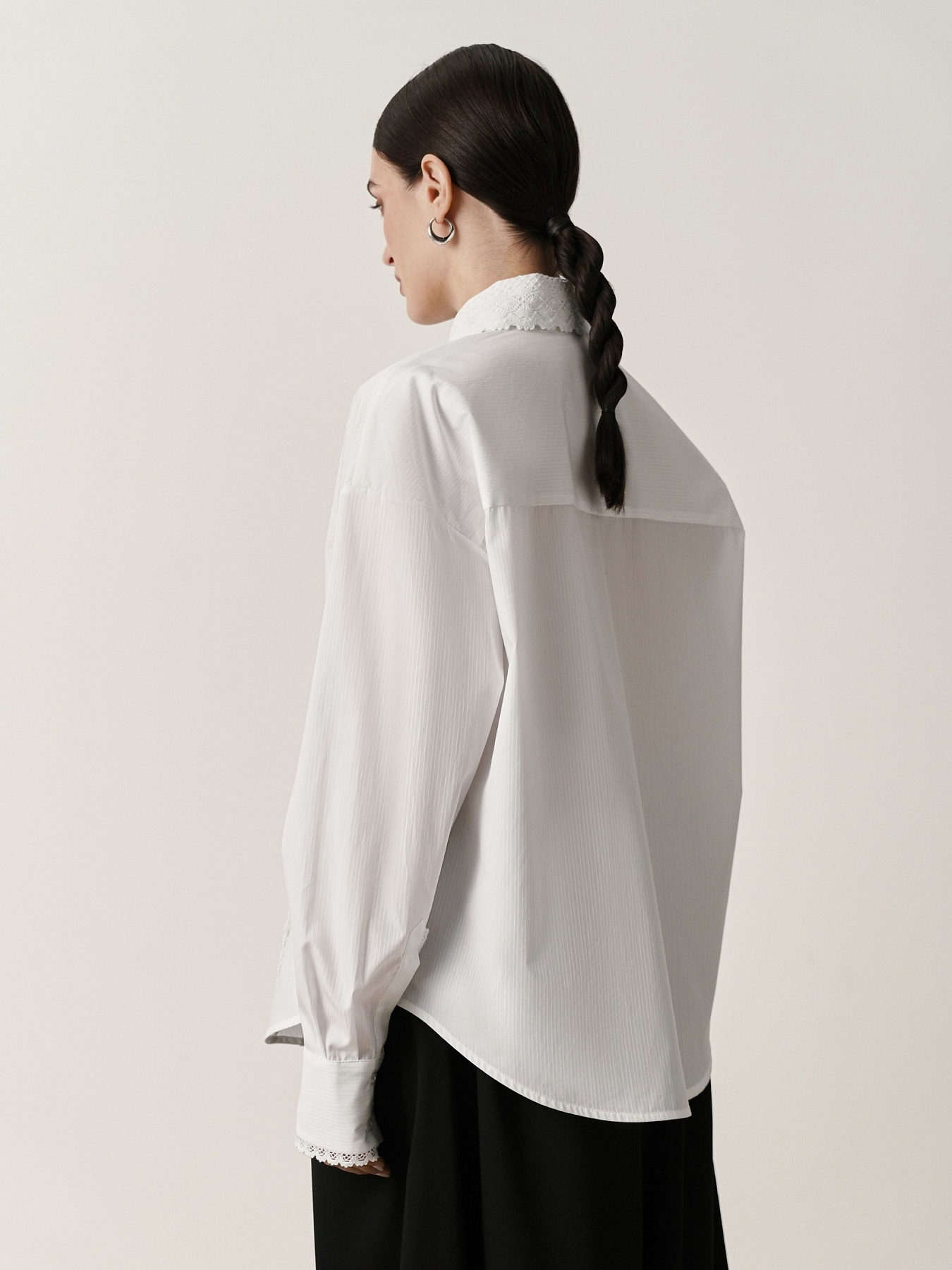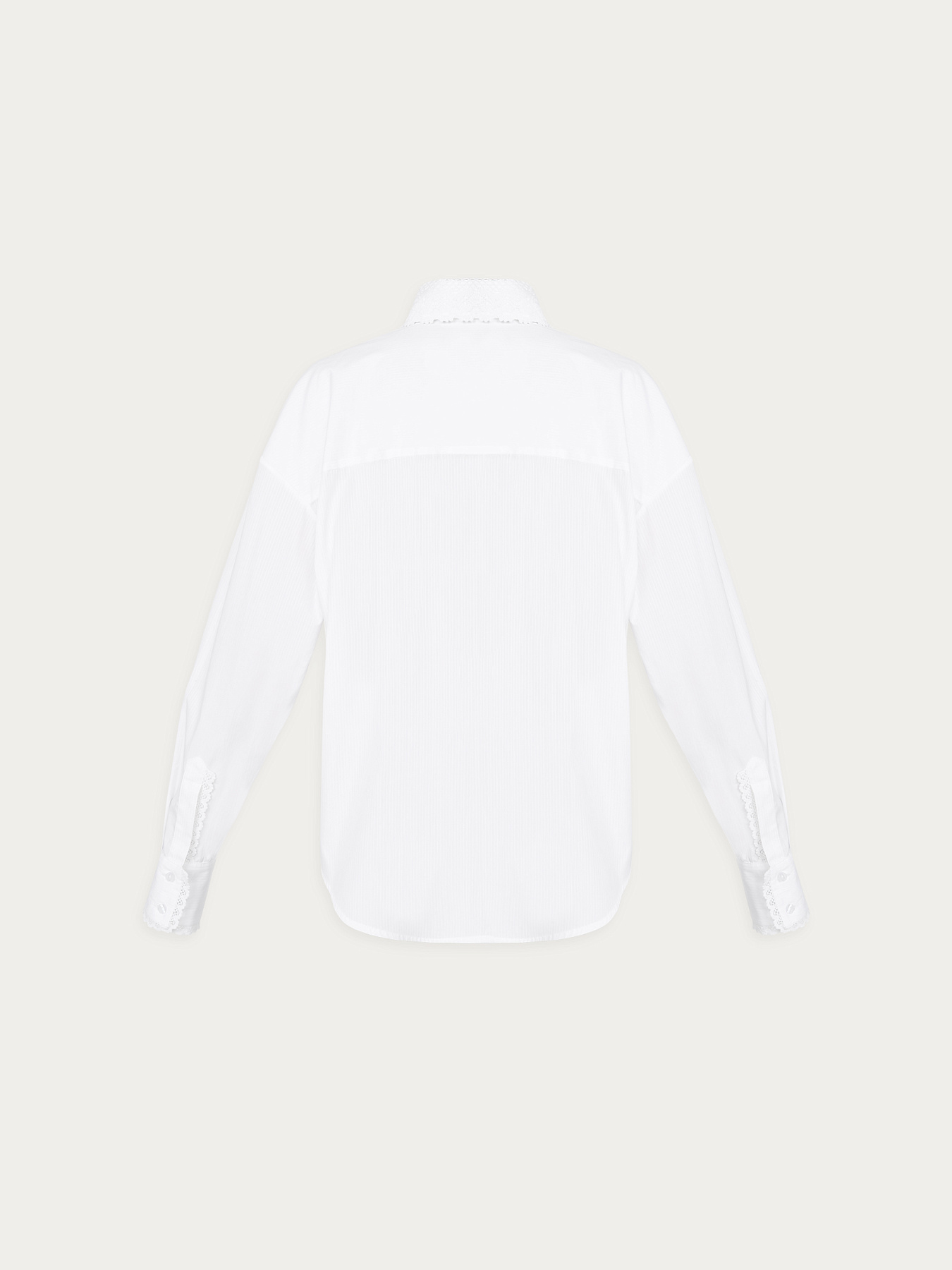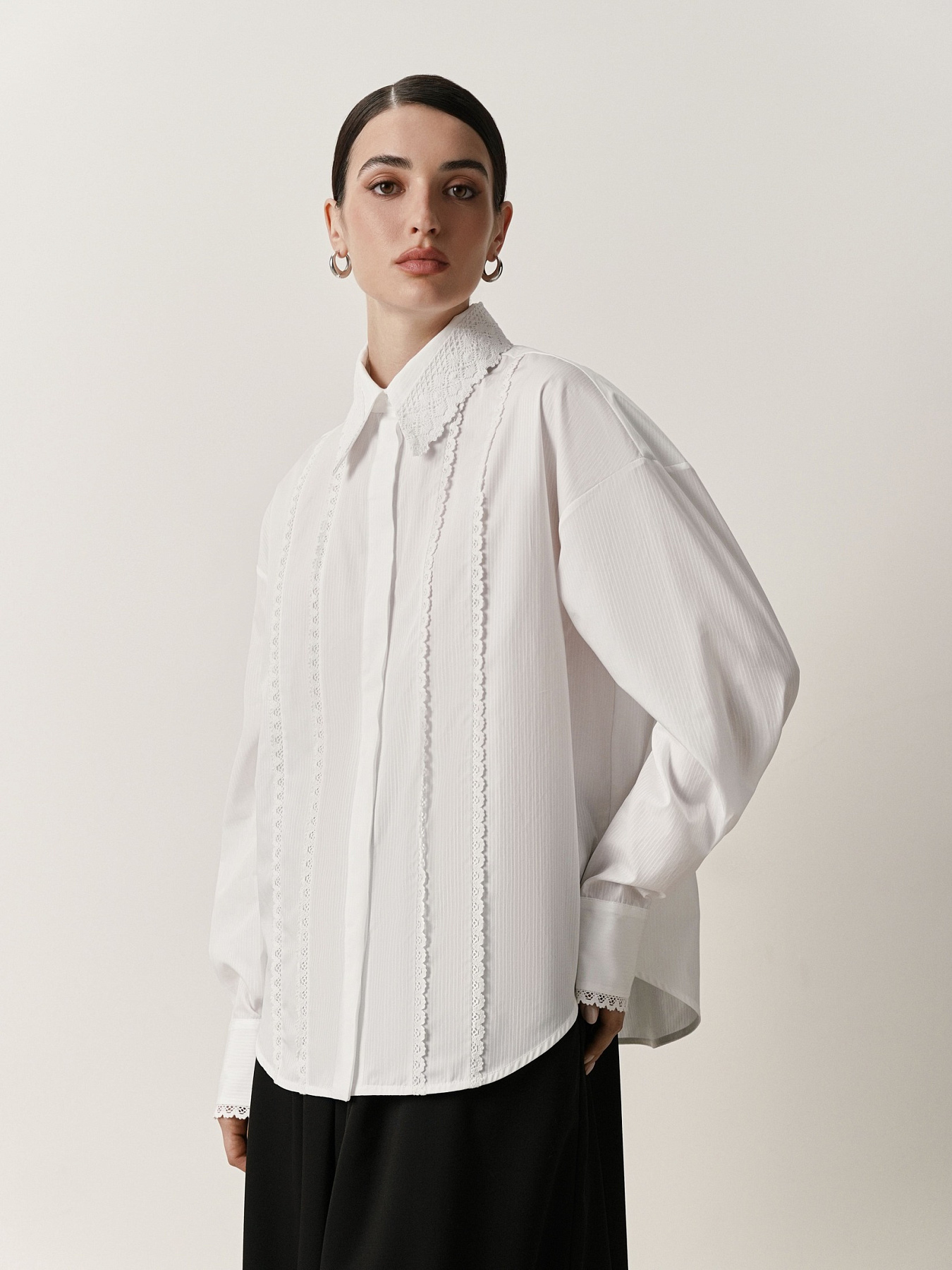 По полочке расположены две вертикальные складки с каждой стороны, под которыми проходит узкая кружевная хлопковая тесьма. Кружевная тесьма украшает нижний край воротника. Спущенная линия плеча и длинный рубашечный рукав завершаются манжетами с застежкой на пуговицы.