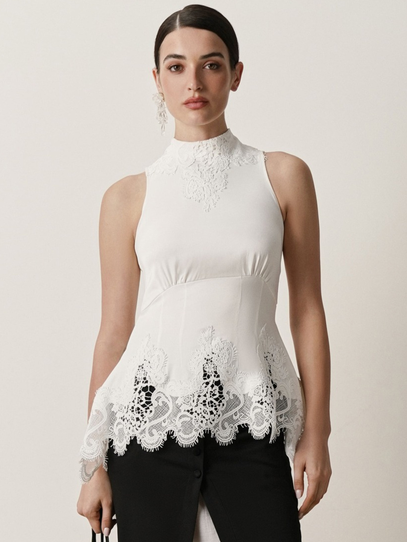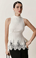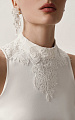 Крой с американской проймой и воротником-стойкой подчеркивает изящество плеч и шеи. Изделие отрезное под грудью и плотно прилегает в области талии, мягко расширяясь к боковым швам за счёт вертикальных вытачек.