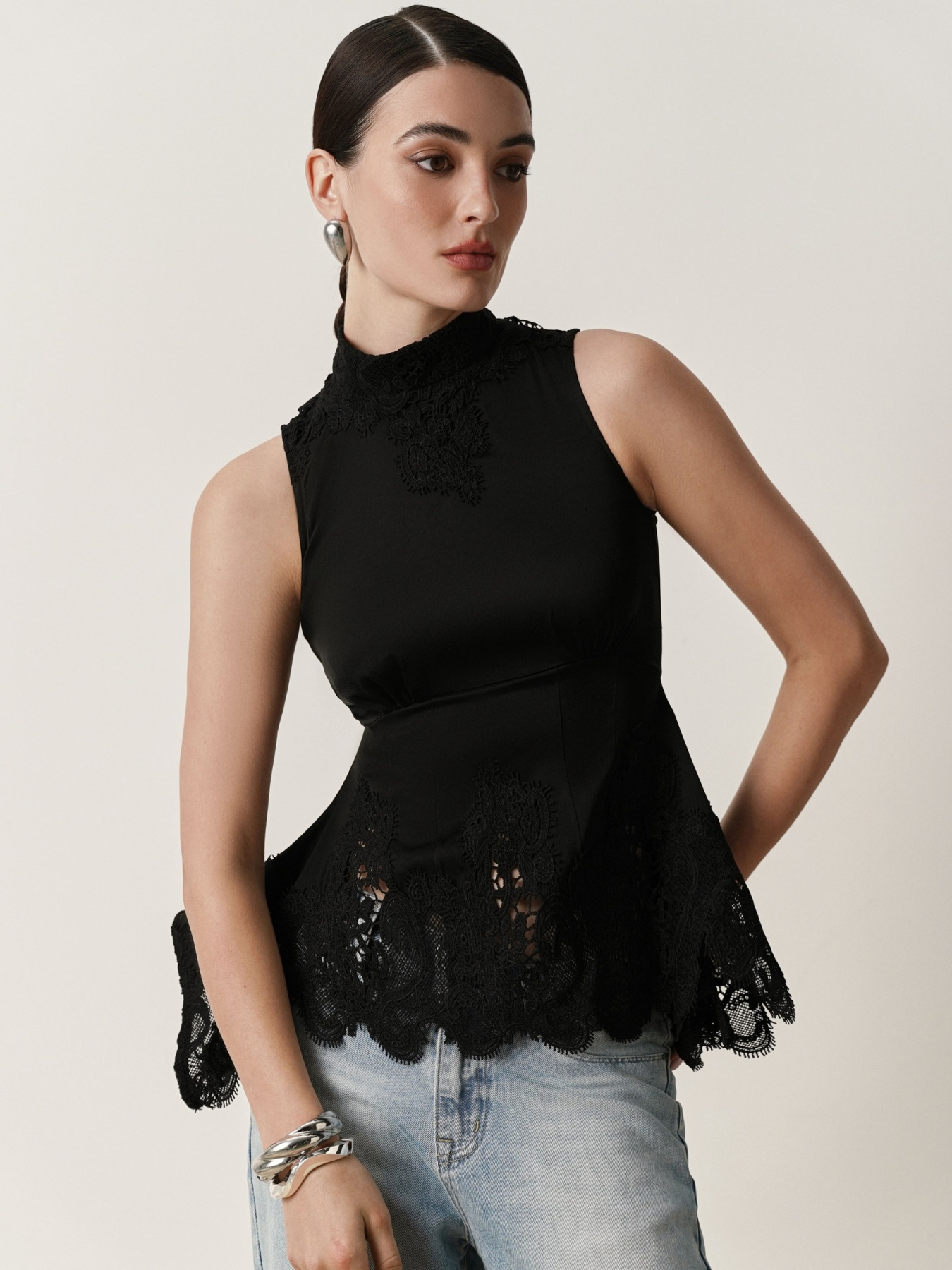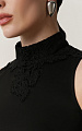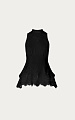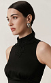 Крой с американской проймой и воротником-стойкой подчеркивает изящество плеч и шеи. Изделие отрезное под грудью и плотно прилегает в области талии, мягко расширяясь к боковым швам за счёт вертикальных вытачек.