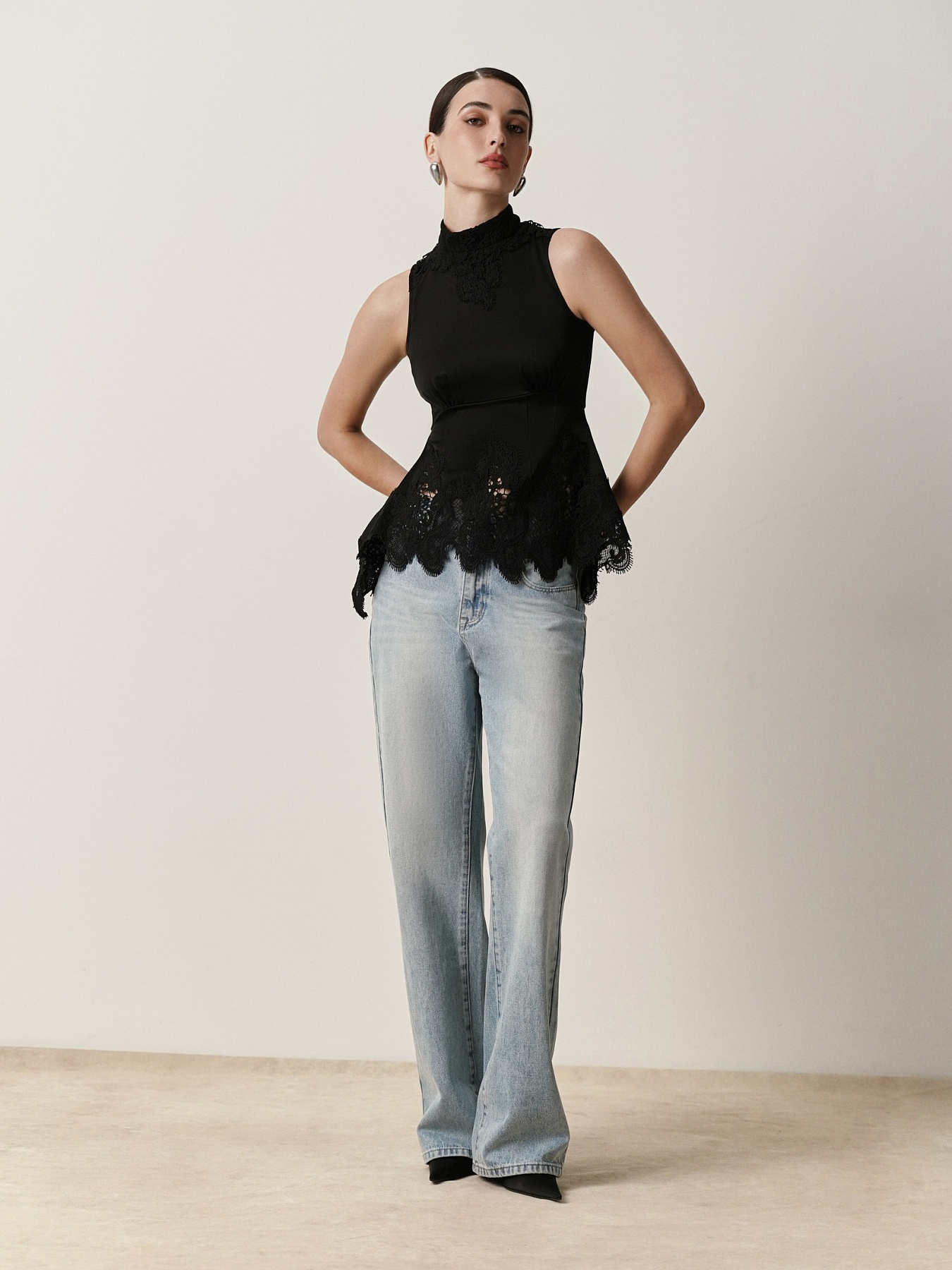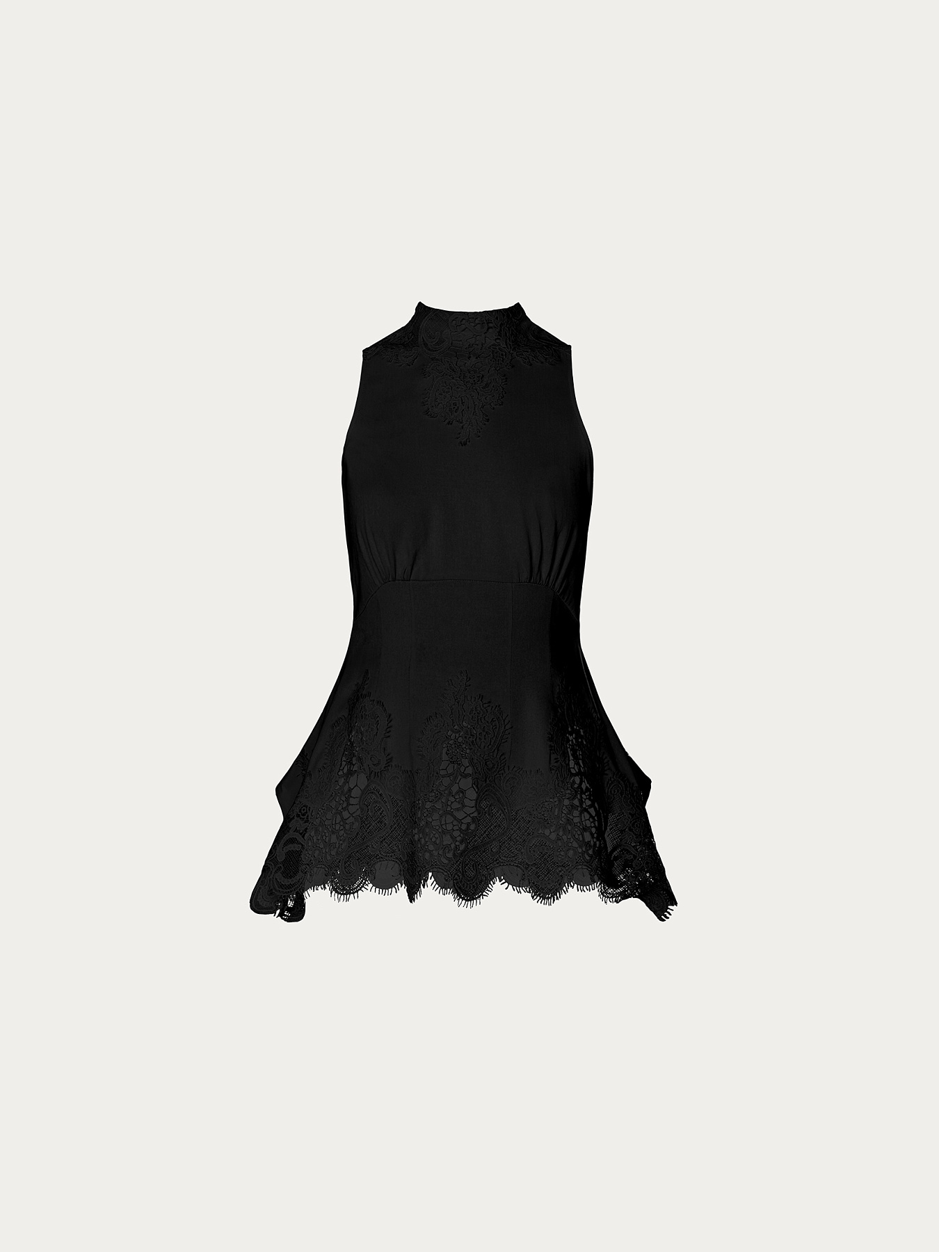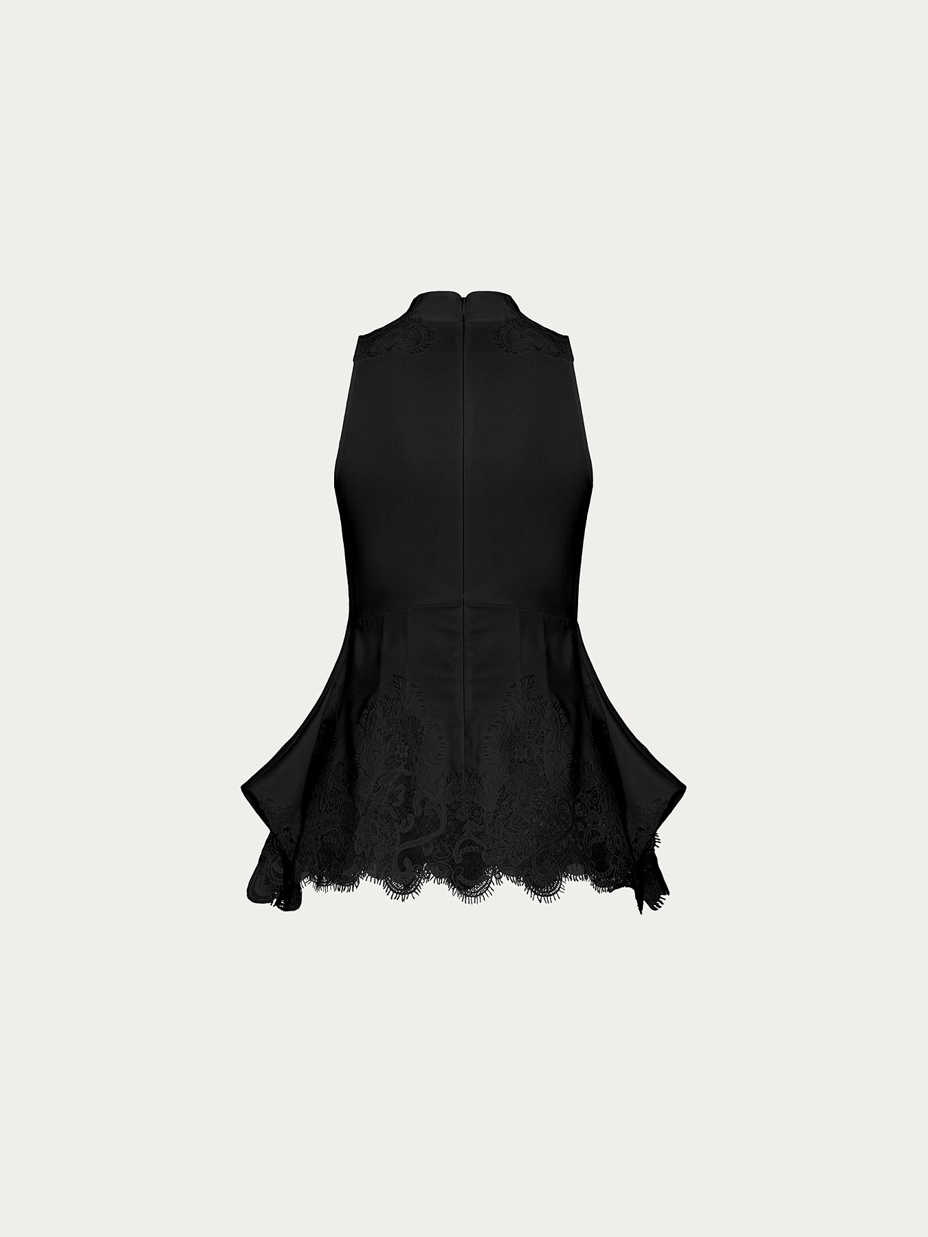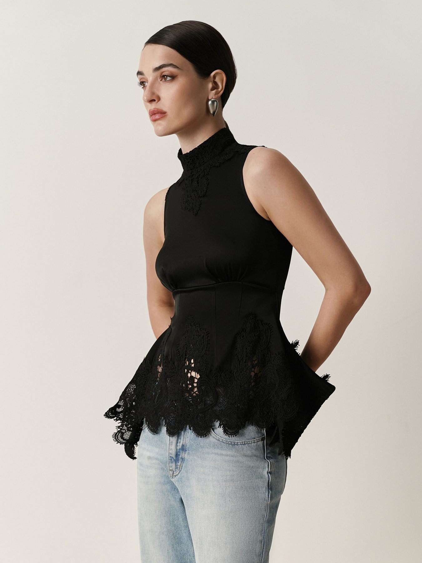 Крой с американской проймой и воротником-стойкой подчеркивает изящество плеч и шеи. Изделие отрезное под грудью и плотно прилегает в области талии, мягко расширяясь к боковым швам за счёт вертикальных вытачек.