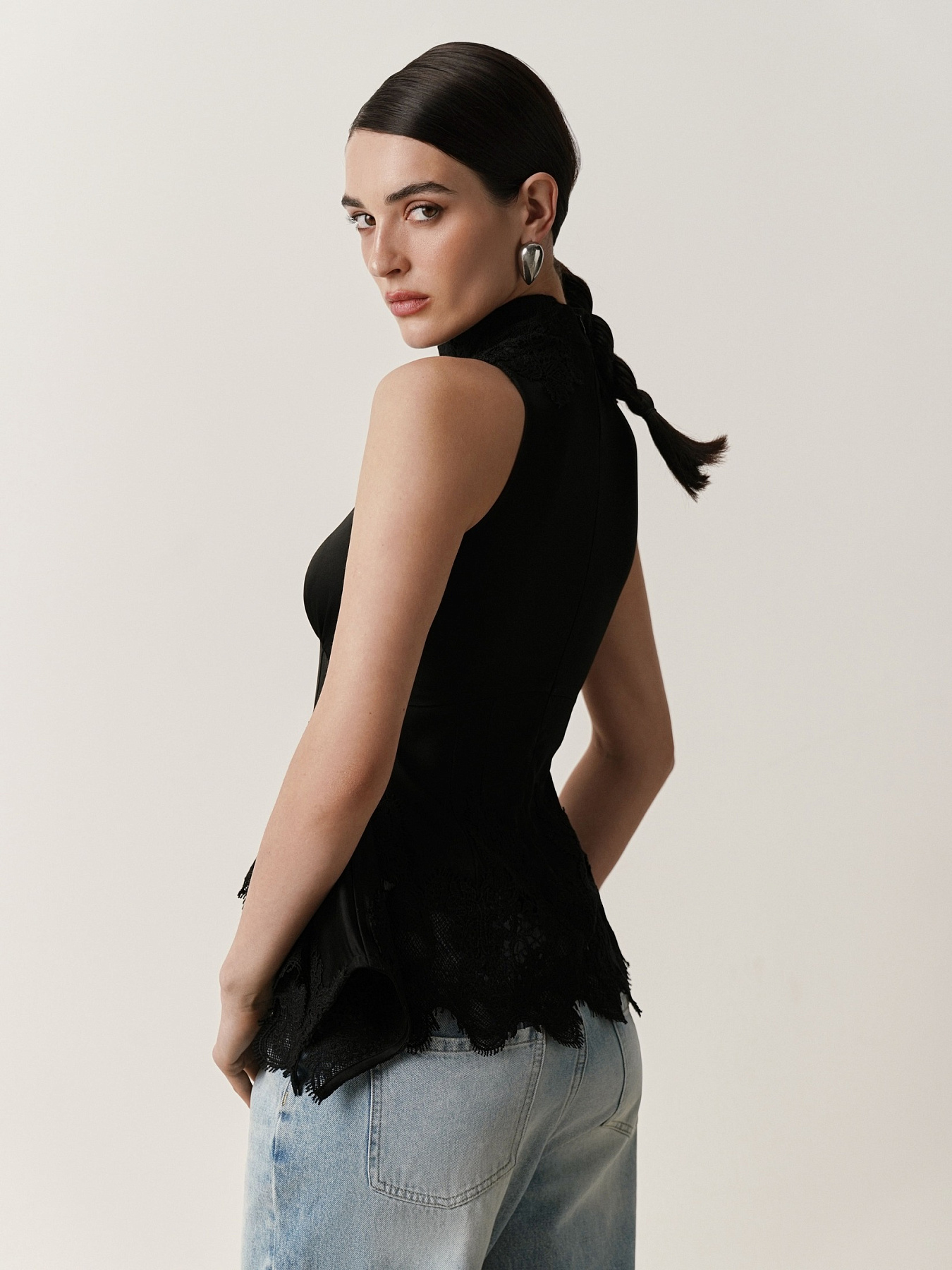 Боковые швы укреплены регилином, что поддерживает форму и визуально подчеркивает талию. По нижнему срезу, вдоль горловины, стойки и верхней части спинки расположено фигурное хлопковое кордовое кружево, которое вырезается и выкладывается вручную.