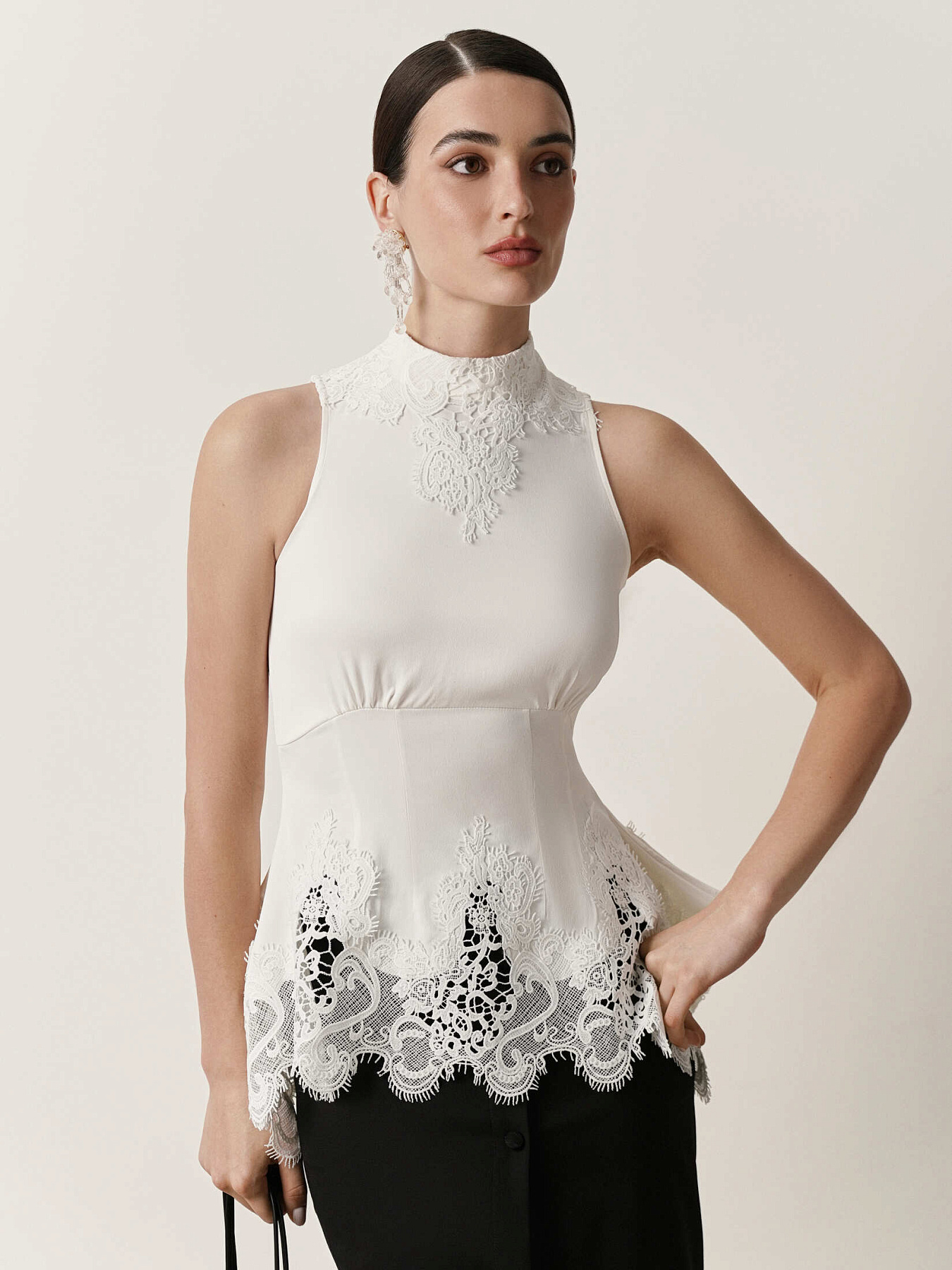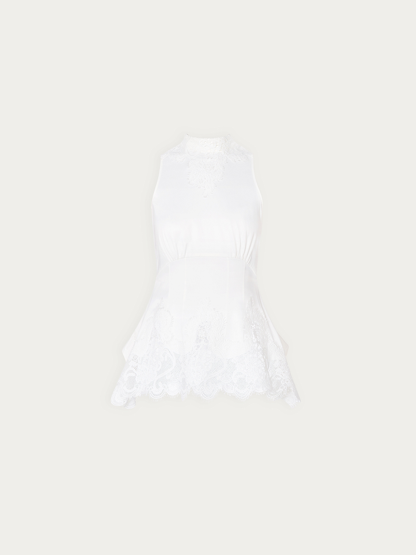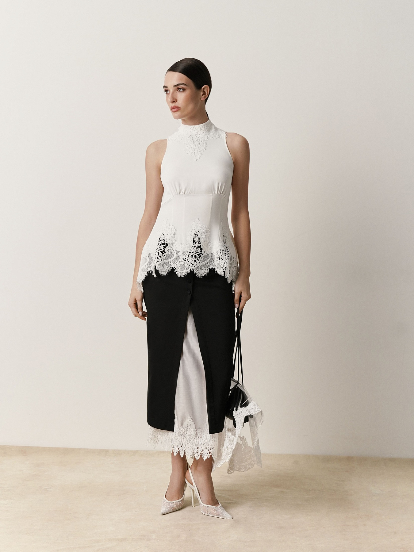 Крой с американской проймой и воротником-стойкой подчеркивает изящество плеч и шеи. Изделие отрезное под грудью и плотно прилегает в области талии, мягко расширяясь к боковым швам за счёт вертикальных вытачек.
