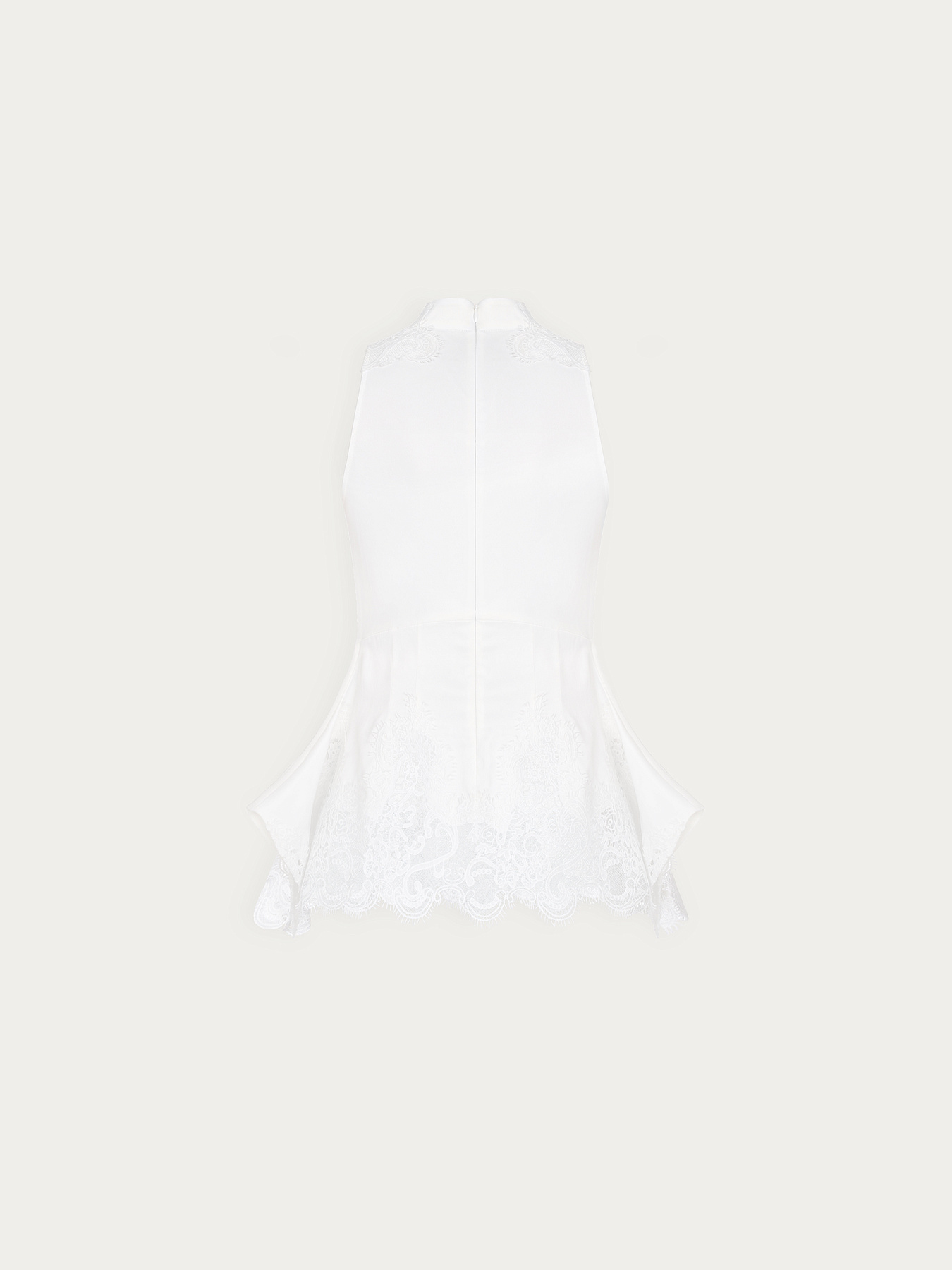 Боковые швы укреплены регилином, что поддерживает форму и визуально подчеркивает талию. По нижнему срезу, вдоль горловины, стойки и верхней части спинки расположено фигурное хлопковое кордовое кружево, которое вырезается и выкладывается вручную.