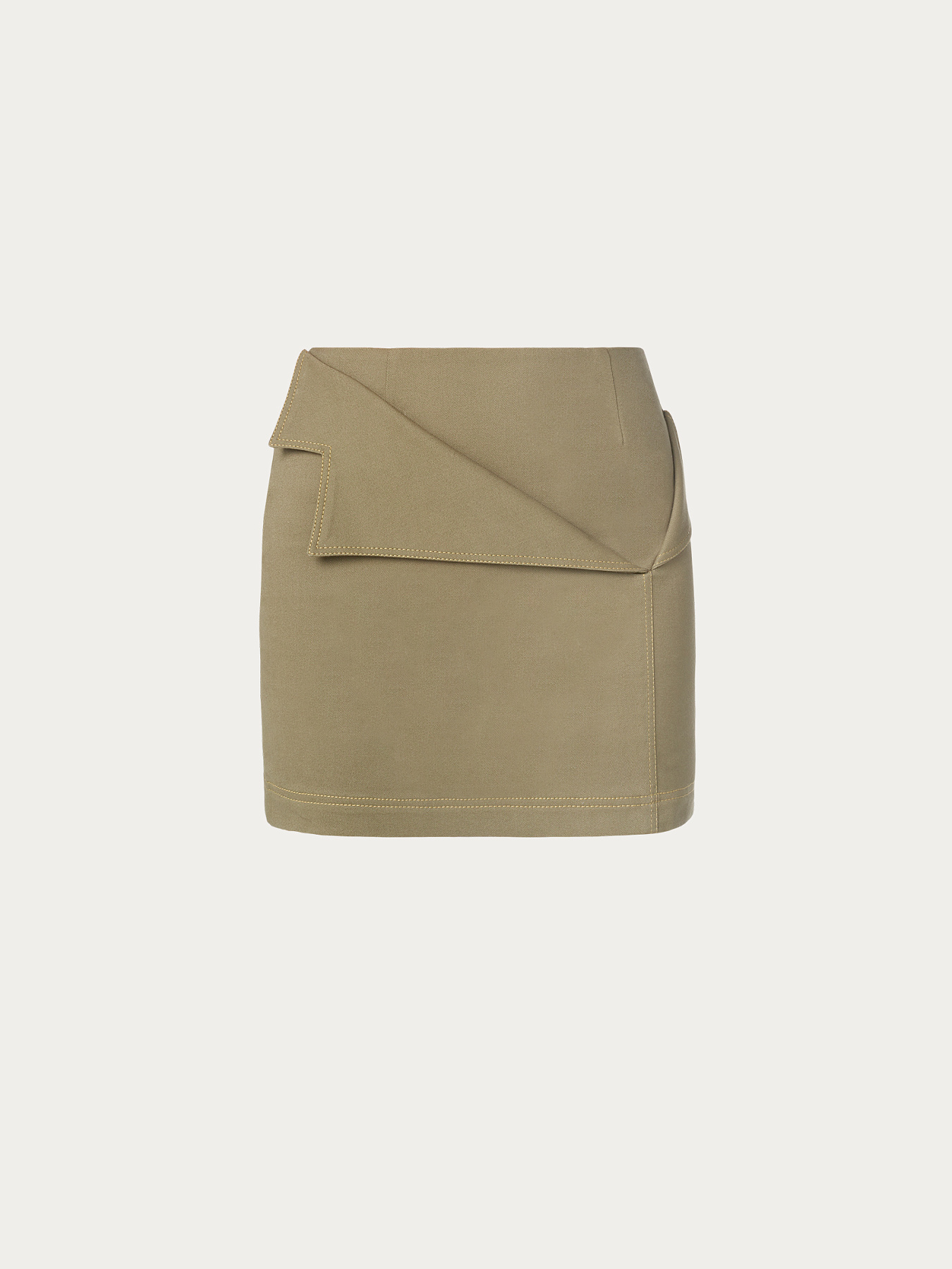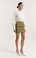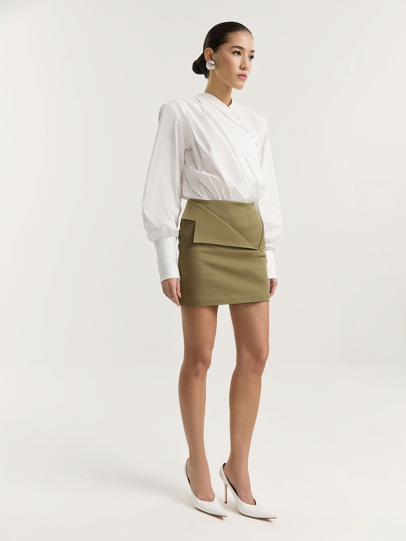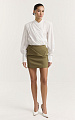 Юбка длины мини из итальянского хлопка твилового переплетения, по фактуре напоминающего деним. Четкий силуэт дополнен акцентной накладной деталью по переднему полотнищу, имитирующей английский воротник и создающей графичный, немного архитектурный штрих.
