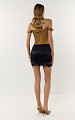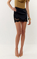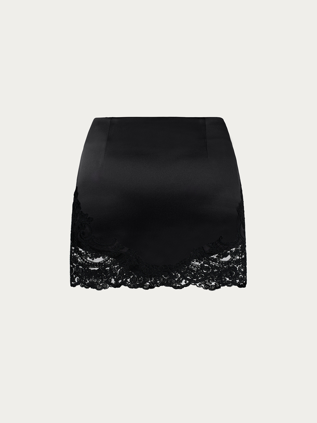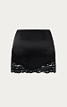Юбка мини прилегающего силуэта из итальянской ткани дюшес в черном цвете. Средняя посадка подчеркивает линию талии, верхний срез аккуратно закрыт обтачкой.