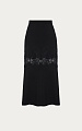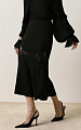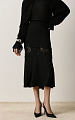 Центральным акцентом становится фигурная вставка из хлопкового кордового кружева, выложенная и закрепленная вручную. Прозрачное плетение деликатно открывает ноги, создавая утонченный контраст между плотной тканью и легкостью кружева. Верхняя часть юбки скроена по долевой, обеспечивая точную посадку по бедрам, а нижняя — по косой, что придает изделию текучесть и мягкое движение.