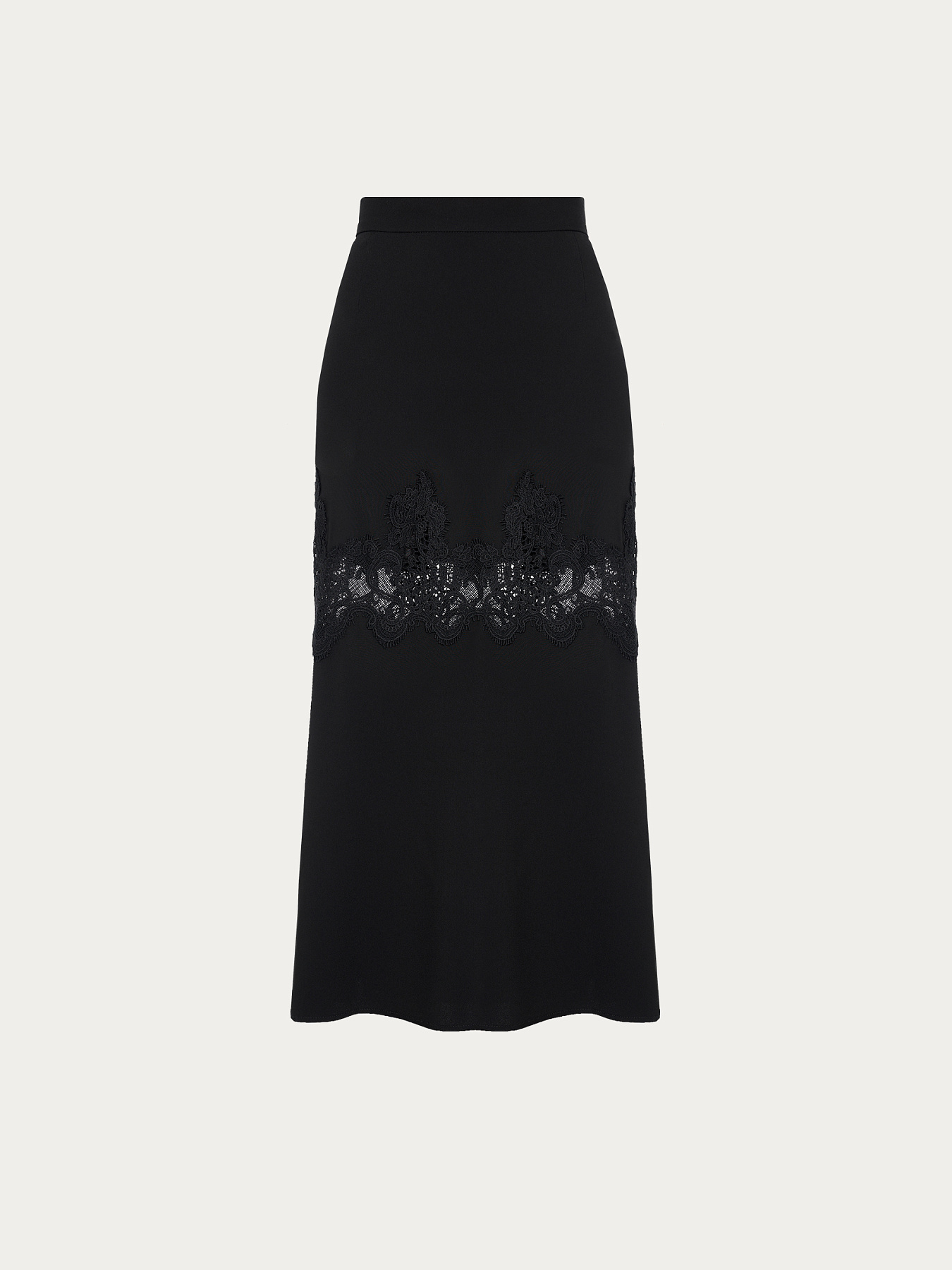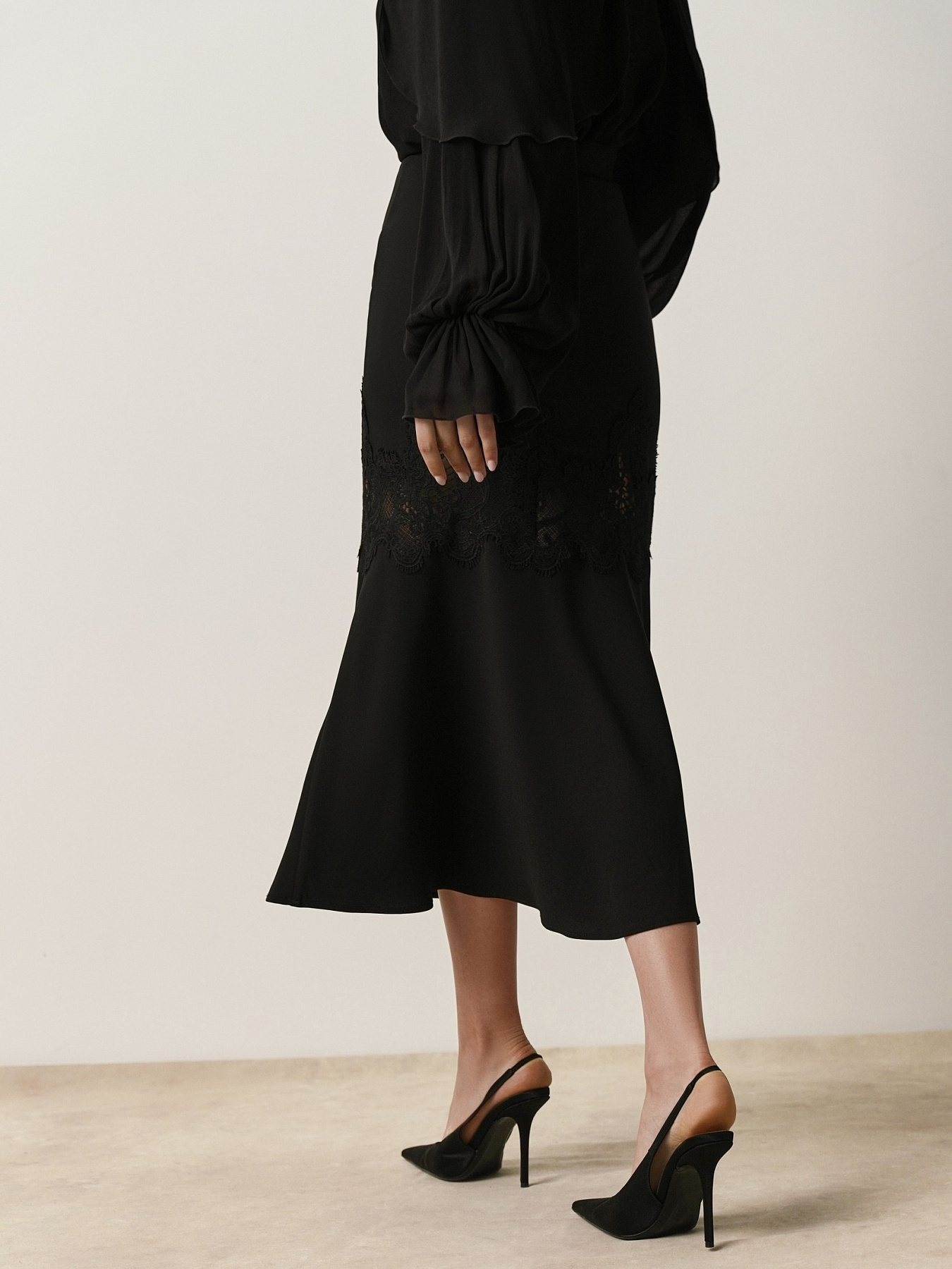 Центральным акцентом становится фигурная вставка из хлопкового кордового кружева, выложенная и закрепленная вручную. Прозрачное плетение деликатно открывает ноги, создавая утонченный контраст между плотной тканью и легкостью кружева. Верхняя часть юбки скроена по долевой, обеспечивая точную посадку по бедрам, а нижняя — по косой, что придает изделию текучесть и мягкое движение.