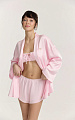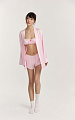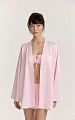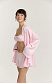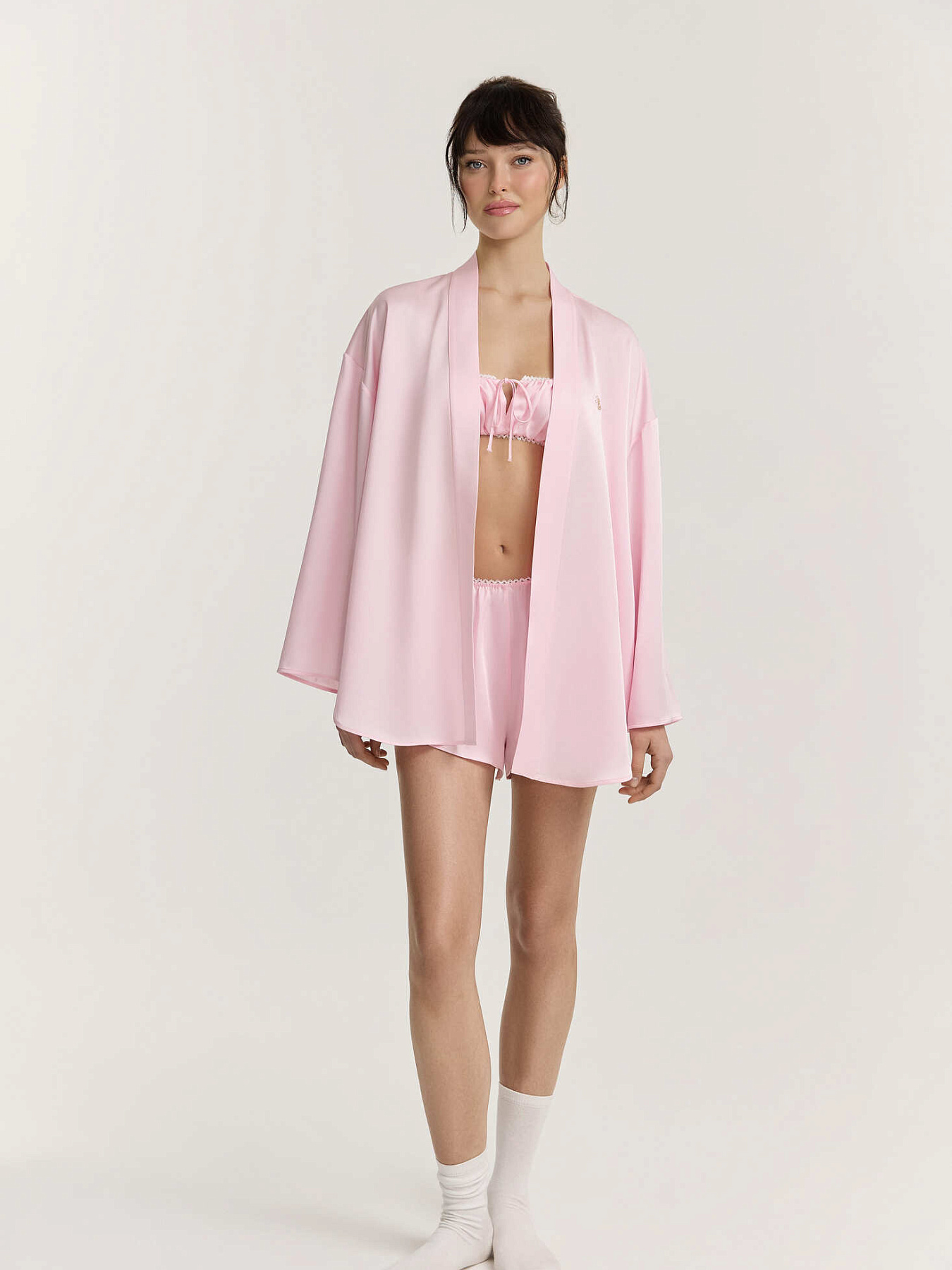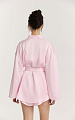 Кимоно из итальянской вискозной кади в нежно-розовом оттенке. Укороченная длина и фигурная линия низа визуально вытягивают силуэт, сохраняя легкость и аккуратность формы.
