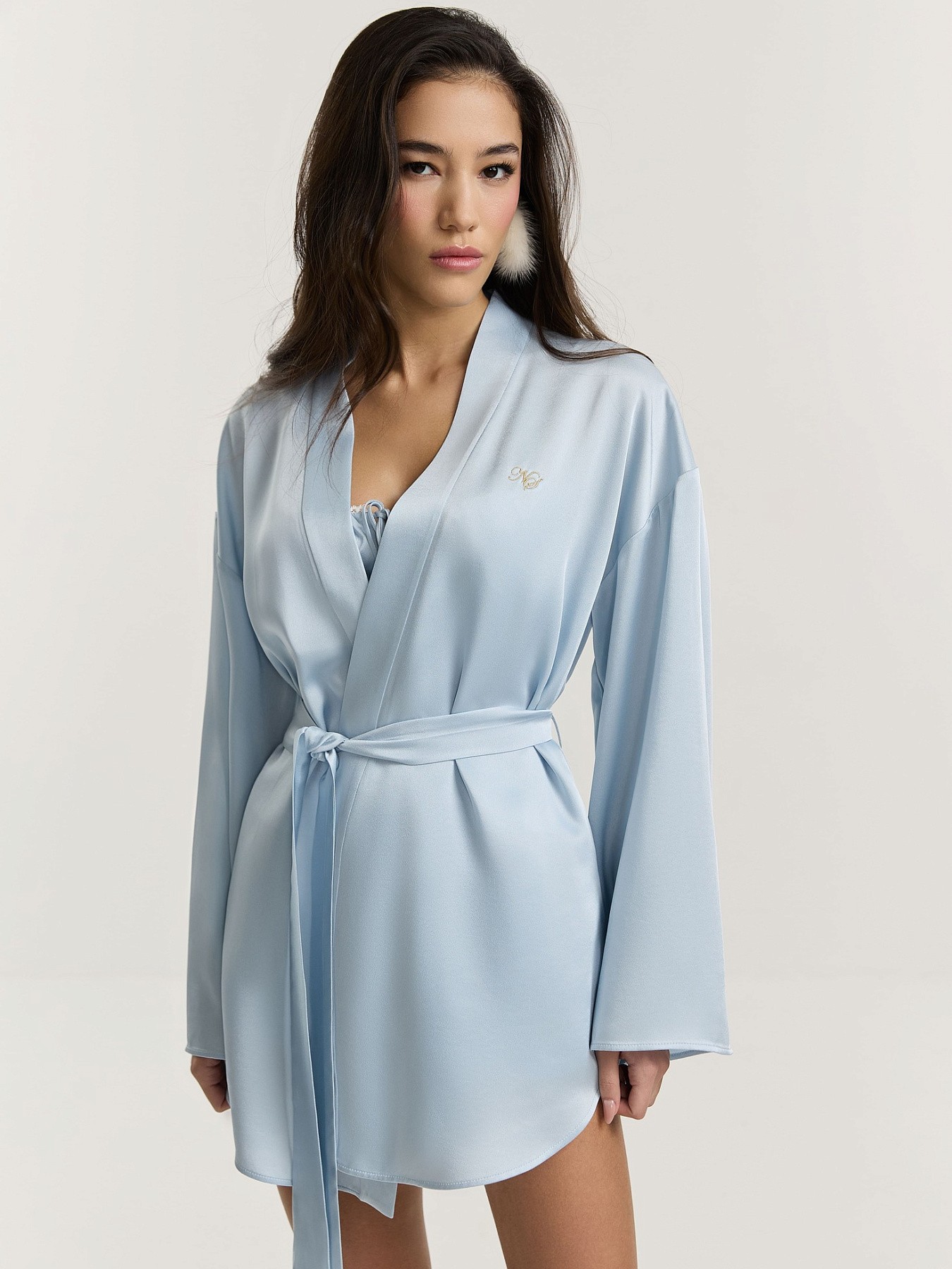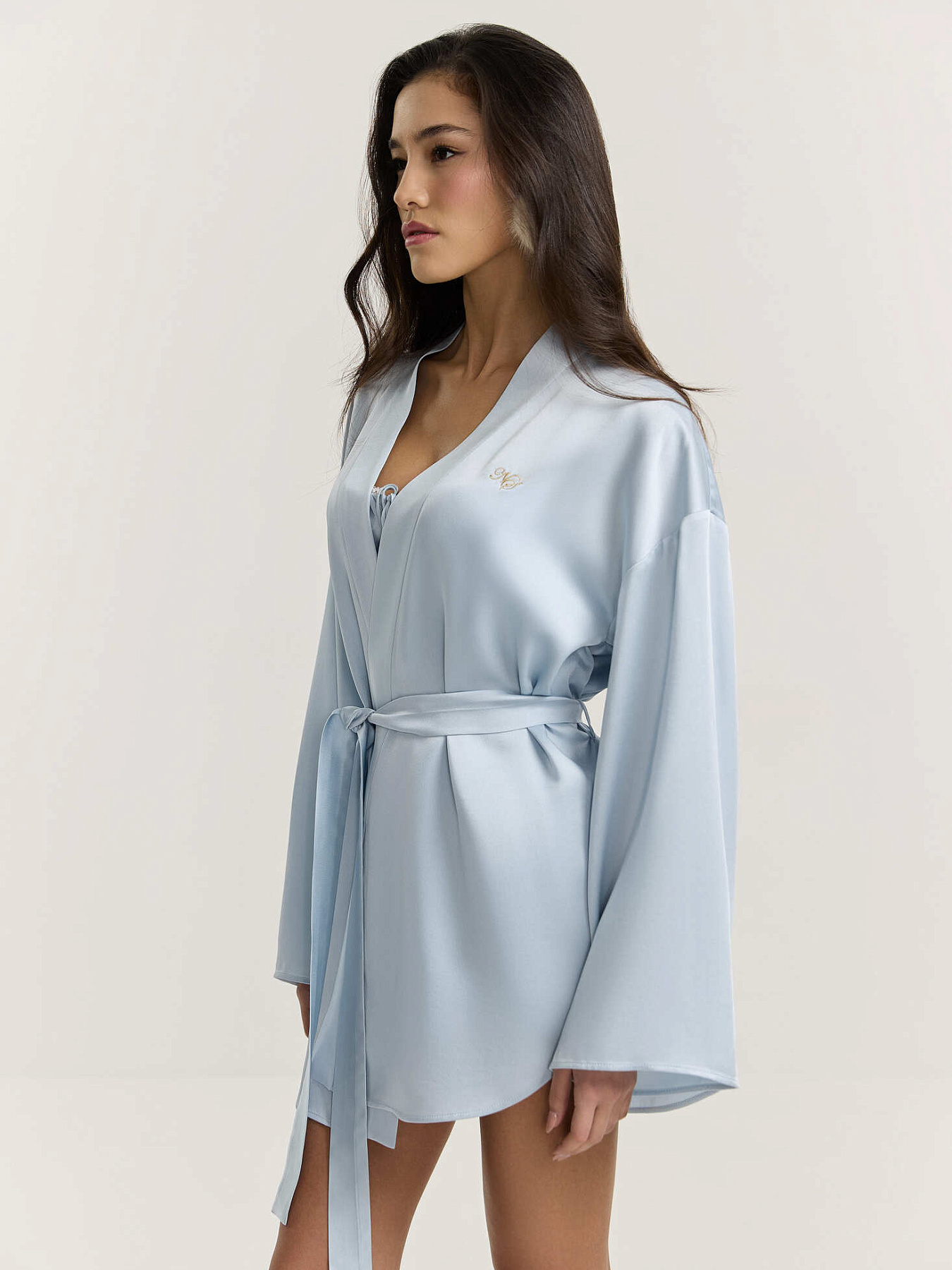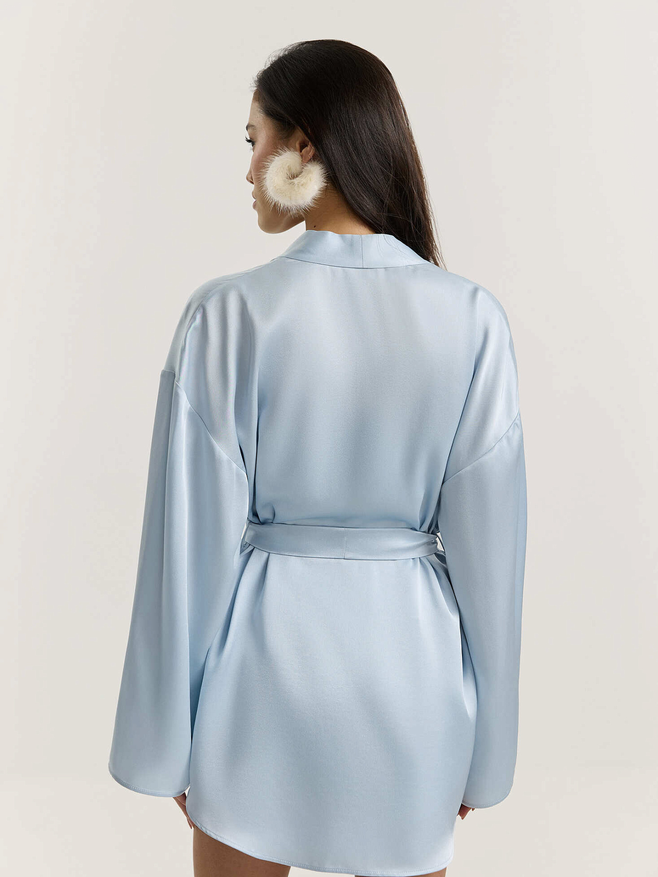 Кимоно из итальянской вискозной кади в нежно-голубом оттенке. Укороченная длина и фигурная линия низа визуально вытягивают силуэт, сохраняя легкость и аккуратность формы. Спущенная линия плеча, широкий рукав и мягкая драпировка ткани создают расслабленное настроение.
