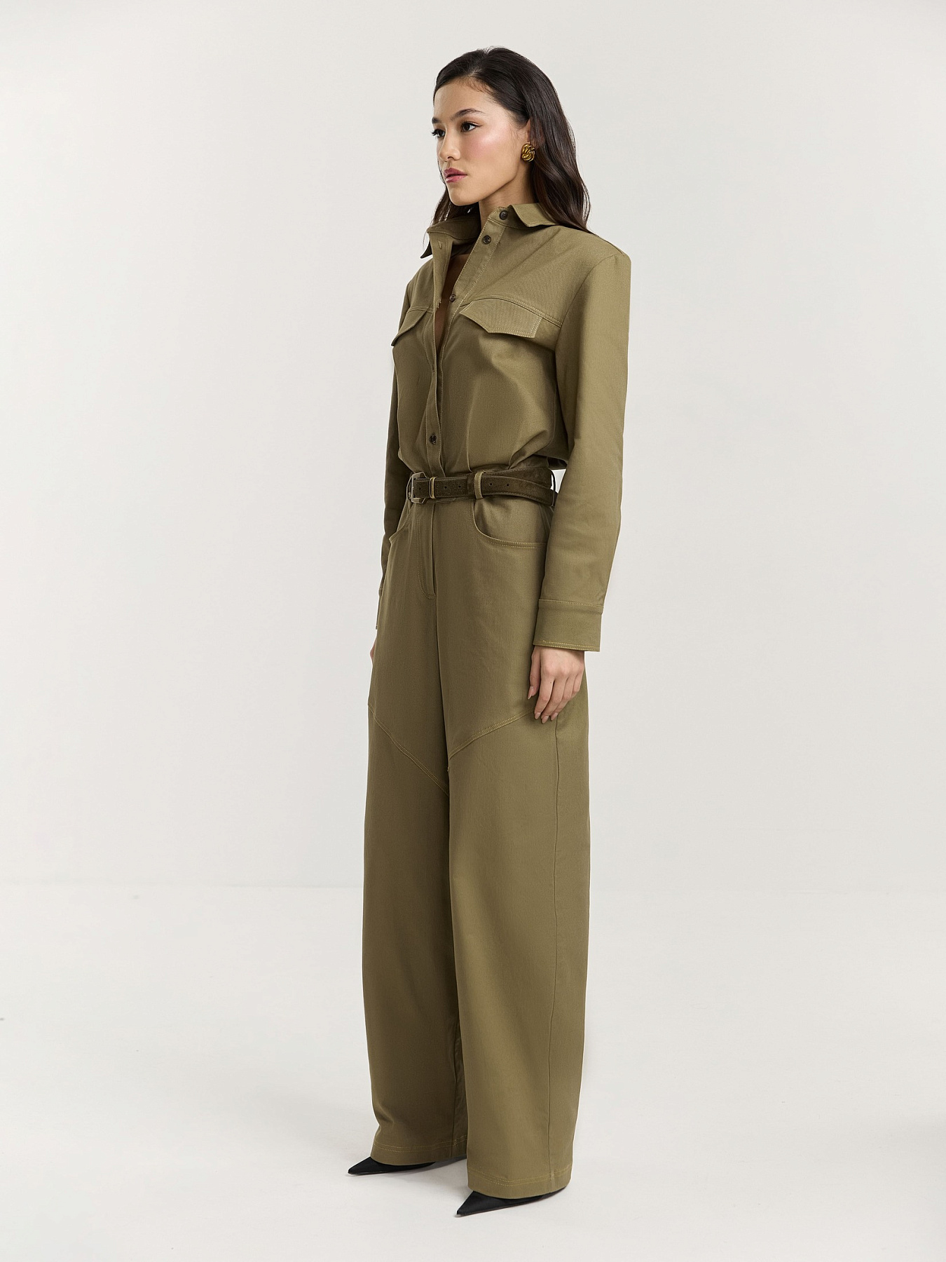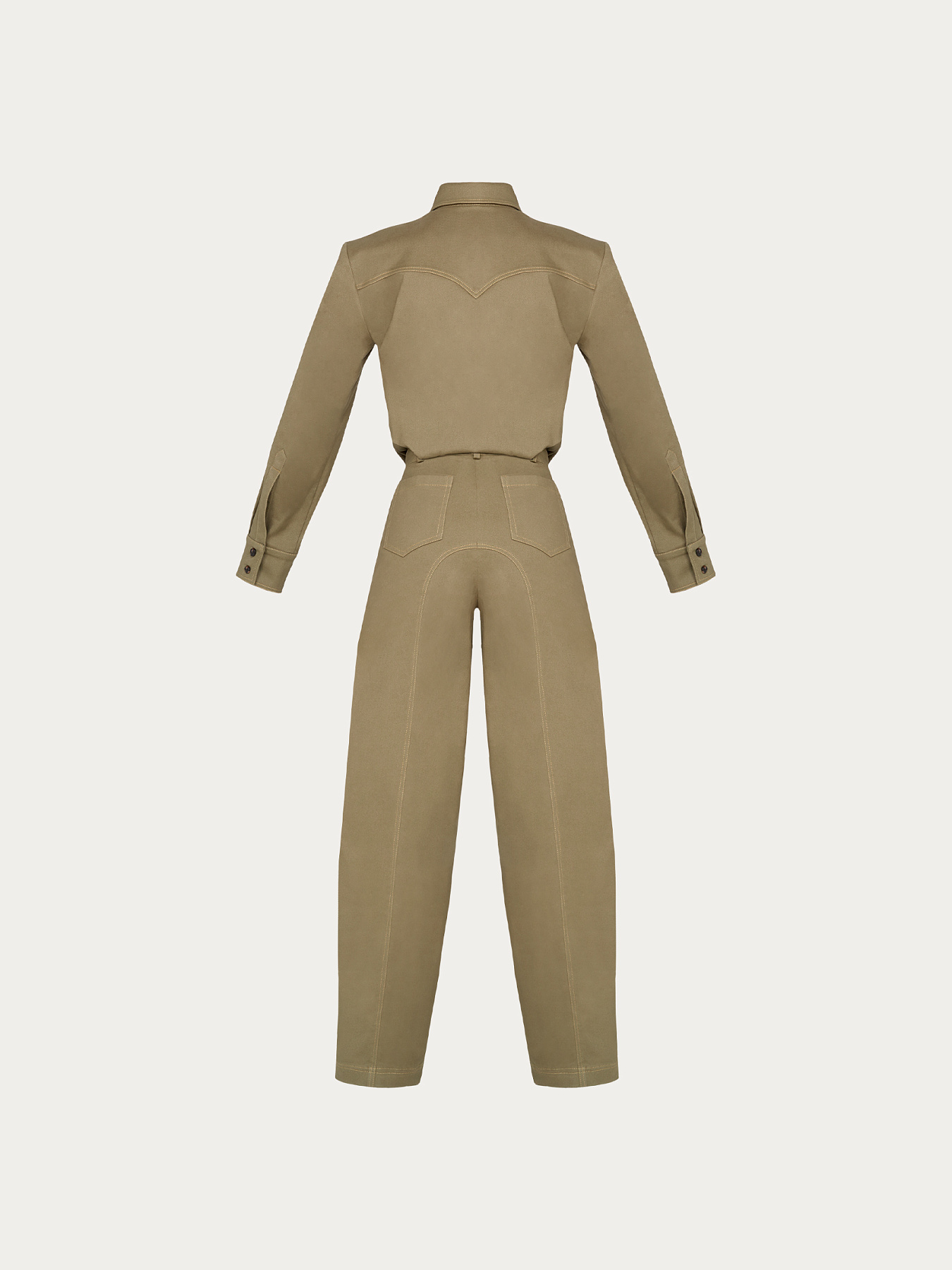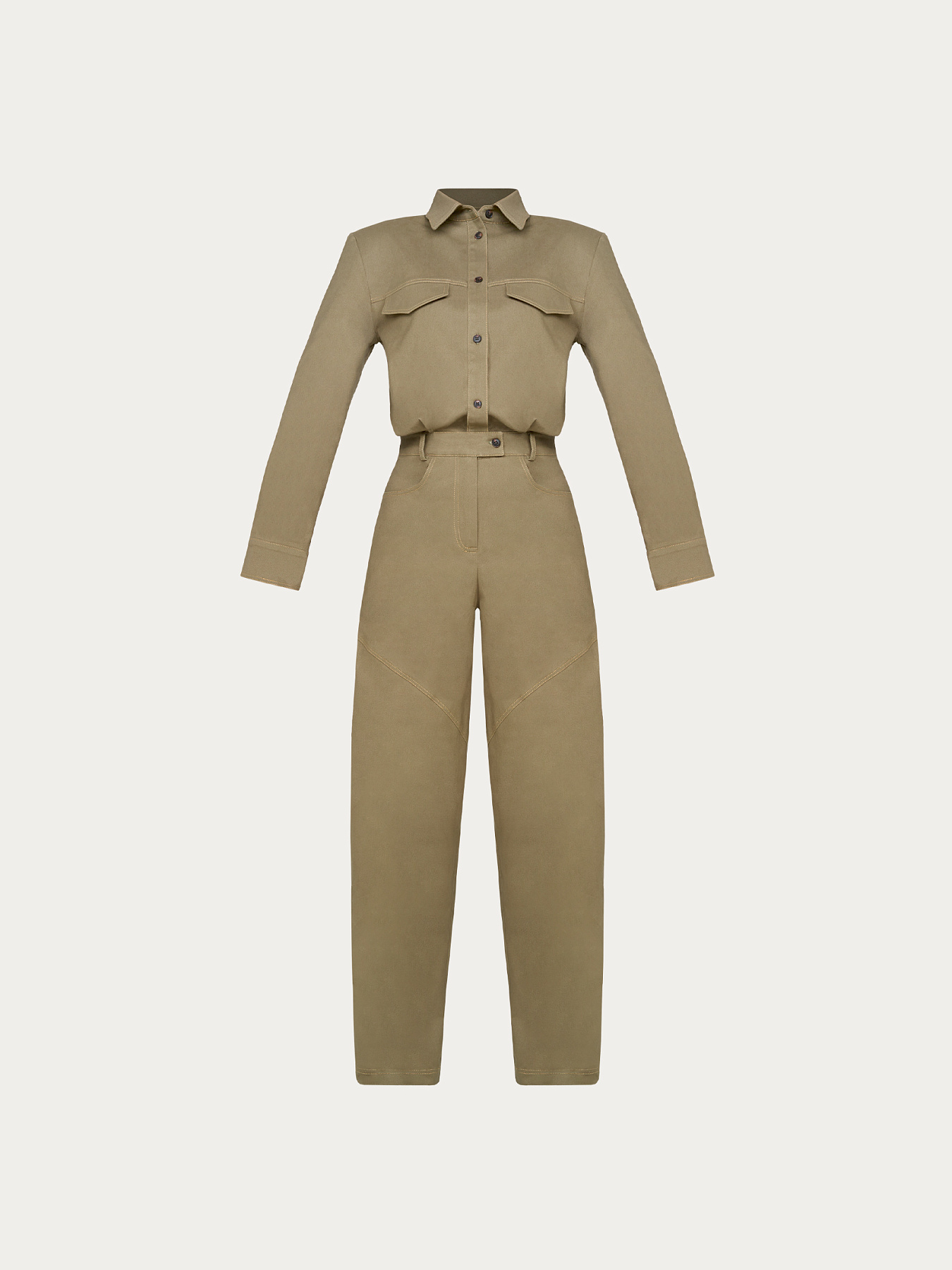 Комбинезон прямого силуэта, выполненный из плотного итальянского хлопка твилового переплетения, по фактуре напоминающего деним.