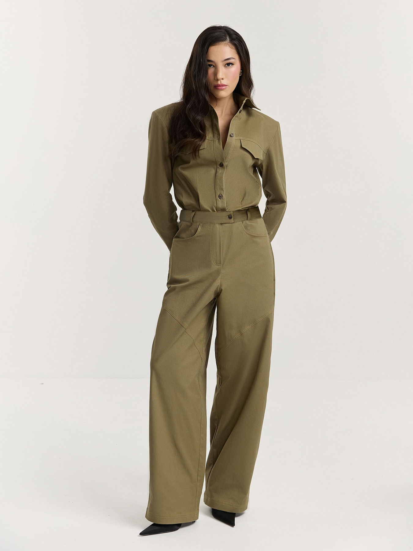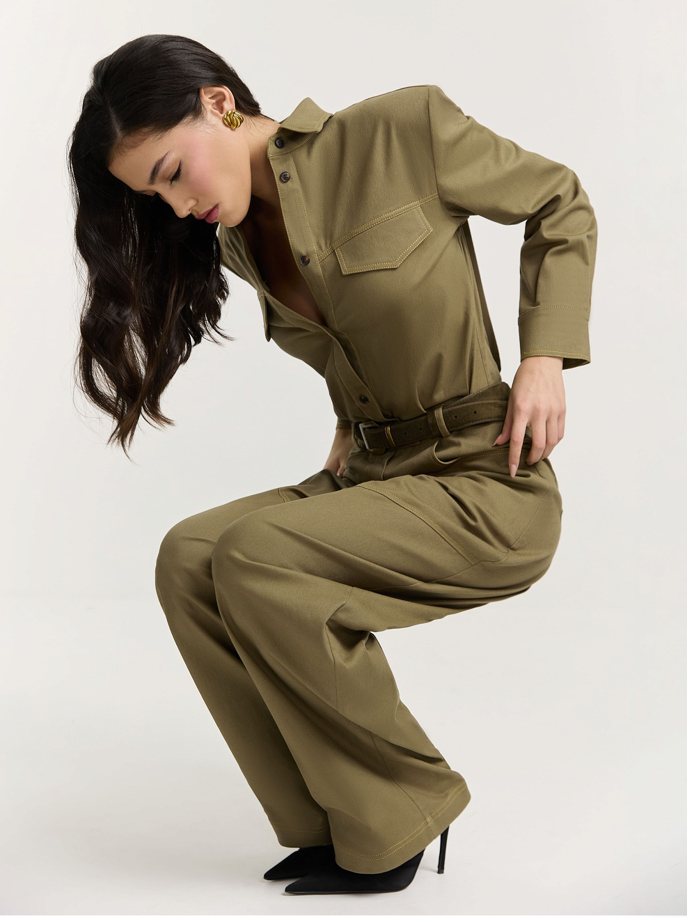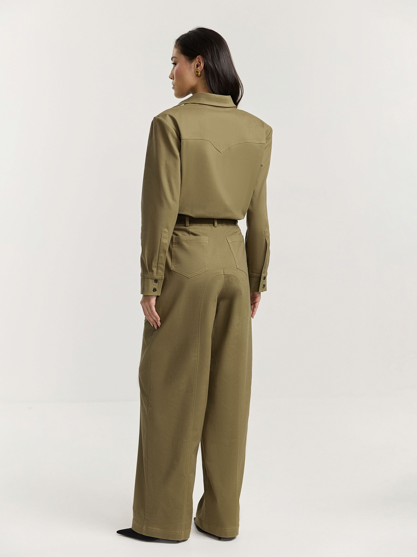 Комбинезон прямого силуэта, выполненный из плотного итальянского хлопка твилового переплетения, по фактуре напоминающего деним.