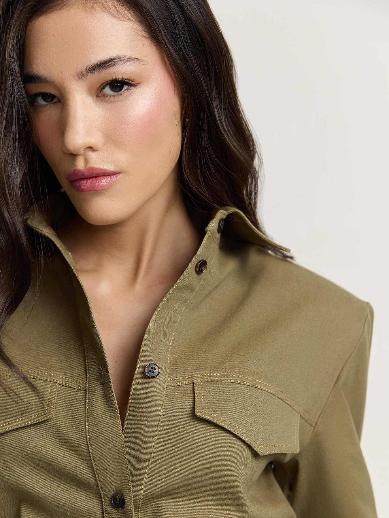 Верхняя часть выстроена на точной конструкции: фигурные кокетки на полочке и спинке, подплечники и защипы формируют выразительный объем и четкую линию плеч.