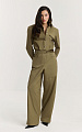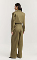 Талия оформлена отрезным поясом со шлевками для ремня. Нижняя часть выполнена в крое «бананы». Передние половинки с горизонтальной отрезной частью чуть выше уровня колена. Задние половинки с отрезной частью по всей длине в районе шагового шва.