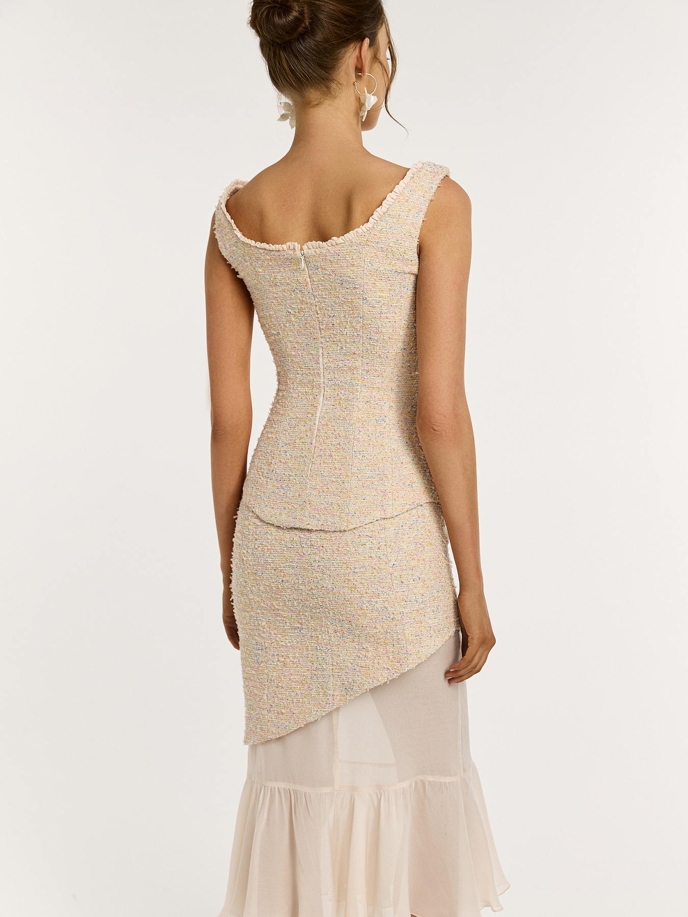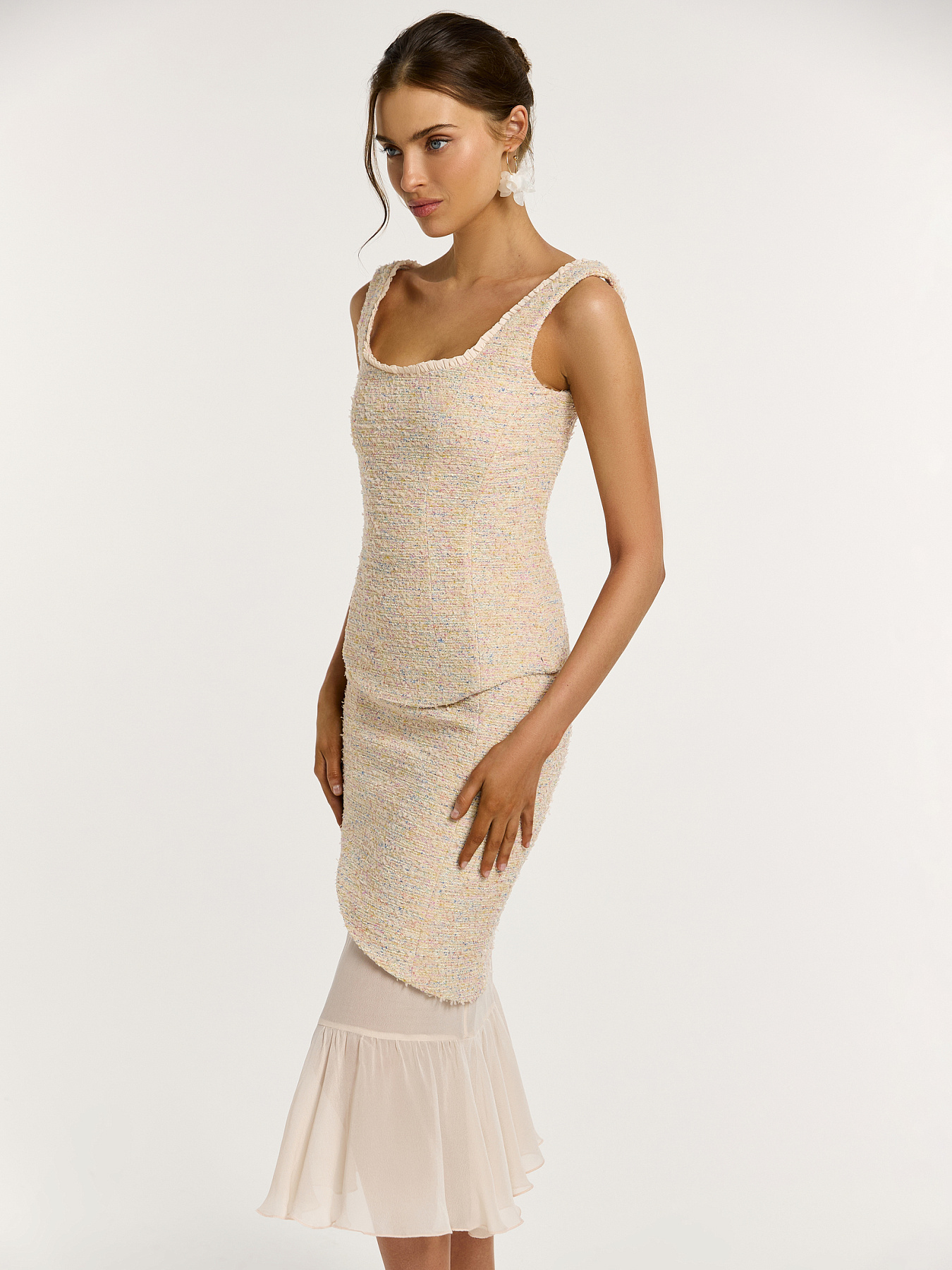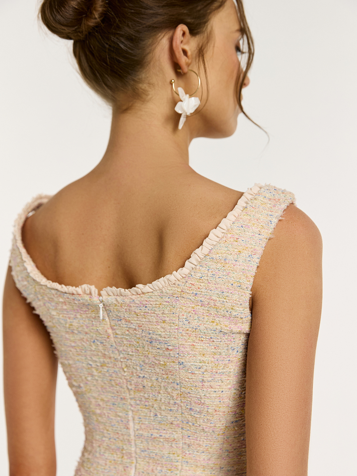 Корсет из фактурного итальянского твида в нежно-розовом оттенке — выразительная модель с тонкой игрой текстур.