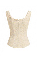 Удлиненный приталенный силуэт выстроен за счет вертикальных конструктивных швов, укрепленных регилином, что позволяет изделию сохранять четкую форму и подчеркивать талию: в боковых швах длина короче, чем по центру полочки и спинки. Линия горловины и спинки отделана шифоновой тесьмой, заложенной в мелкие складки — деликатная деталь смягчает фактуру твида, добавляет образу нежности и красиво подчёркивает область ключиц и спины. Корсет полностью выполнен на подкладке из мягкого штапеля, что обеспечивает комфорт и приятные тактильные ощущения.