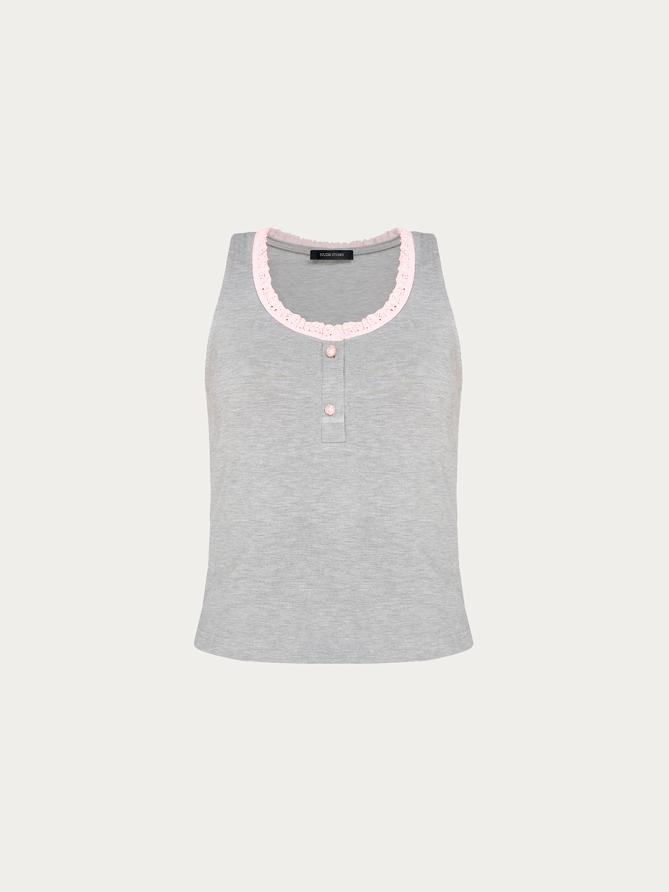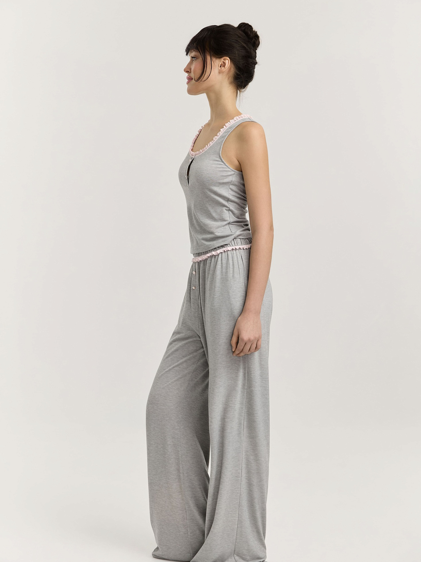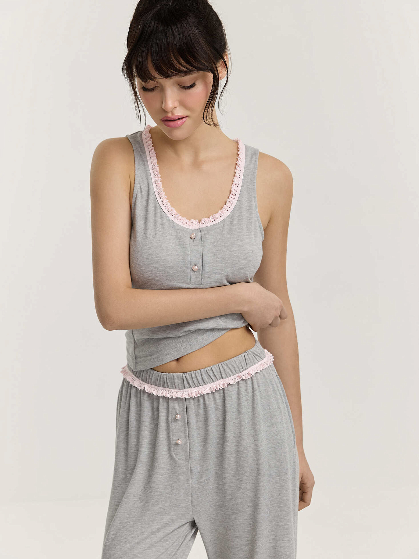 Глубокий круглый вырез горловины отделан кружевной хлопковой тесьмой в нежно-розовом оттенке, добавляющей деликатный акцент. Застежка-планка украшена двумя фигурными пуговицами на ножке в форме цветка.