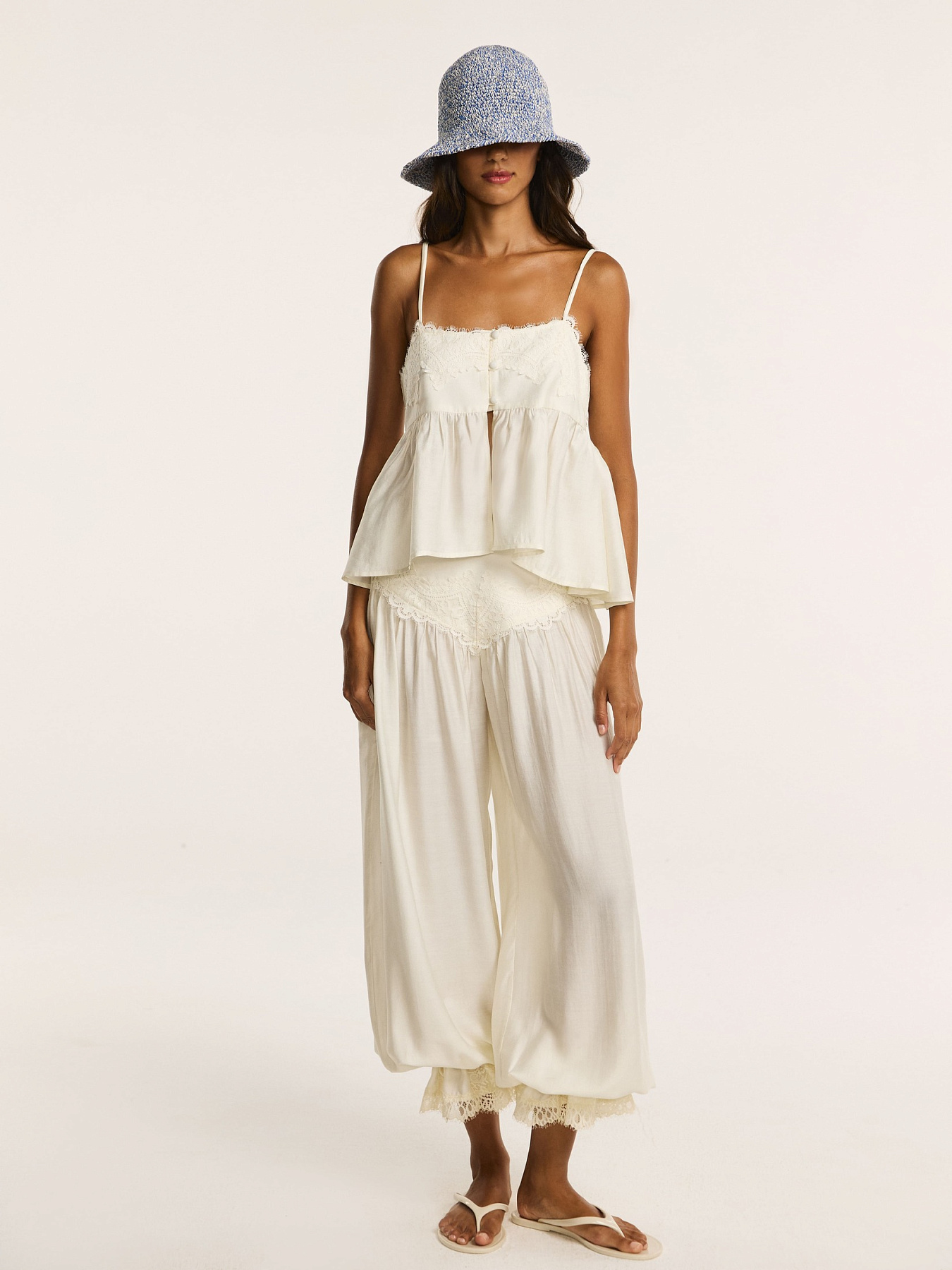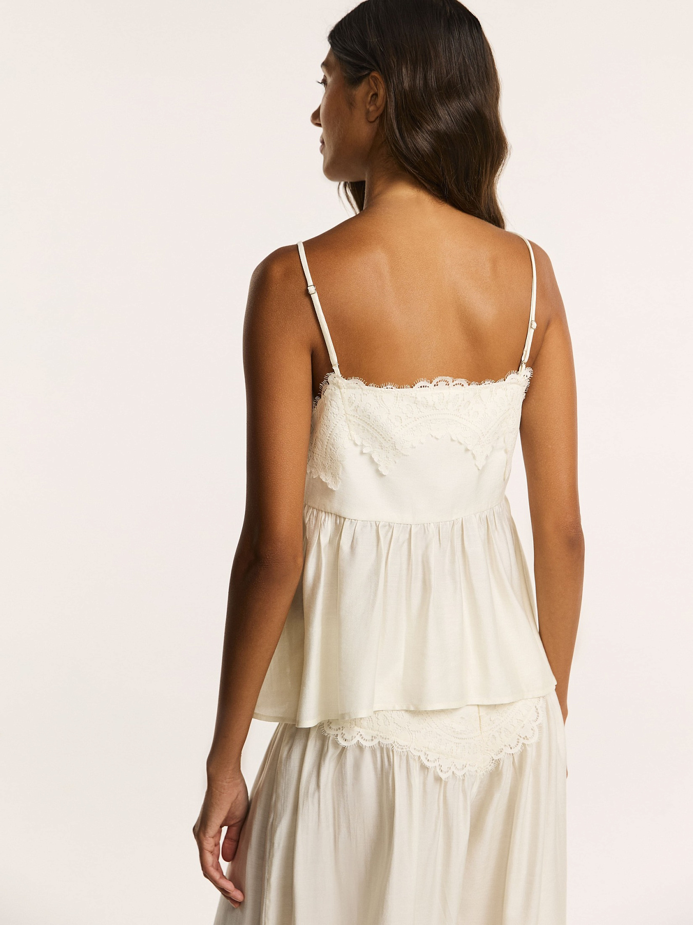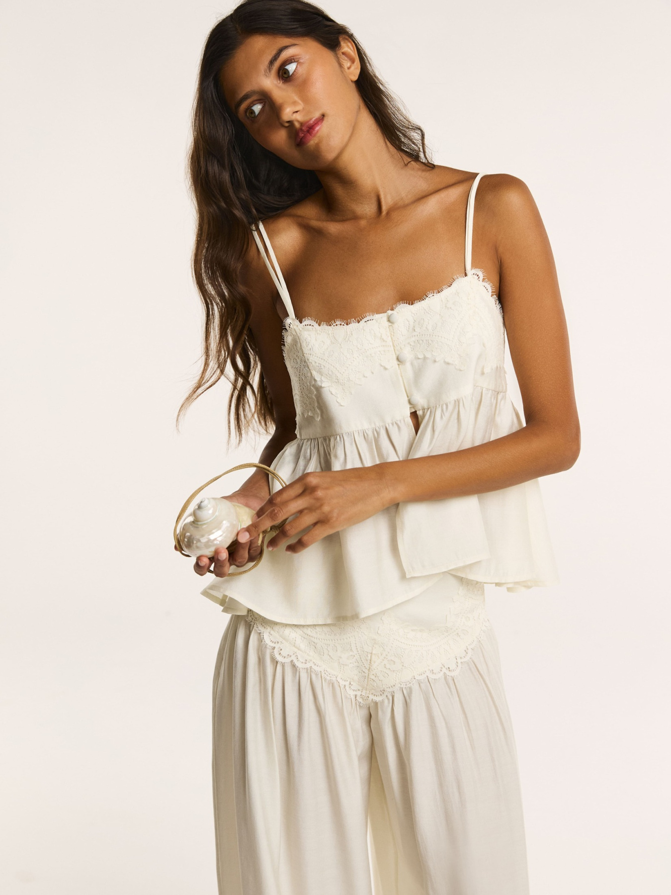 Топ из вискозы в молочном оттенке — утонченная модель, в которой мягкость силуэта сочетается с тонкой ручной работой и деликатной декоративностью.
