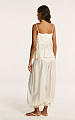 Нижняя часть собрана в мягкую сборку с деликатным расширением к низу, формируя воздушный, женственный объём. Фигурный нижний срез с удлиненными боковыми линиями придает пластичность.