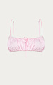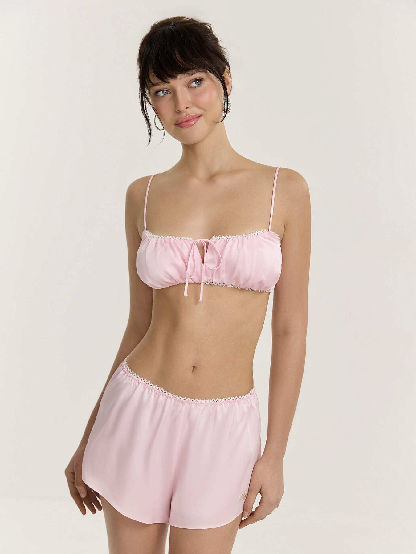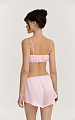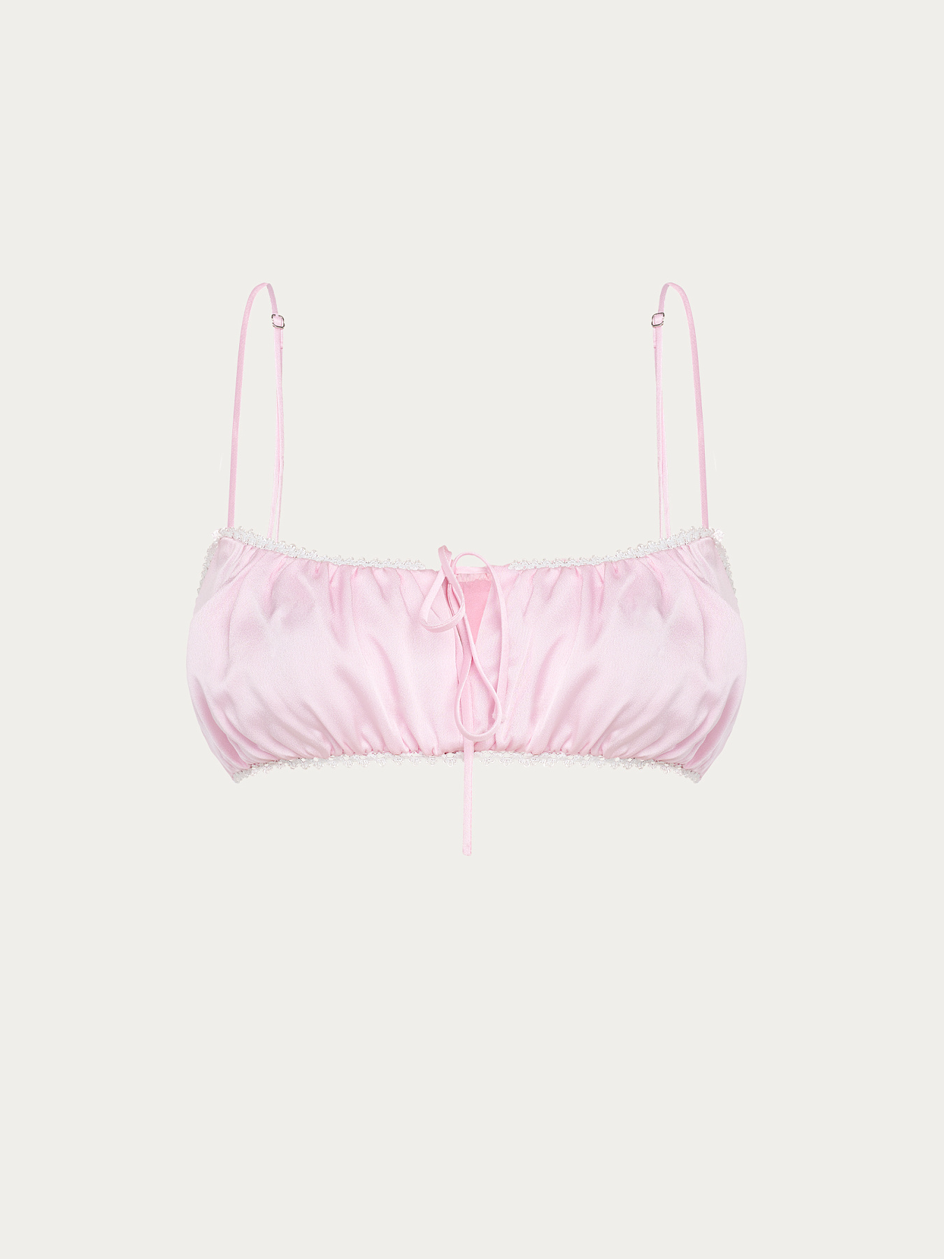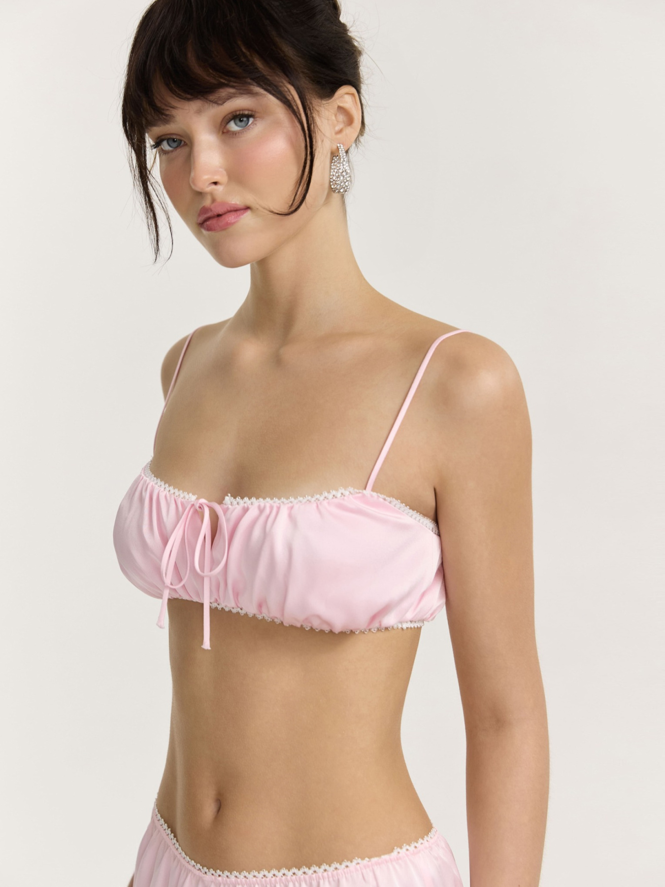 Бельевой топ из итальянской вискозной кади в нежно-розовом оттенке. Отрезной двойной лиф собран на бельевую резинку с кружевным краем в контрастном белом цвете — благодаря этому появляются мягкие вертикальные складки и аккуратная посадка.
