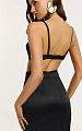 Модель выполнена из атласной вискозы с характерным деликатным блеском и шелковистой гладкой фактурой. Ткань красиво отражает свет, подчеркивая глубину цвета, и мягко облегает фигуру, создавая безупречно чистую линию силуэта.