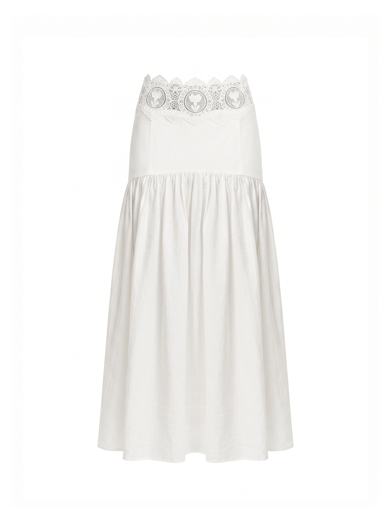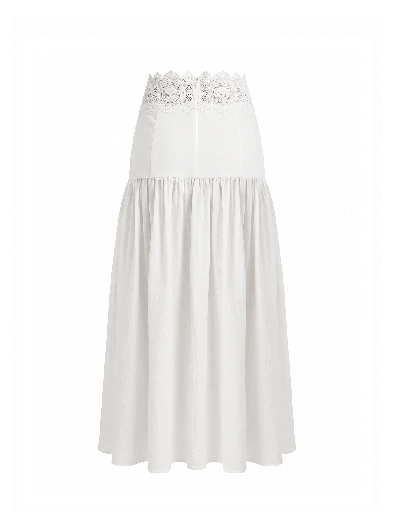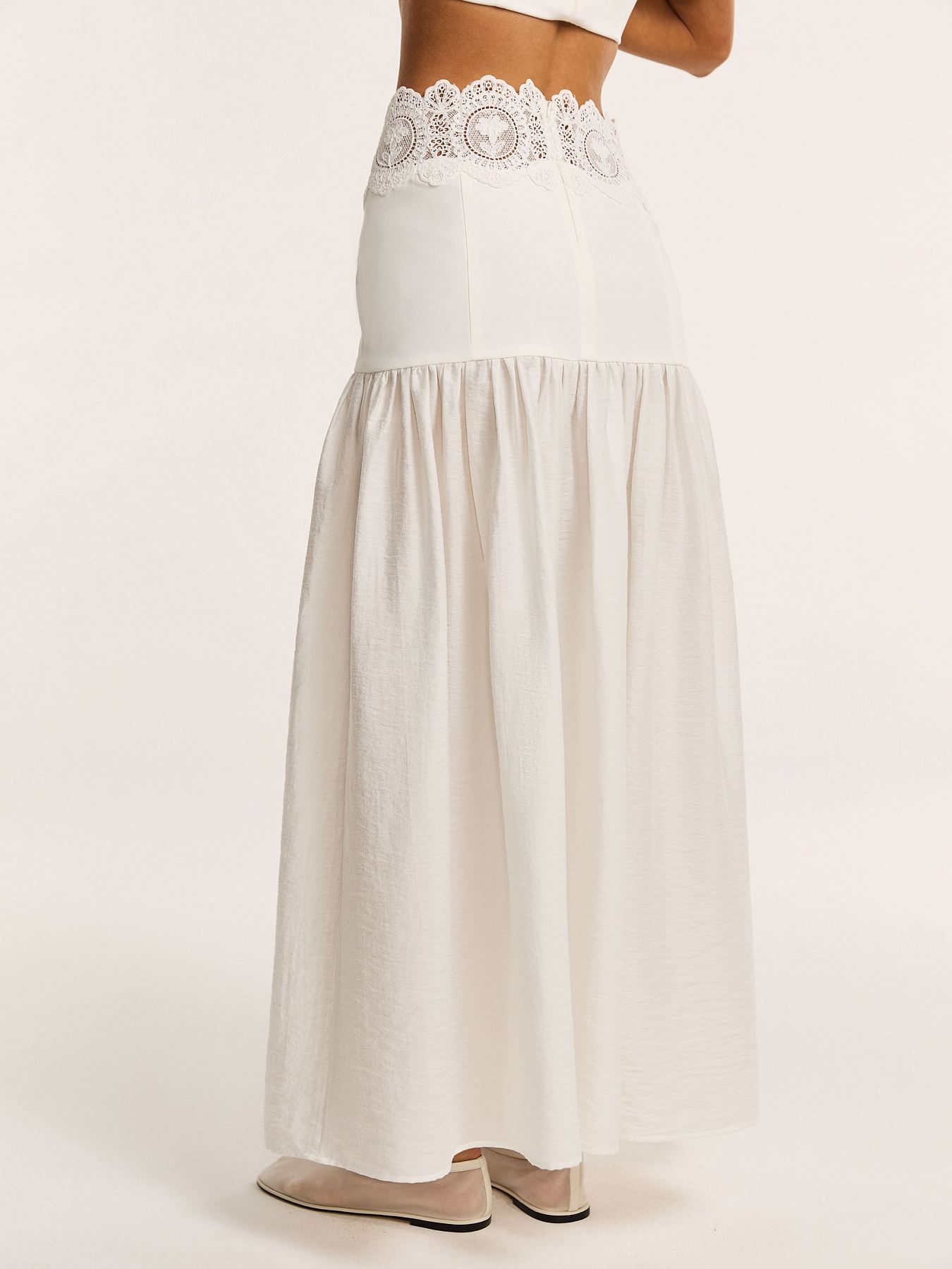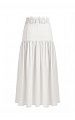 Юбка макси А-силуэта в молочном оттенке — утонченная модель, в которой архитектурная четкость сочетается с воздушностью фактуры и тонкой декоративной работой.