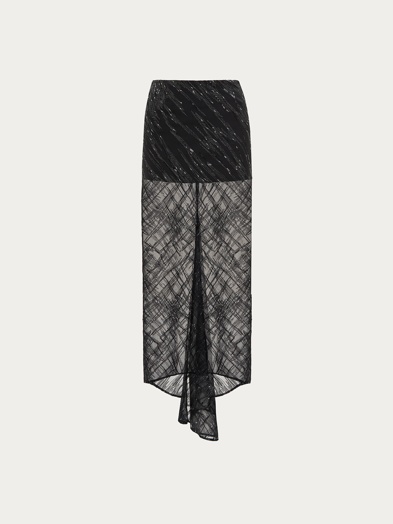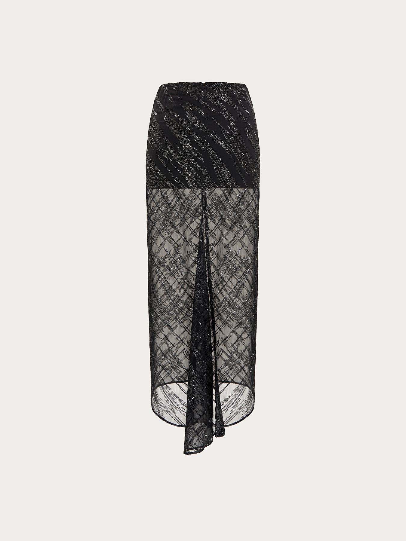 Юбка макси со шлейфом из полупрозрачного шифона, расшитого пайетками. Уникальная ткань, созданная на итальянской фабрике эксклюзивно для этой коллекции, придает изделию изысканность и чарующую легкость.