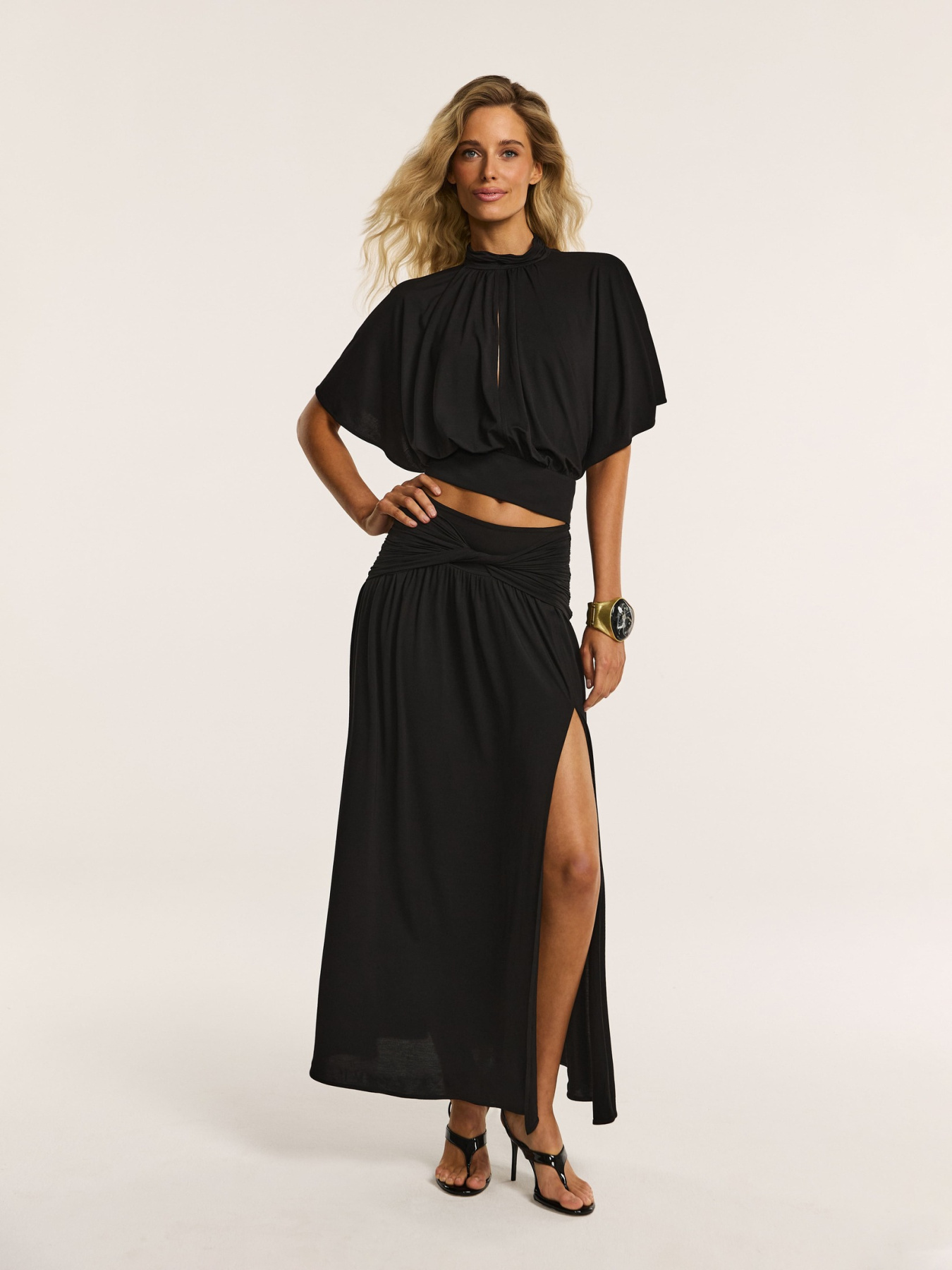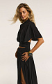 Средняя посадка обеспечивает комфорт и естественность силуэта, а отрезной пояс, дополненный драпировкой с перекрутом, становится выразительным акцентом модели.