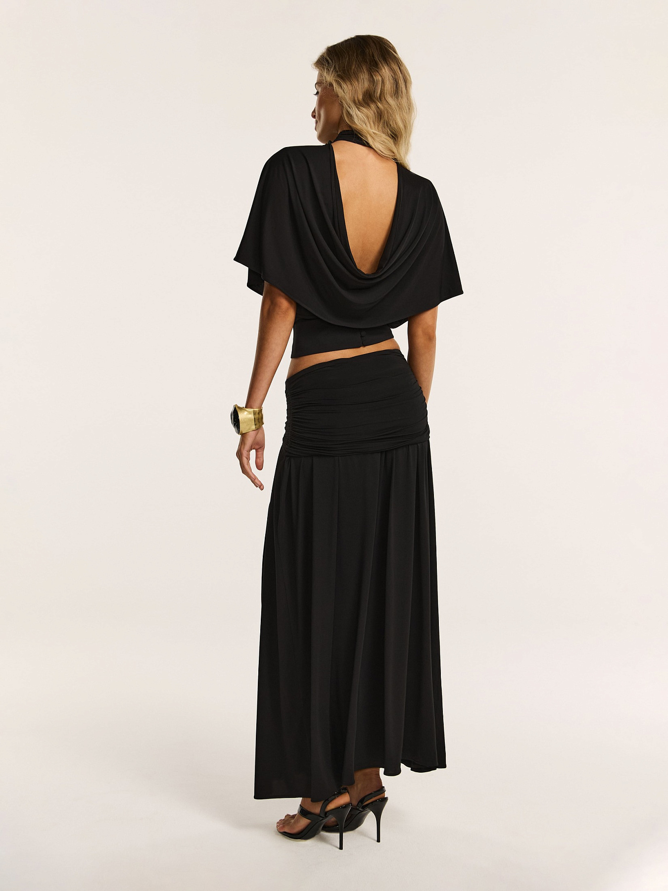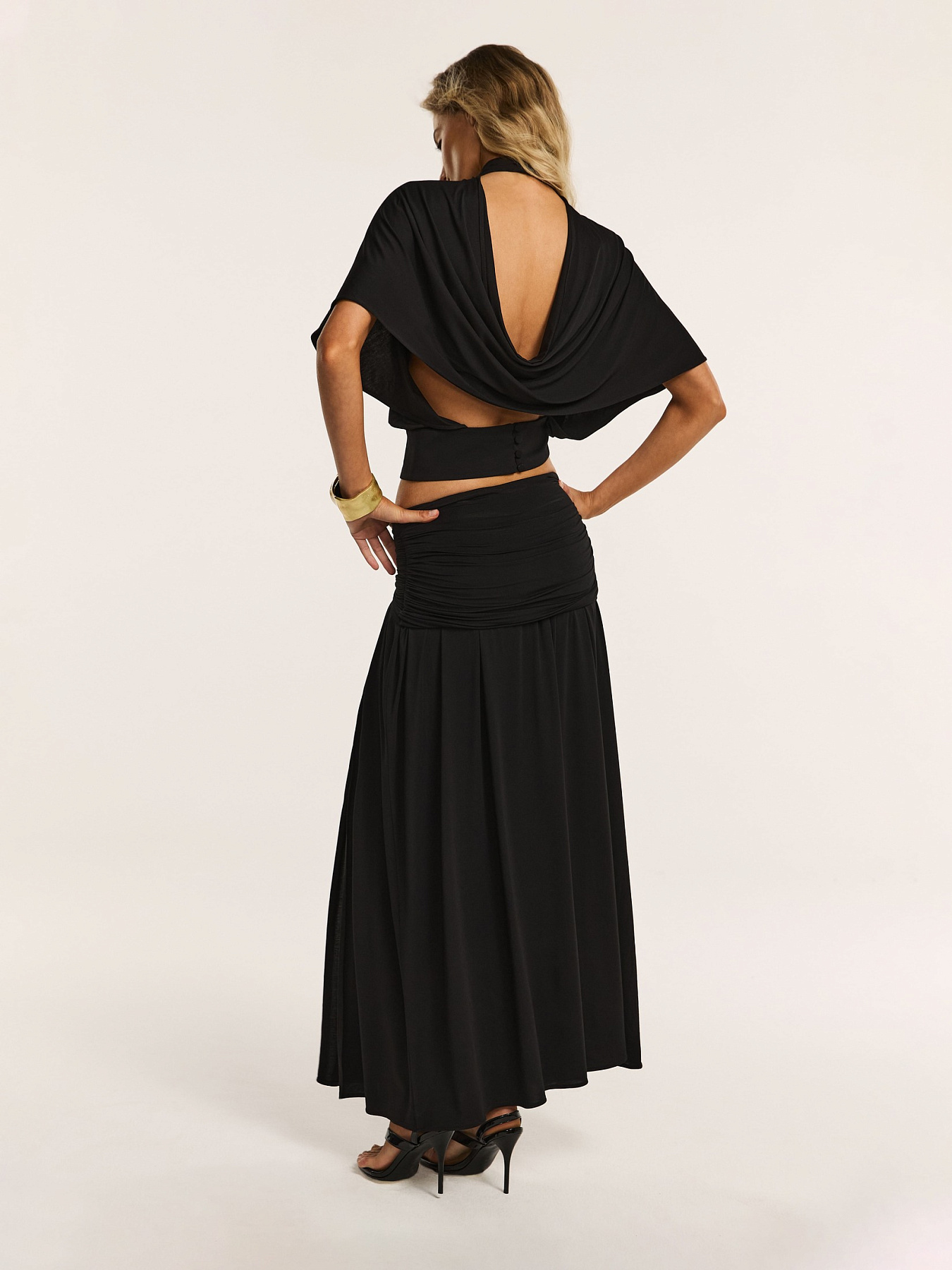 Юбка макси из итальянского вискозного трикотажа в черном оттенке — элегантная модель, в которой мягкая пластика ткани сочетается с утонченной драпировкой и благородным сиянием.