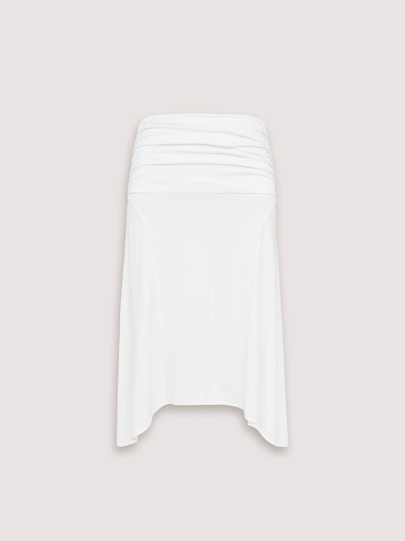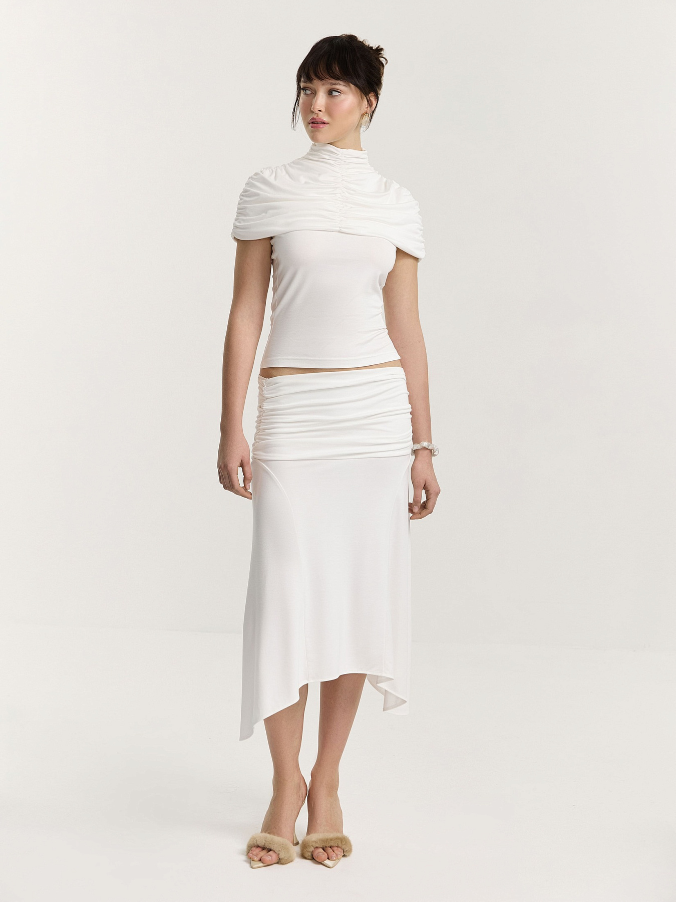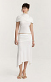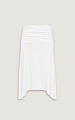 Юбка из итальянского вискозного трикотажа в молочном оттенке. Длина до колена и силуэт трапеция создают легкую, плавную линию, которая красиво раскрывается в движении.