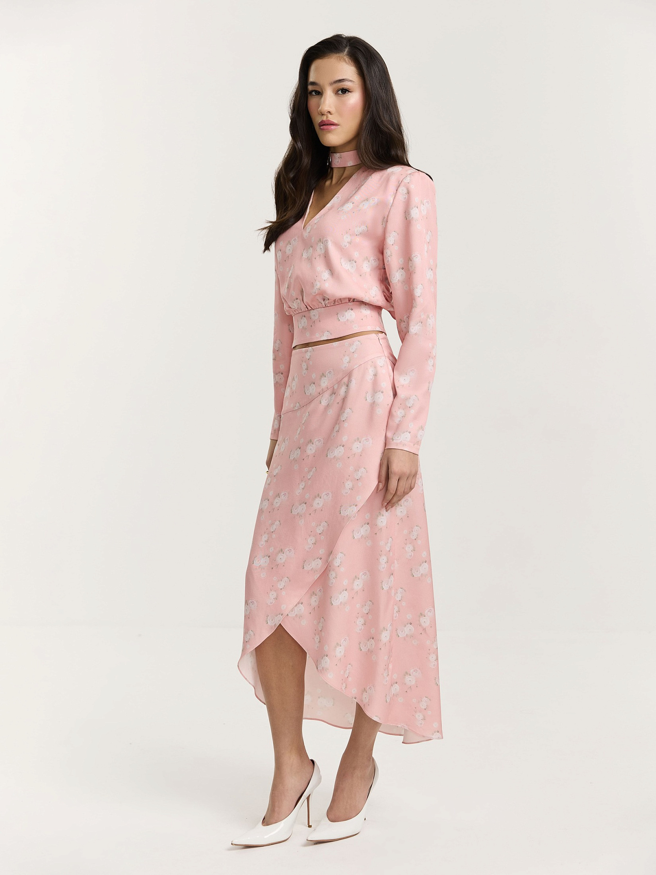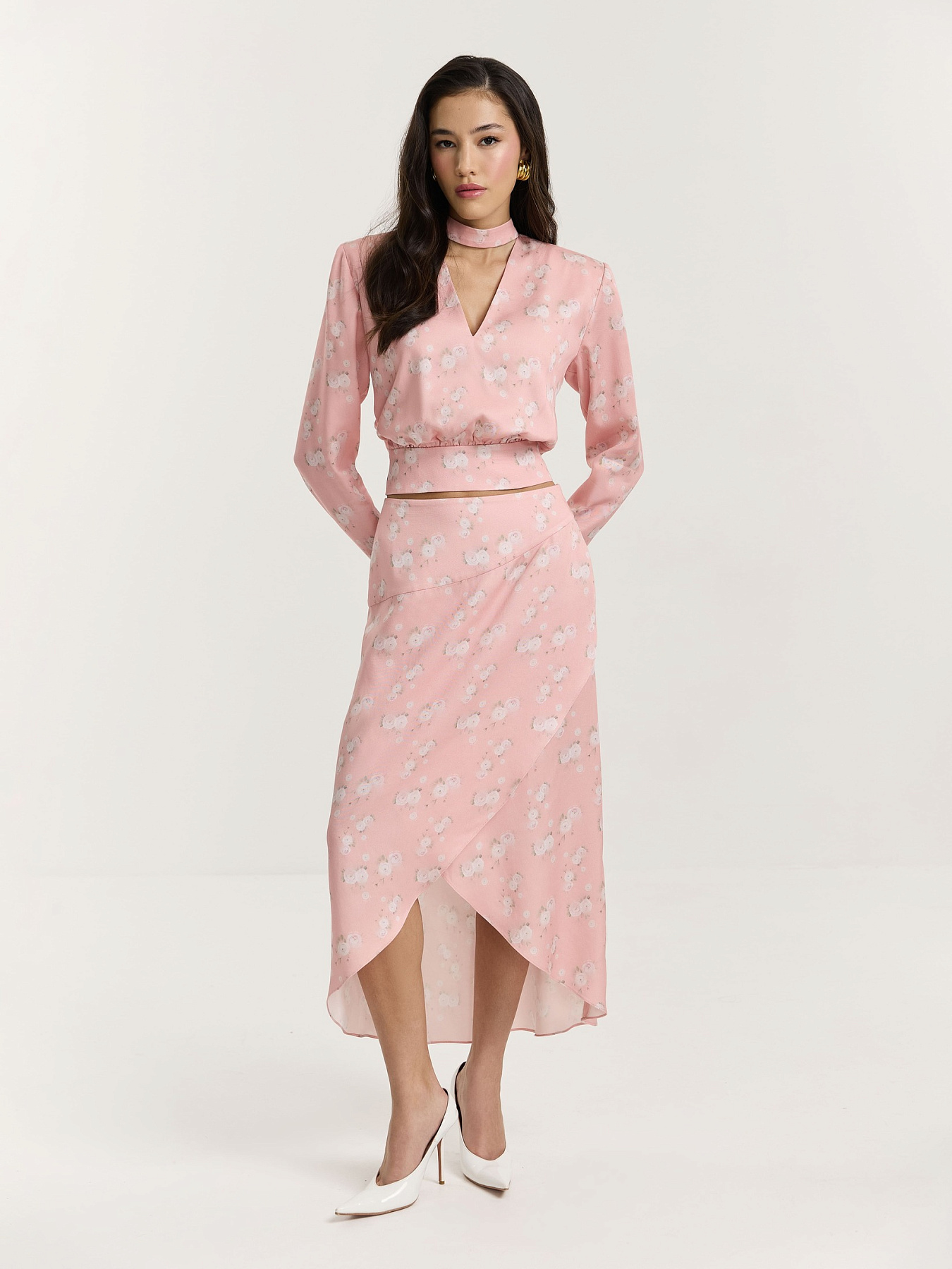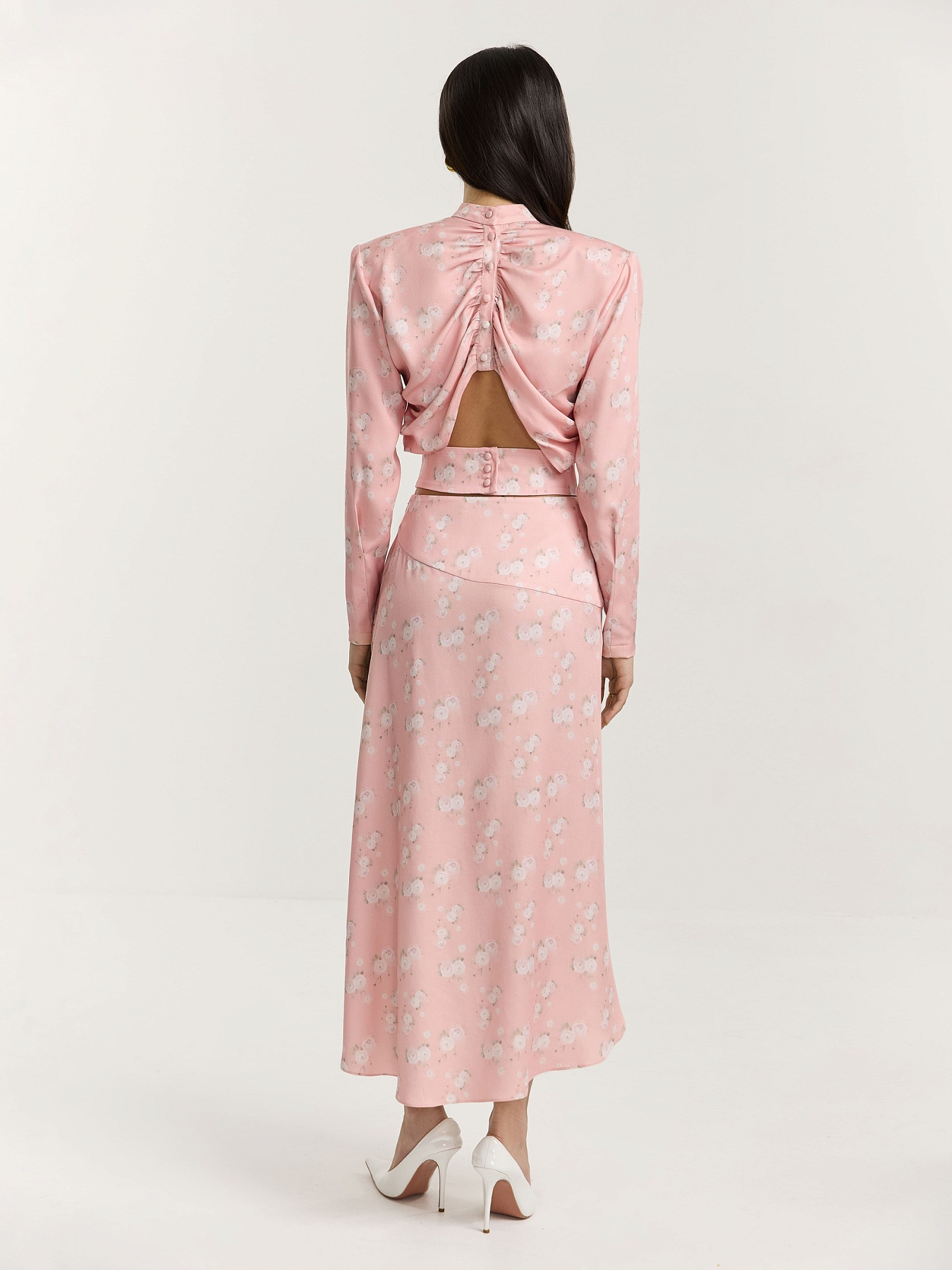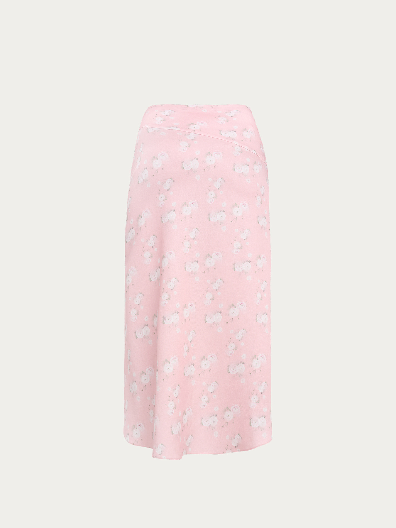 Юбка из принтованной вискозы в нежно-розовом оттенке. На фоне — молочные ранункулюсы, хаотично рассыпанные по полотну. Принт создан специально для этой коллекции нашим графическим дизайнером.