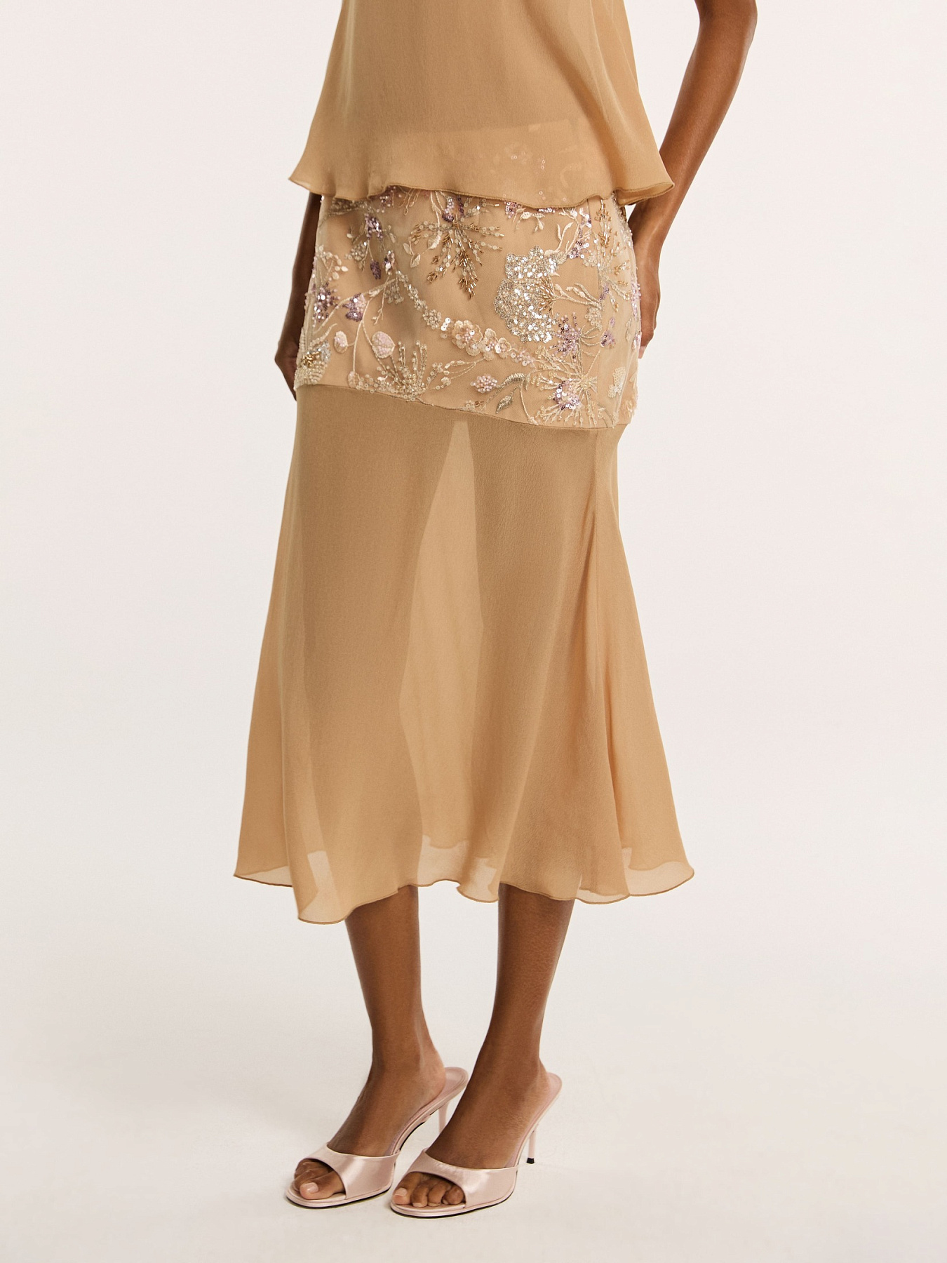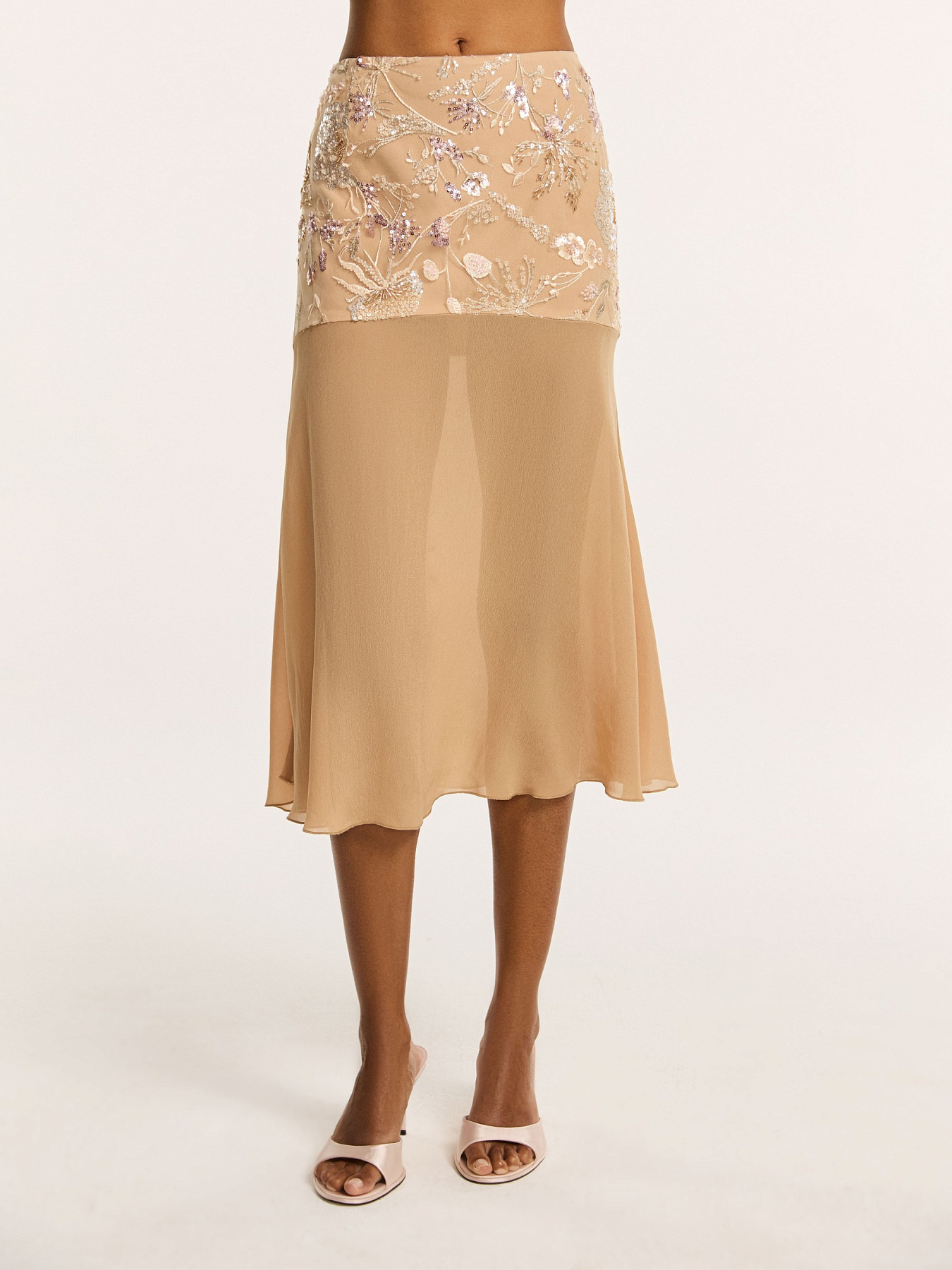 Юбка средней длины в бежевом оттенке — модель с акцентом на ручную вышивку и лёгкость силуэта.
