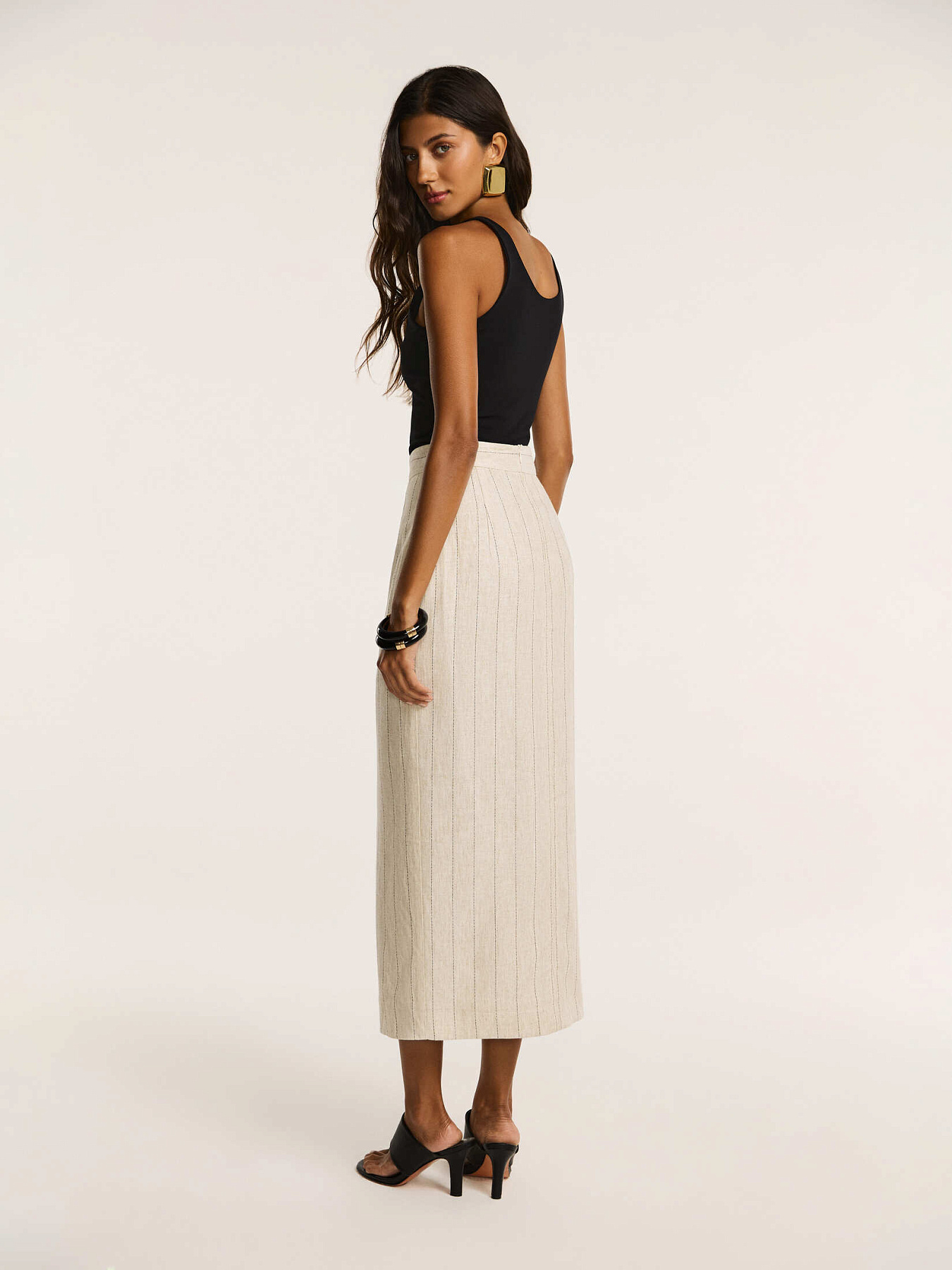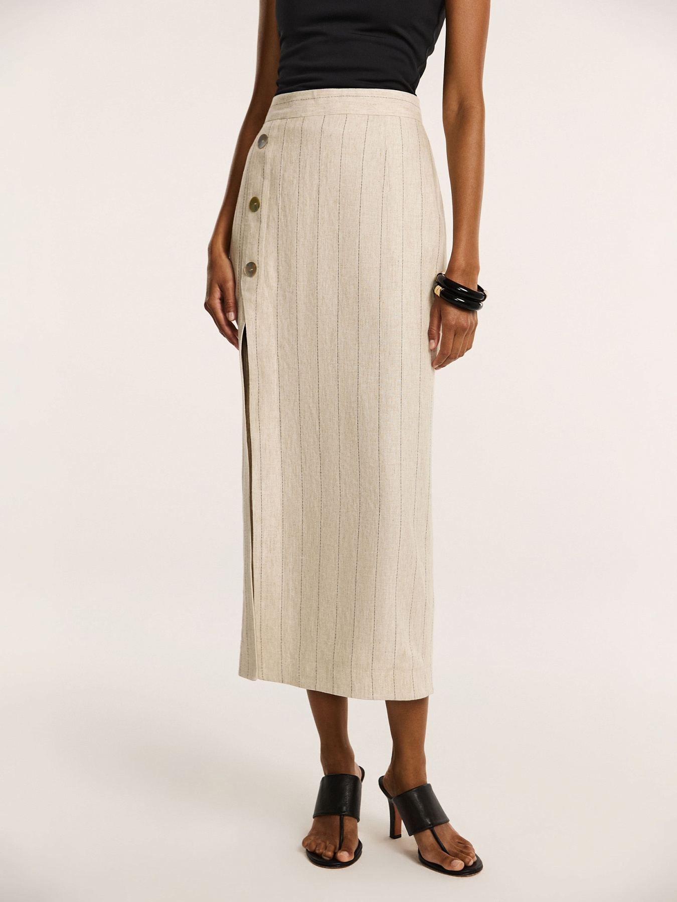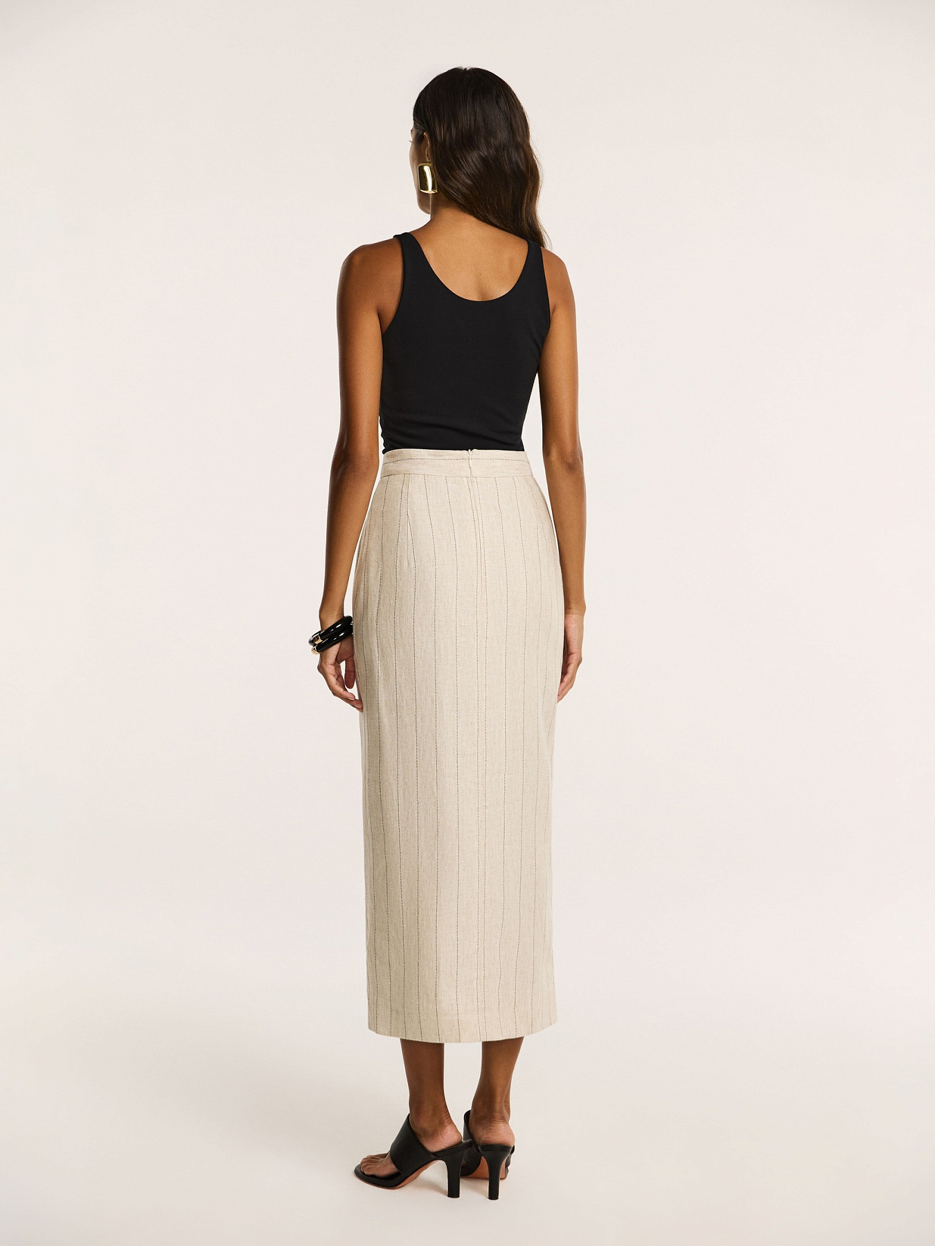 Юбка-карандаш прилегающего силуэта длины миди в благородном бежевом оттенке в полоску — утонченная модель с акцентом на чистоту линий и безупречную посадку.
