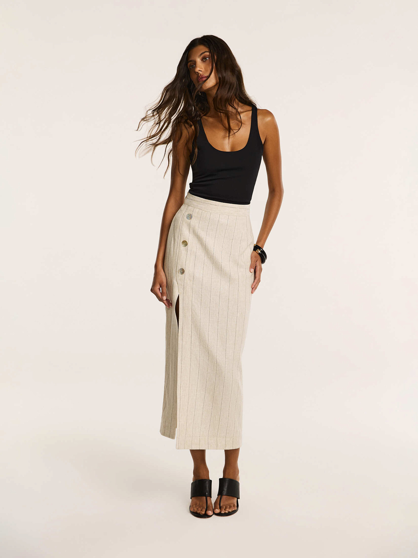 Спереди — имитация запаха с акцентными пуговицами из натуральной ракушки с деликатным перламутровым переливом. Этот элемент переходит в разрез, изящно открывающий правую ногу и добавляющий образу динамику.