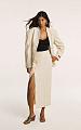 Модель выполнена из итальянского льна с добавлением вискозы: ткань средней плотности хорошо держит форму, формируя четкий силуэт с мягкими линиями.