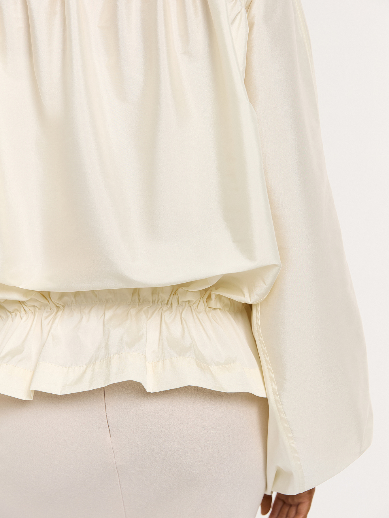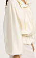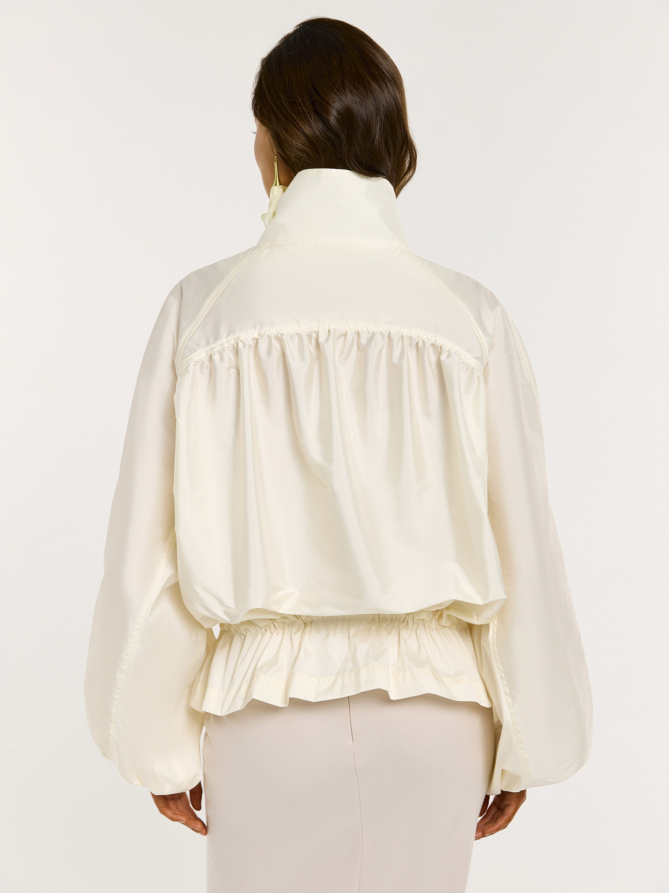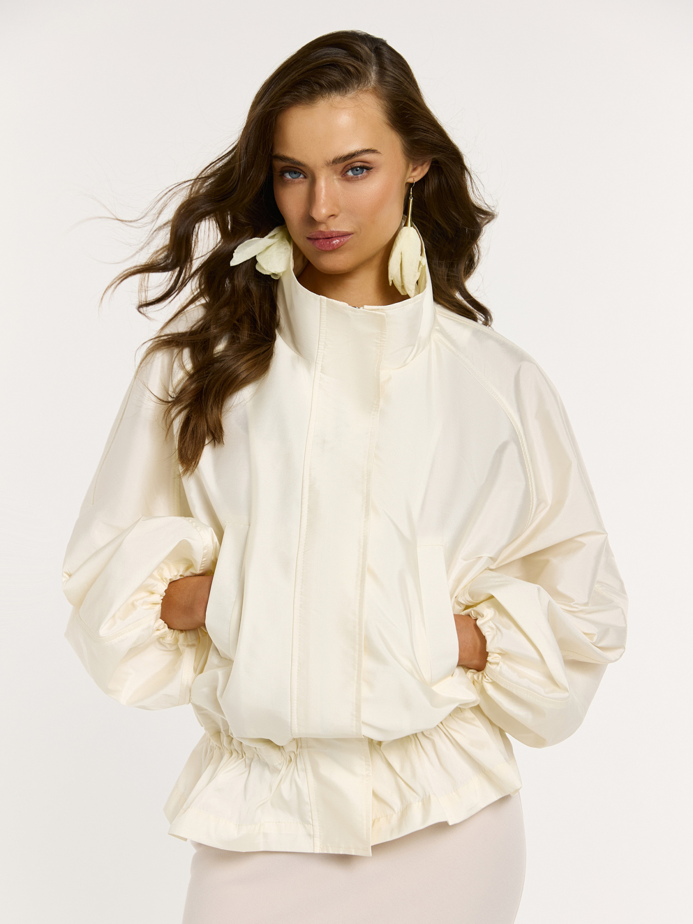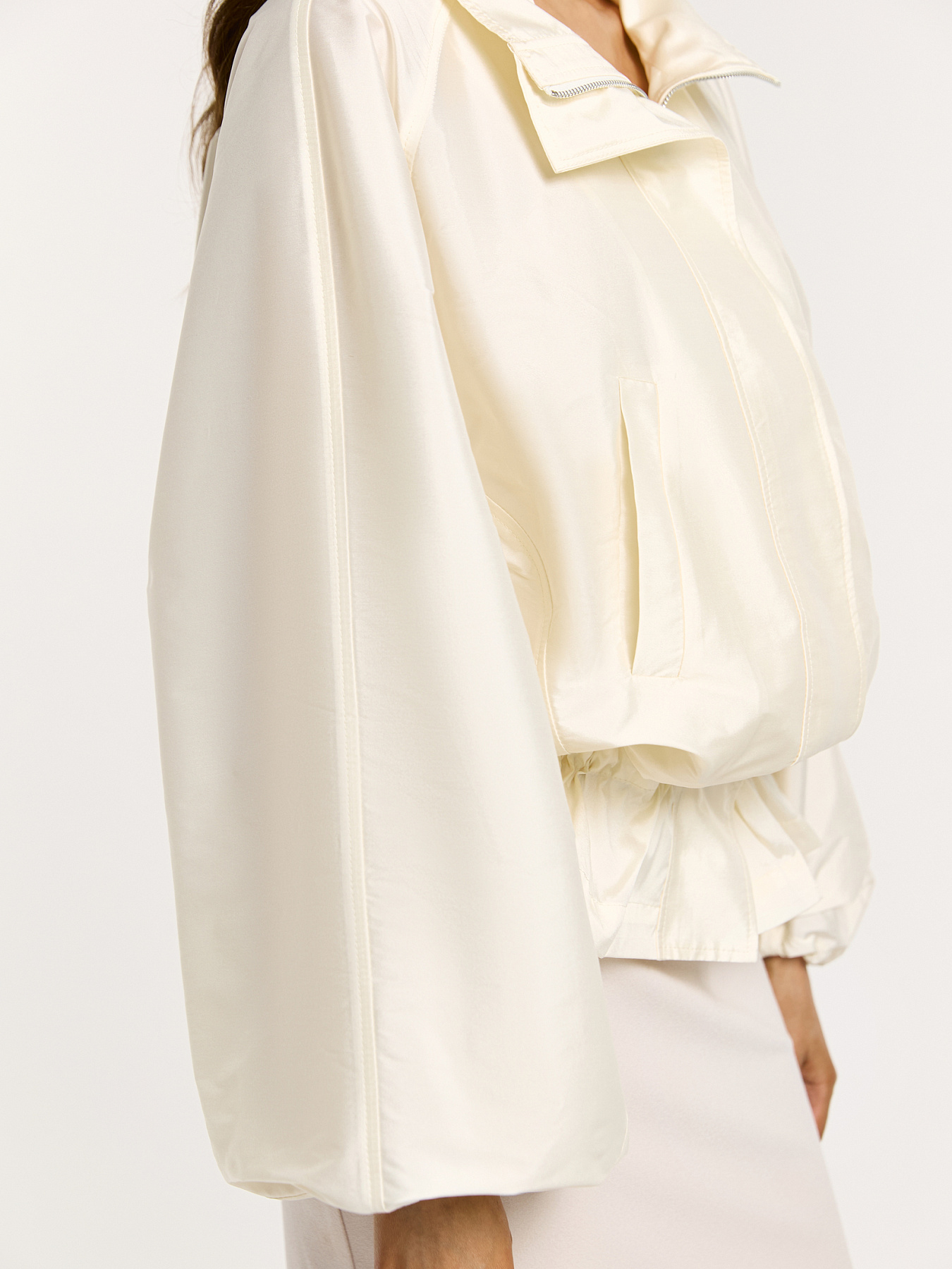 Куртка в сливочном цвете с перламутровым блеском выполнена из легкой смесовой ткани с деликатным жатым эффектом. Материал держит форму, создавая выразительный силуэт, оставаясь воздушным и комфортным в носке.