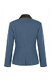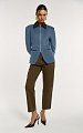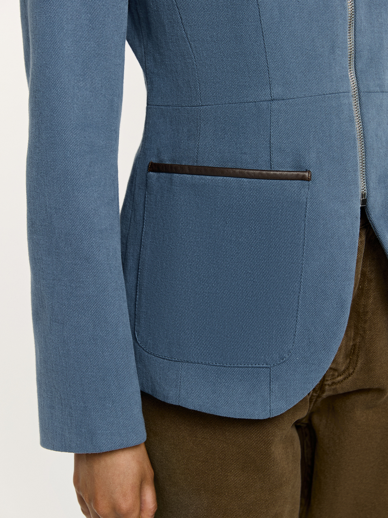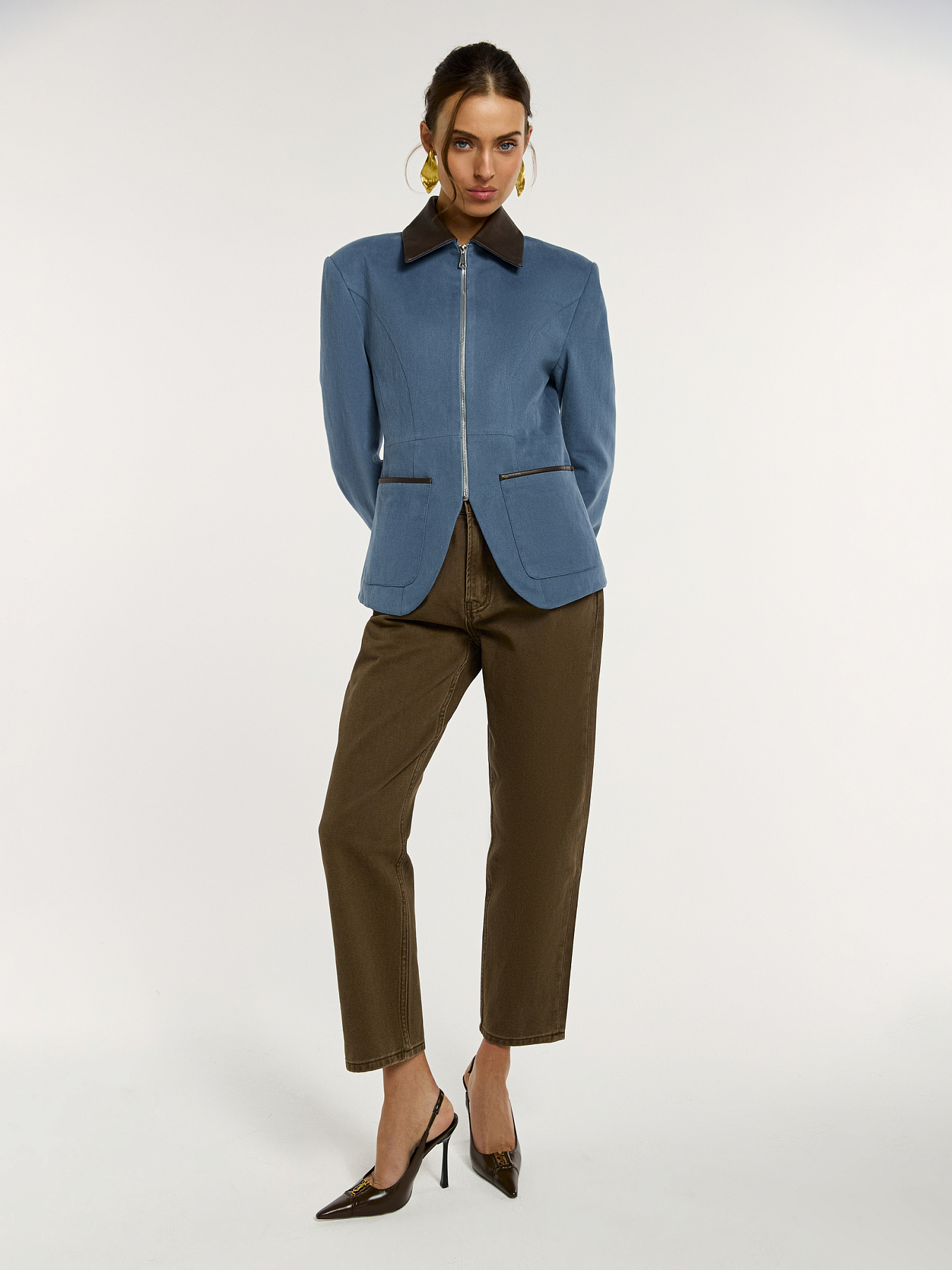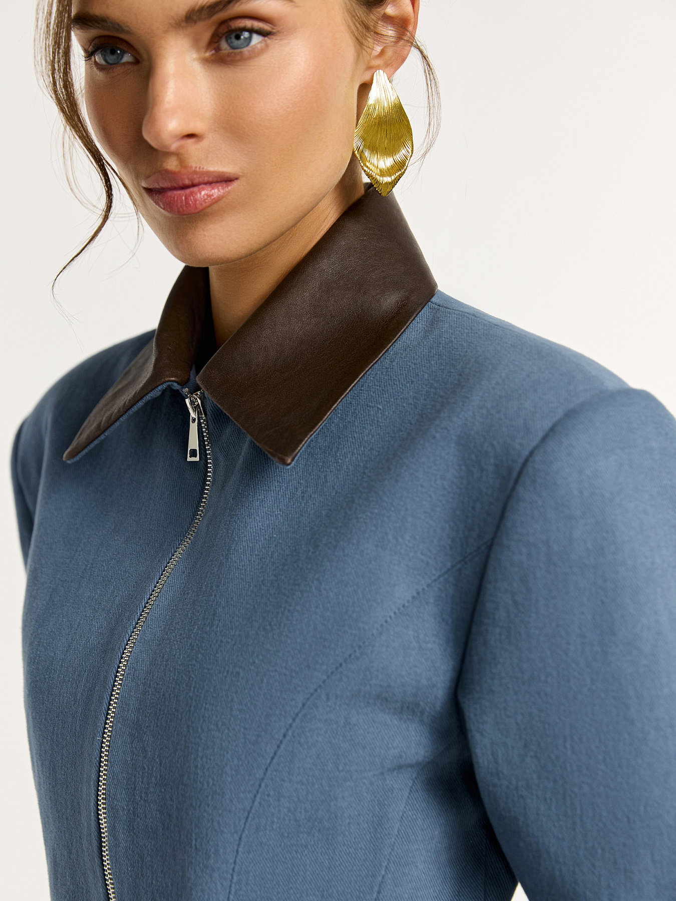 Выполнена из плотного хлопкового денима с мягким велюровым эффектом. Бархатистая фактура красиво держит форму и подчеркивает четкость линий. Отложной воротник на стойке дополнен отделкой из натуральной кожи в шоколадном оттенке: внешняя часть и стойка создают выразительный контраст. Линия плеч акцентирована подплечниками, формируя структурный силуэт.