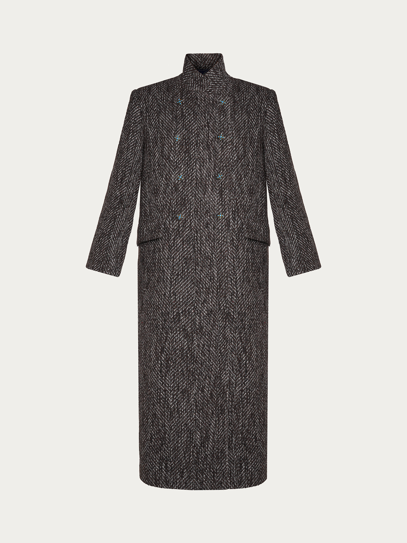 Пальто макси из итальянской шерстяной ткани с выразительной фактурой в елочку. Глубокий коричневый оттенок с белыми вкраплениями подчеркивает текстуру материала, а объемный крой и акцентированная линия плеч формируют чистый, графичный силуэт.